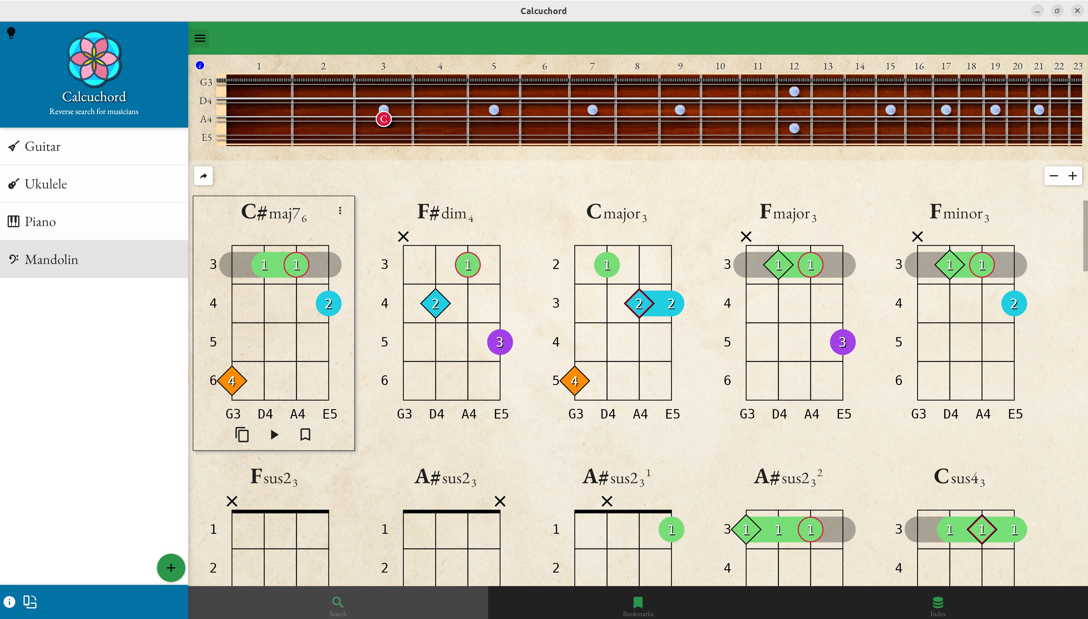 Reverse search tool for musicians. Helps you write or translate songs to other instruments or tunings.