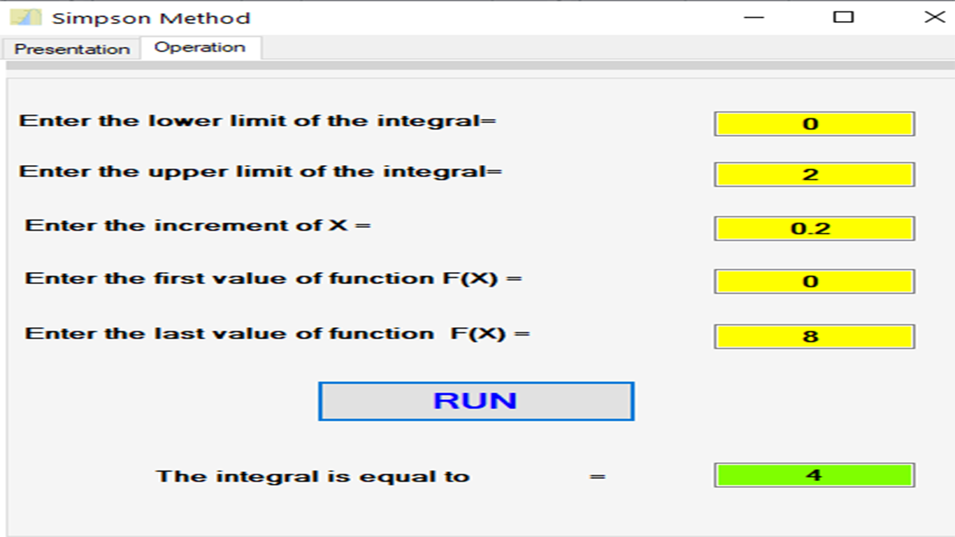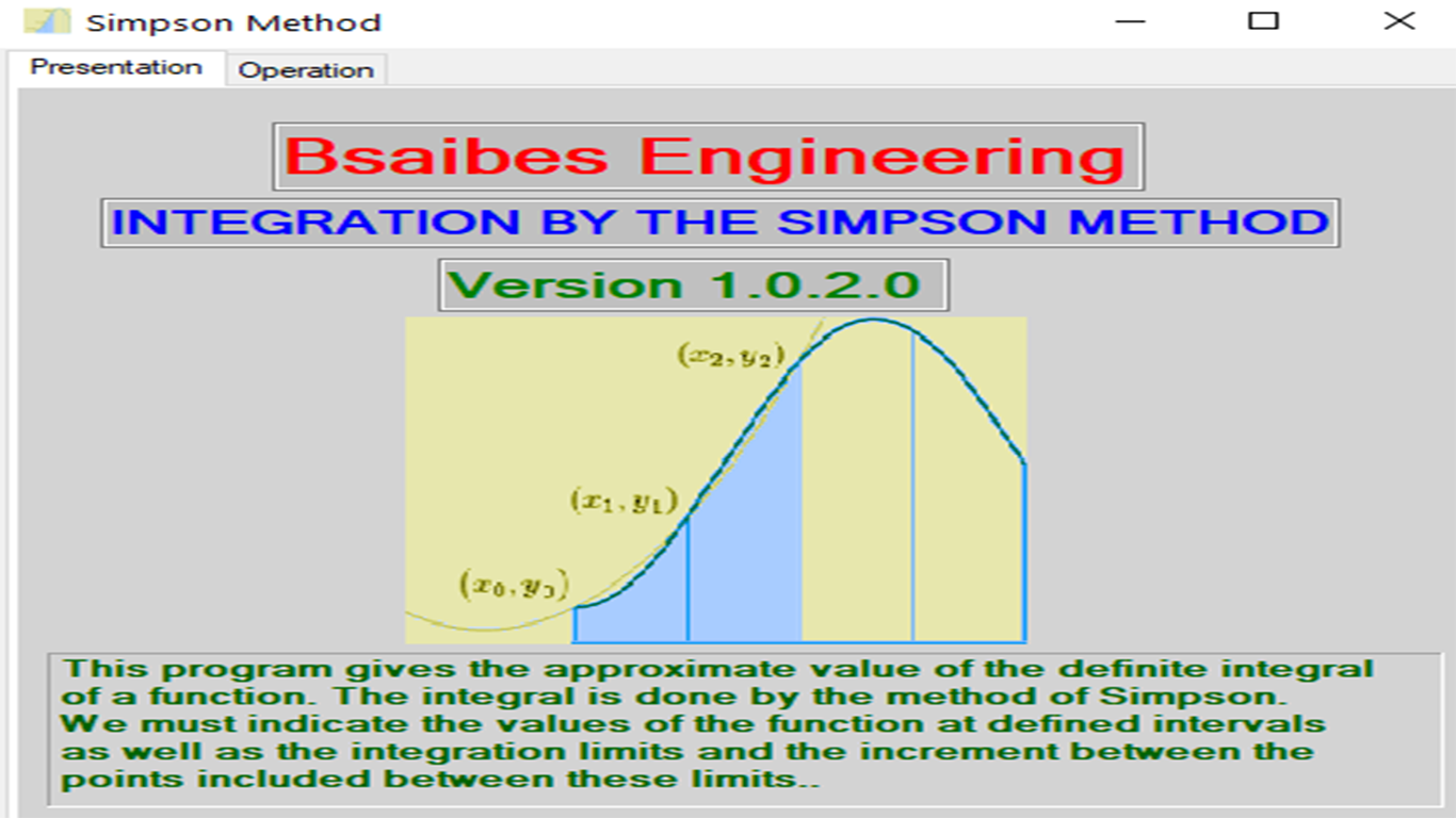 This program gives the approximate value of the definite integral of a function. The integral is done by the method of Simpson. We must indicate the values of the function at defined intervals as well as the integration limits and the increment between the points included between these limits..