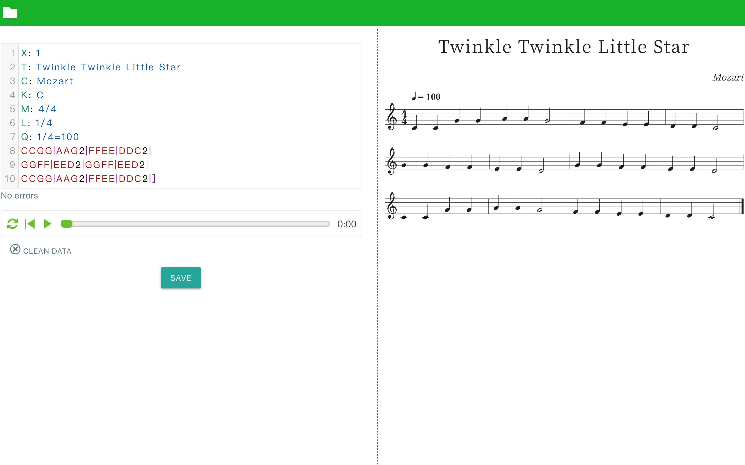 Staff Editor input notes in the form of ABC Notation, and instantly see the sheet music being rendered.