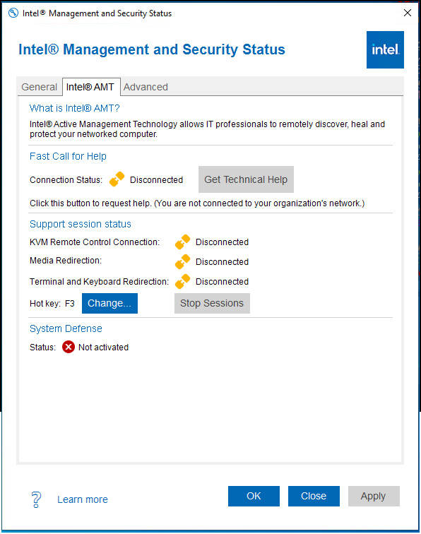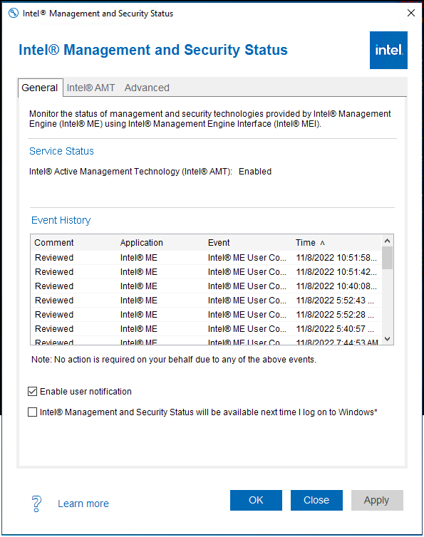 "The Intel® Management and Security Status icon indicates whether Intel® Active Management Technology, Intel® Standard Manageability and Intel® Anti-Theft Technology are running on the platform. The icon is located in the notification area. By default, each time Windows* starts, Intel® Management and Security Status application starts and the notification icon is displayed."