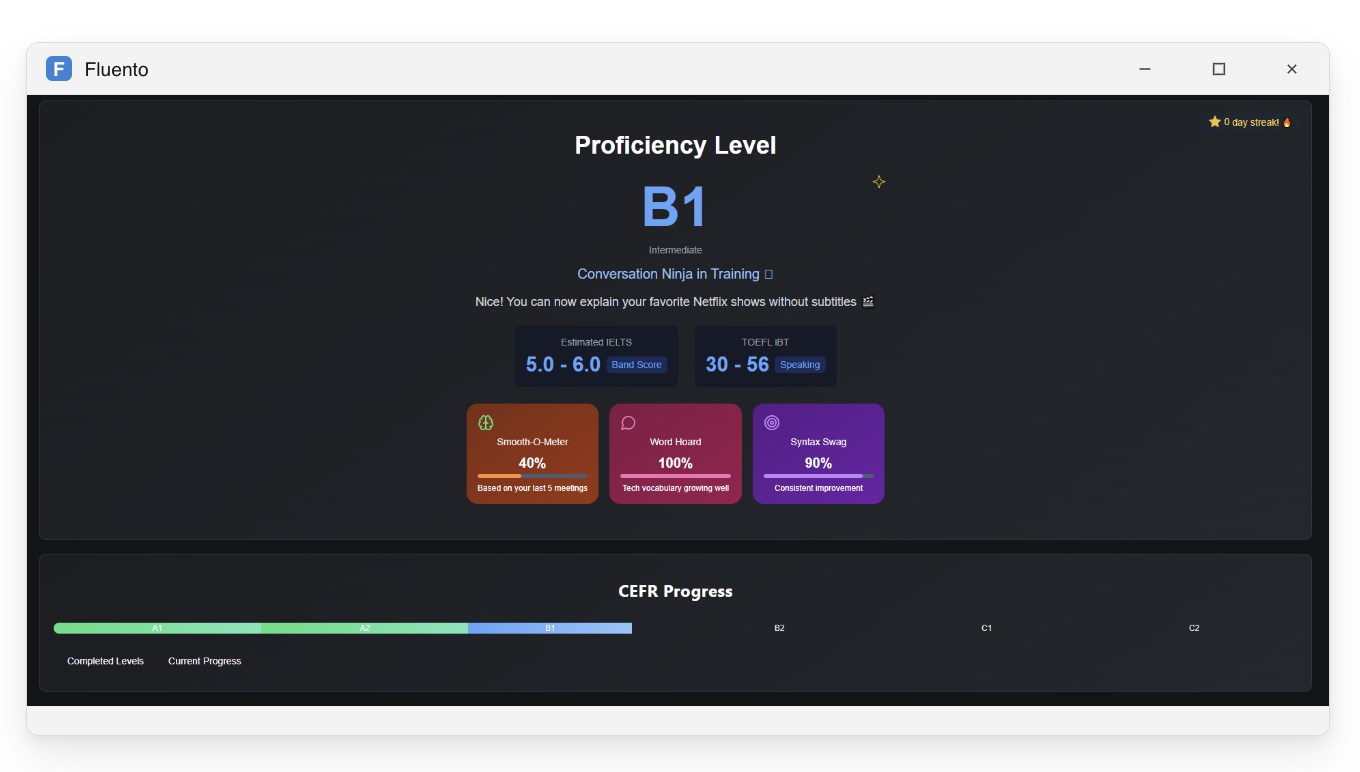 Measure your fluency, vocabulary and grammar. Fluento listens to every meeting - and tells you how you\'re doing.
