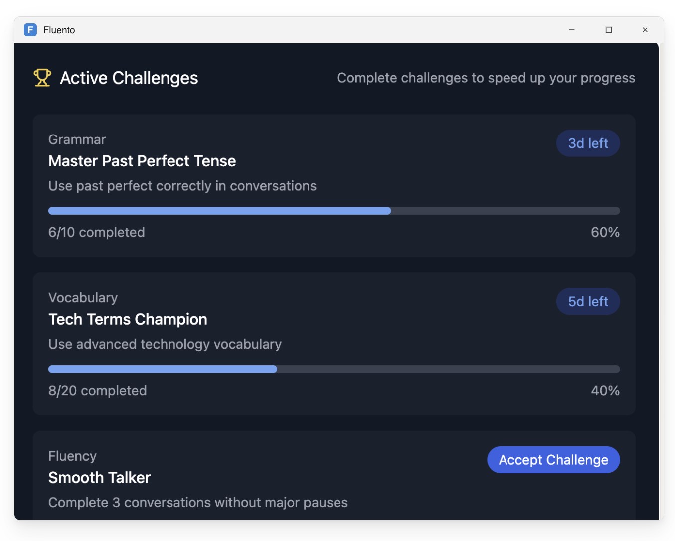 Challenges! like a superhuman English teacher, Fluento identifies areas you need to improve on - like words to replace with phrasal verbs, grammar, filler words and more. It challenges you to do better in your next meetings, and listens to you as you do!