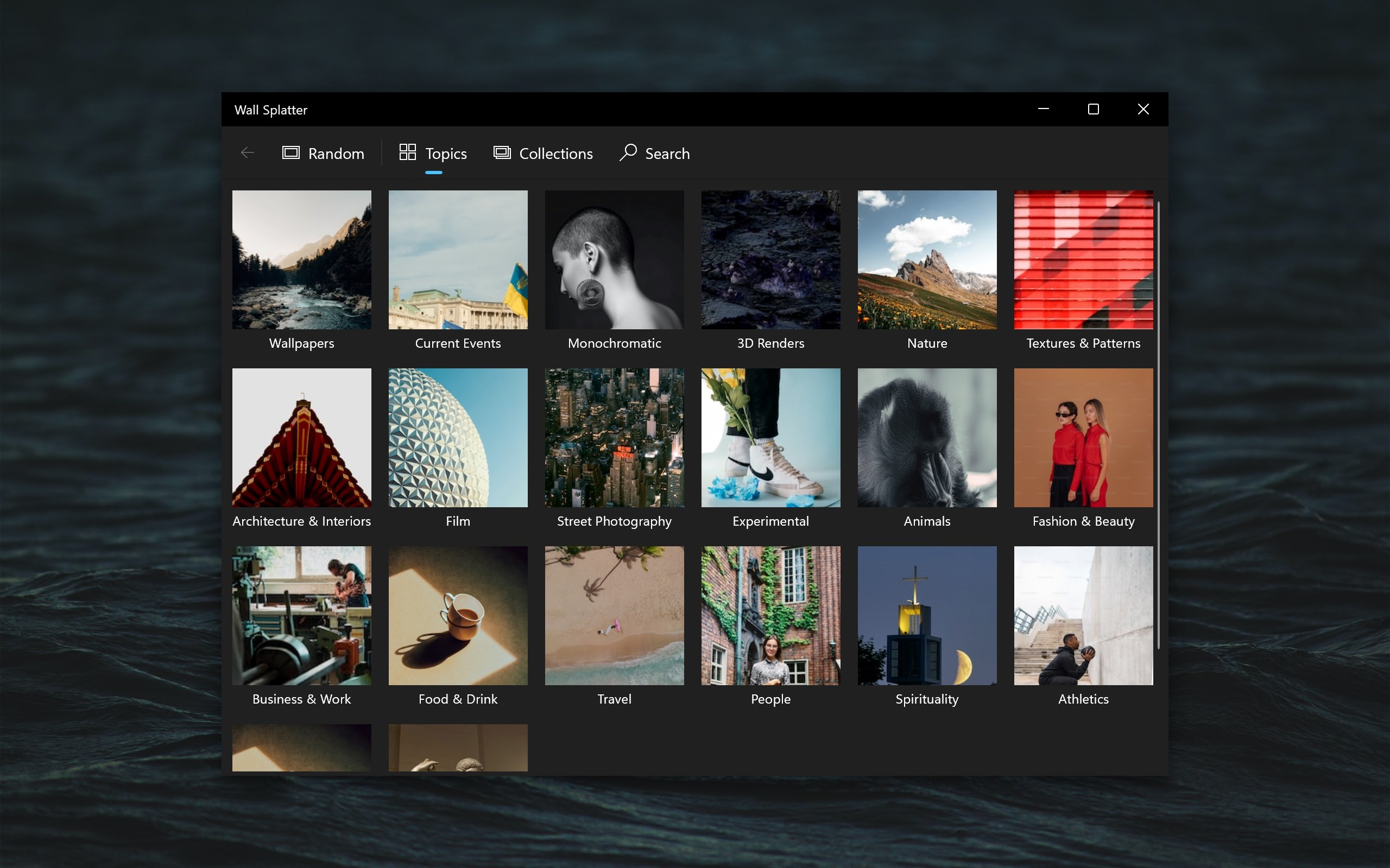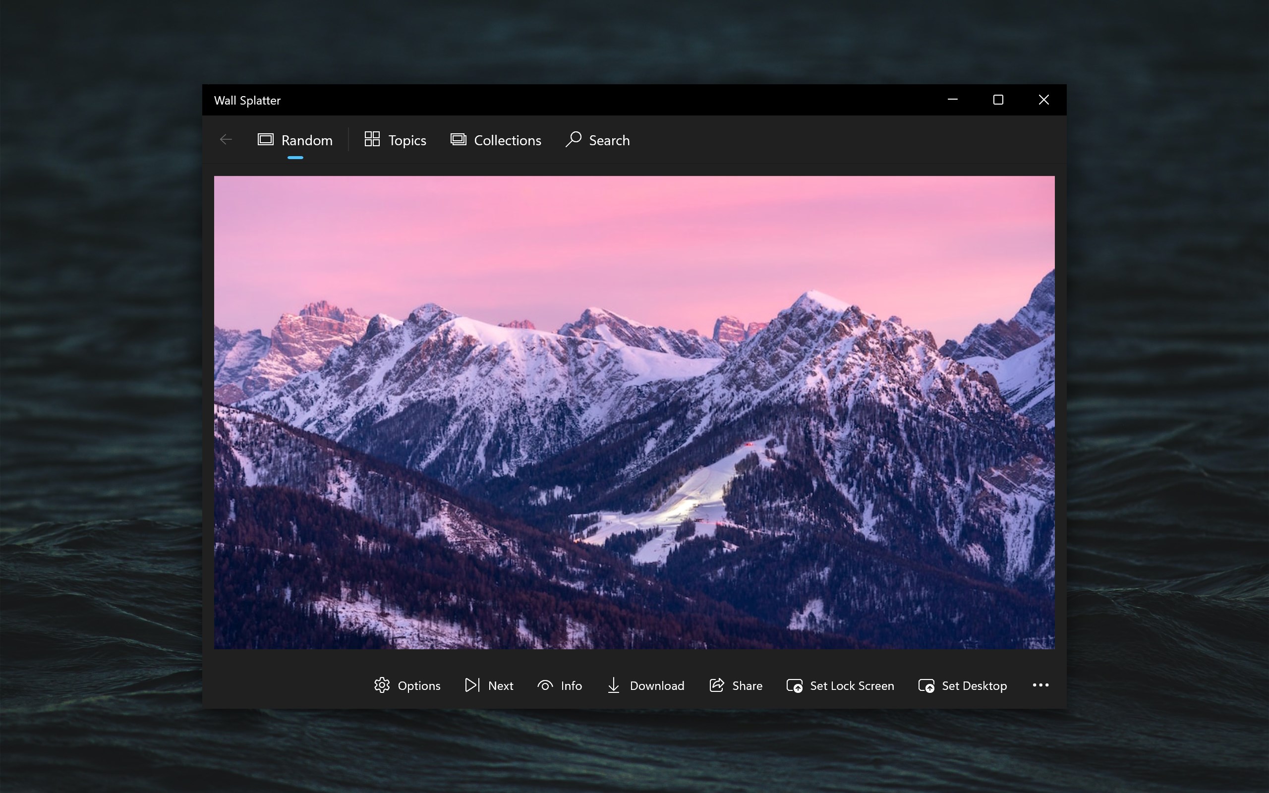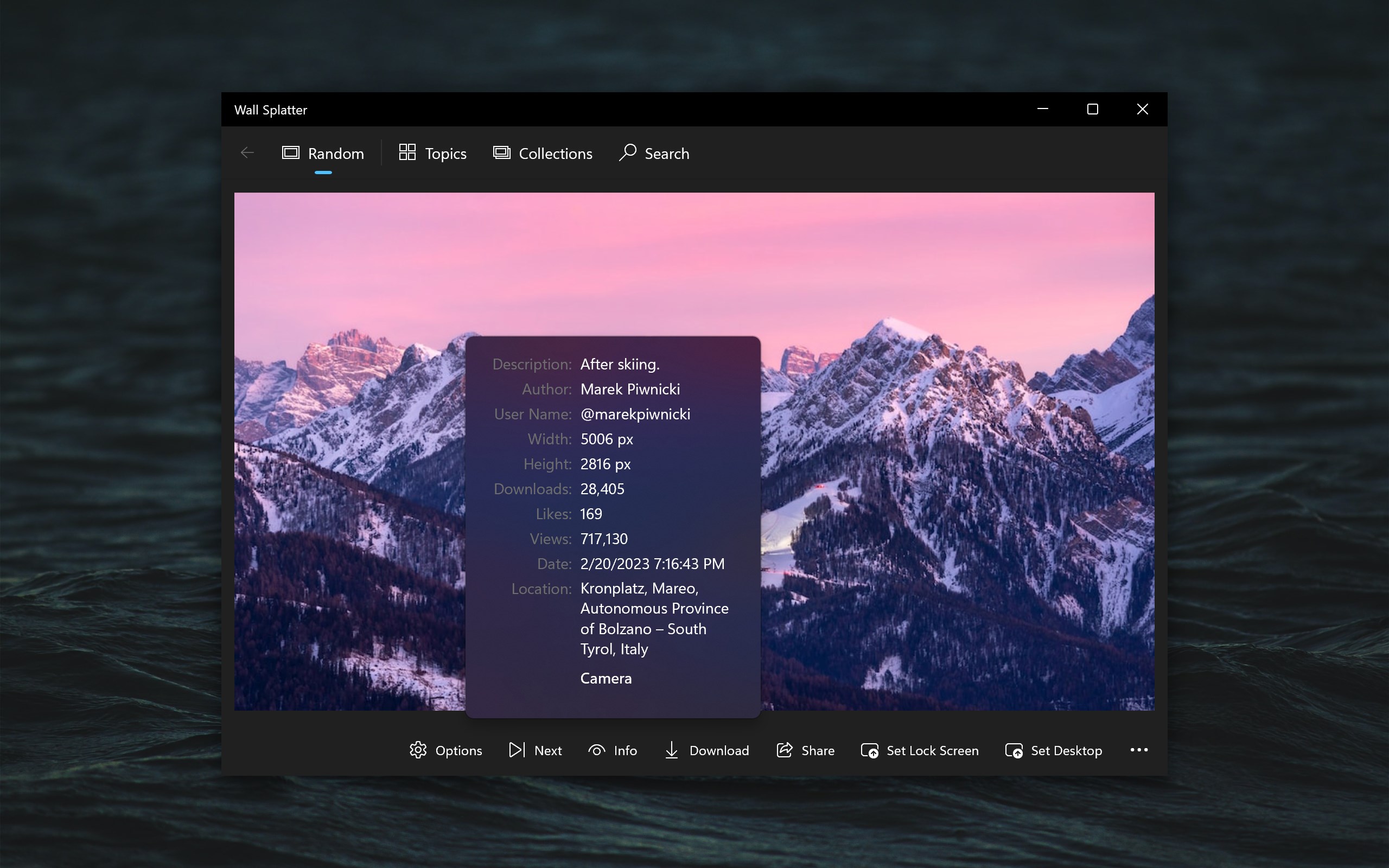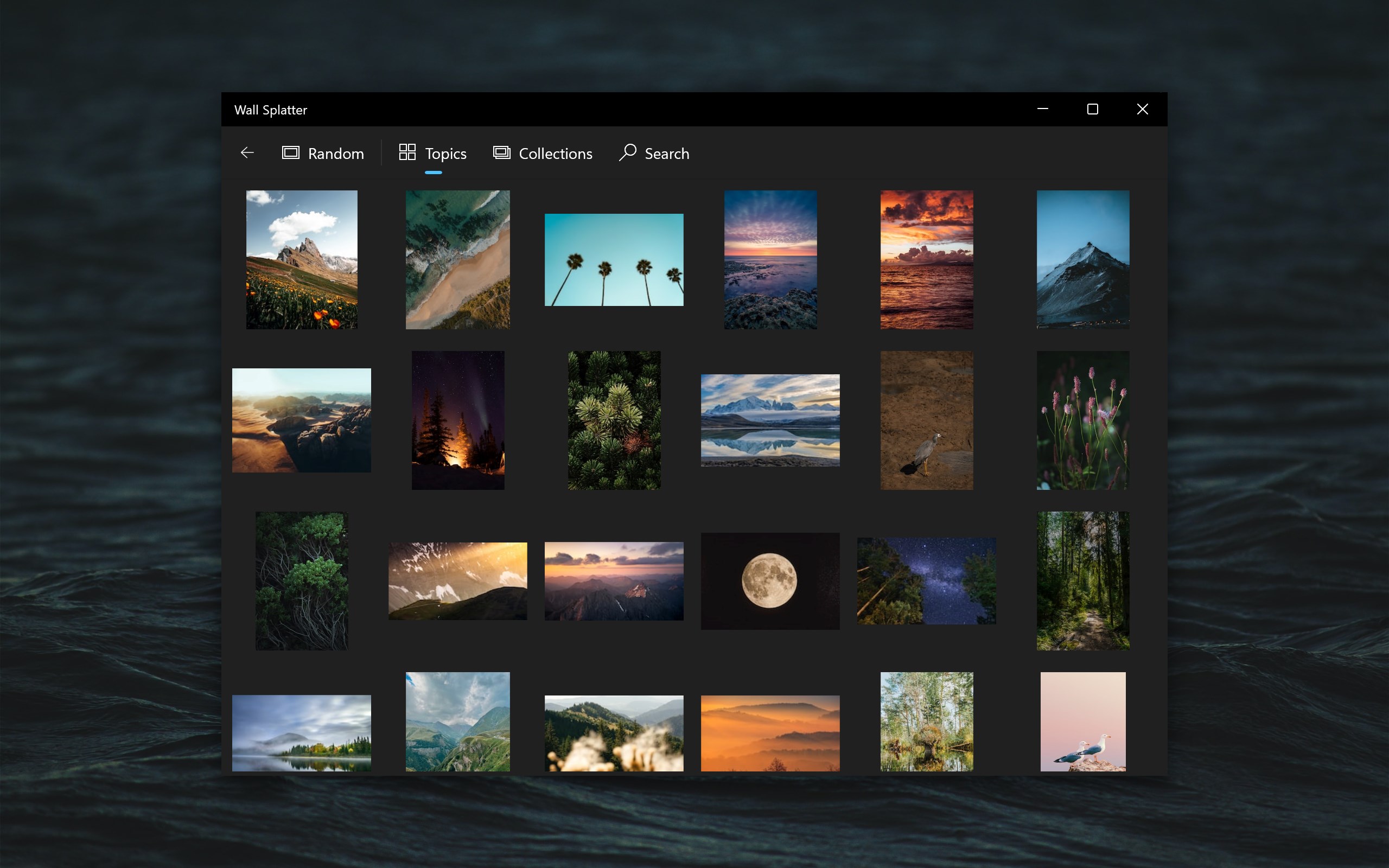 Wall Splatter is a native Unsplash client designed just for Windows. It allows you to easily find wallpapers by collection, topic, or search. From there, you can quickly save wallpapers, share them, view detailed metadata, or set them as your Lock Screen or Desktop background.