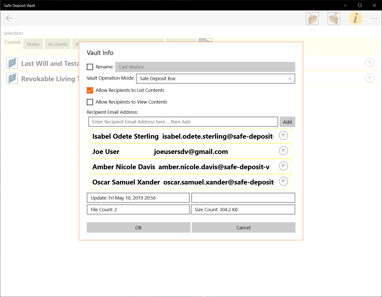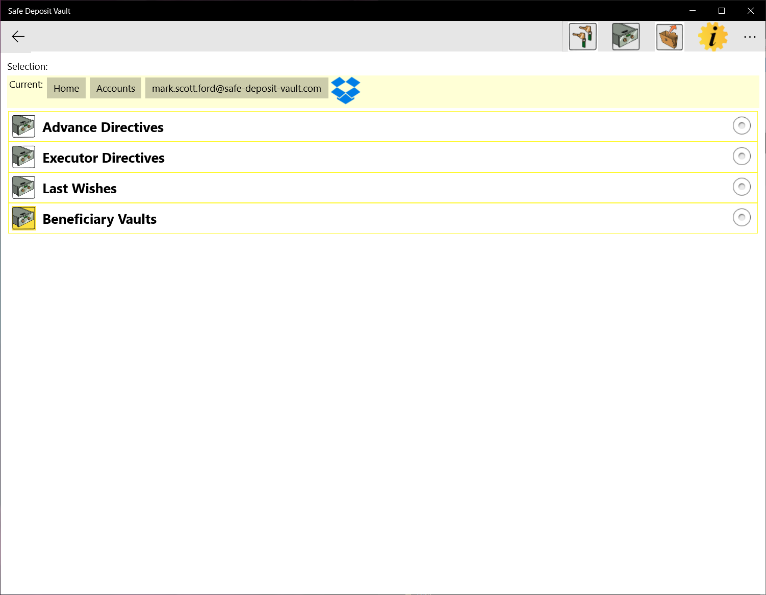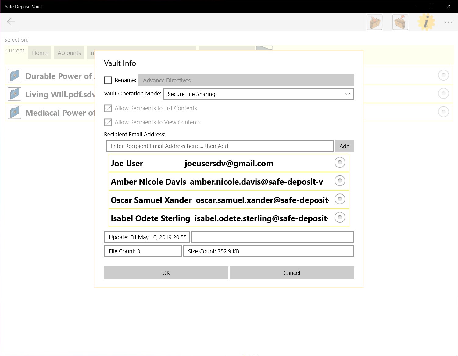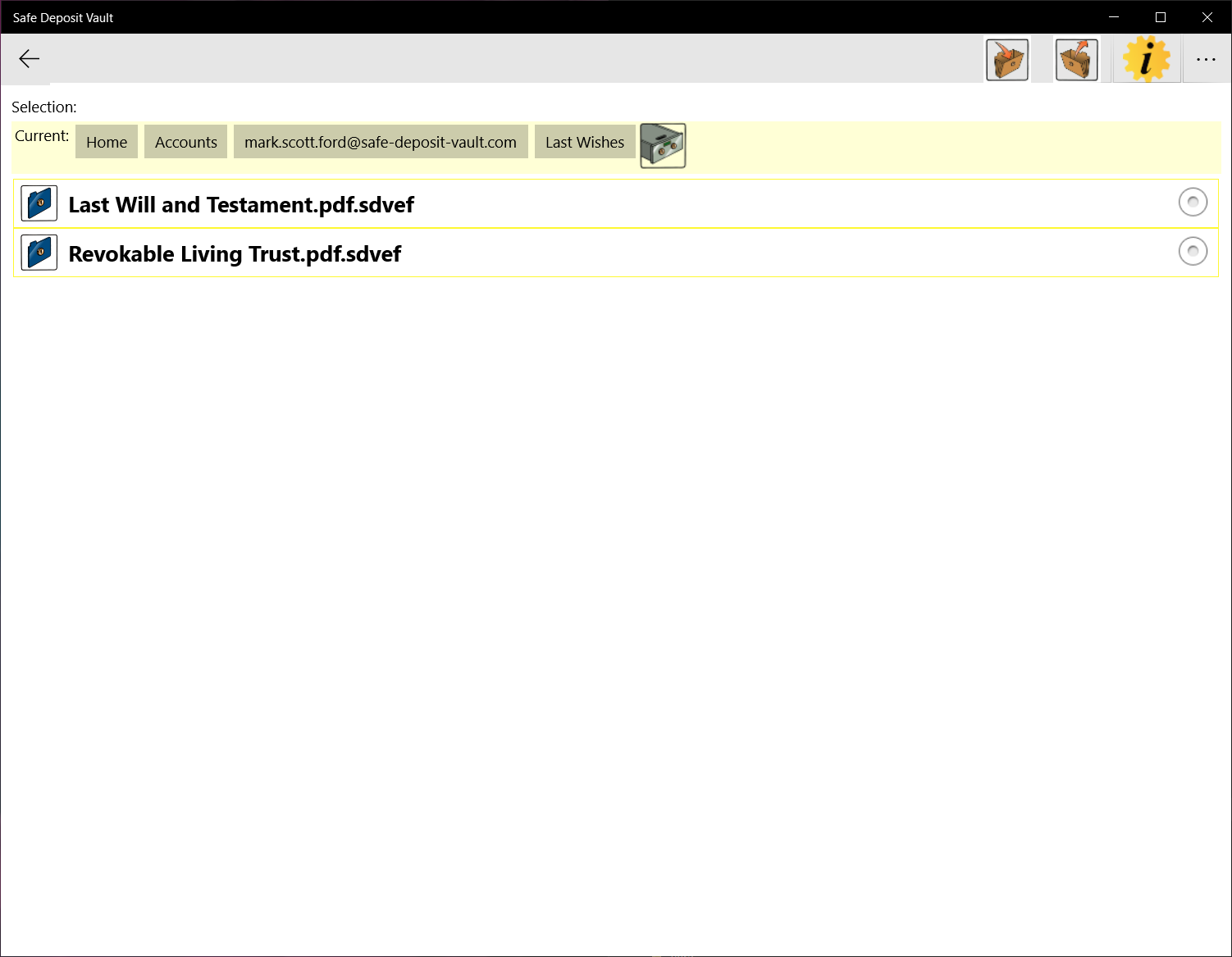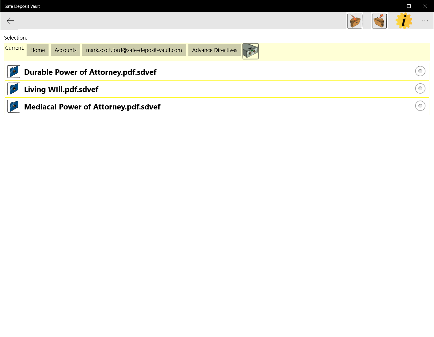 Safe Deposit Vault provides the equivalent of a physical Safe Deposit Box at a Bank for your digital content. This allows you to place your important digital content, such as a Living Trust, Last Will and Testament, various Power of Attorney, HIPPA Release, Inventory of Physical Property, Financial Accounts, Passwords etc., in a place that you, your family, friends, and associates can locate should something happen to you or your home. The digital content that is placed into the Vault is encrypted to protect your privacy. In addition the content is also digitally signed by you and cryptographically time stamped by our service. This will provide proof that the digital content removed from the Vault has been signed by you and is an exact copy of content you placed in the Vault, and the date and time when you signed and placed the content in the Vault.