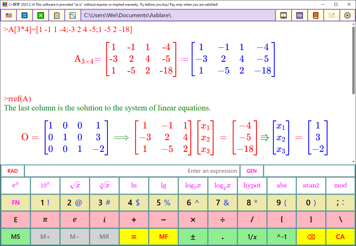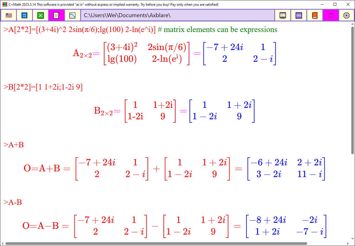 Perform basic matrix calculations such as A+B-C, ABC, A*k, A^n, etc.;