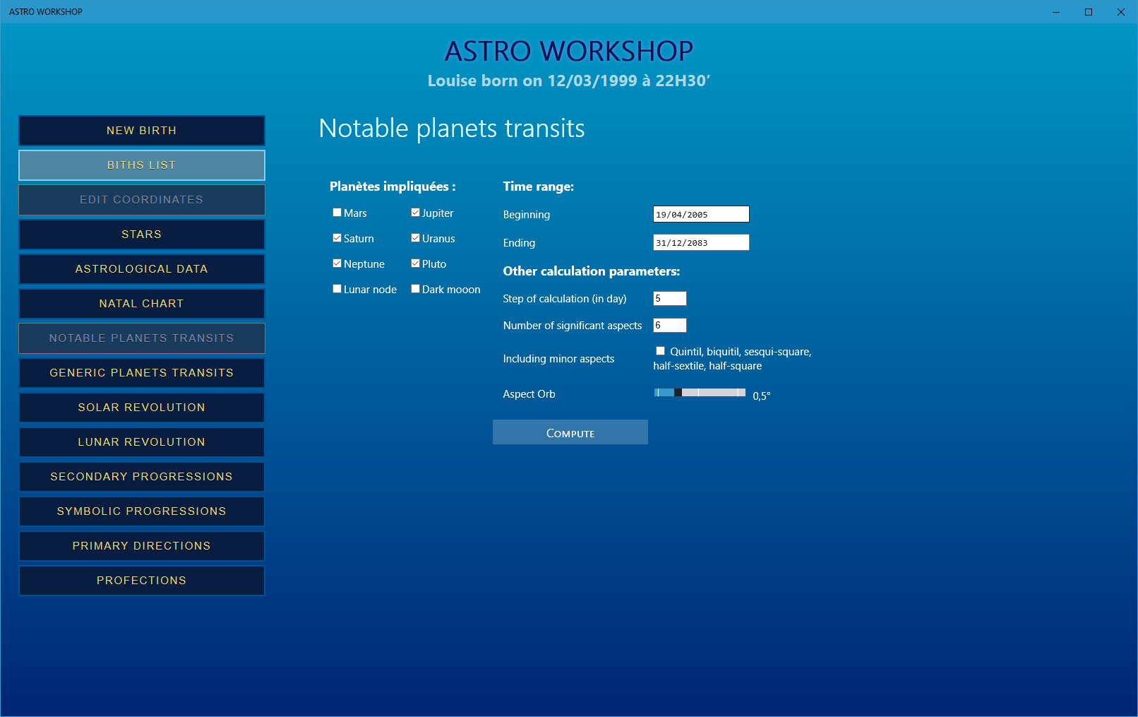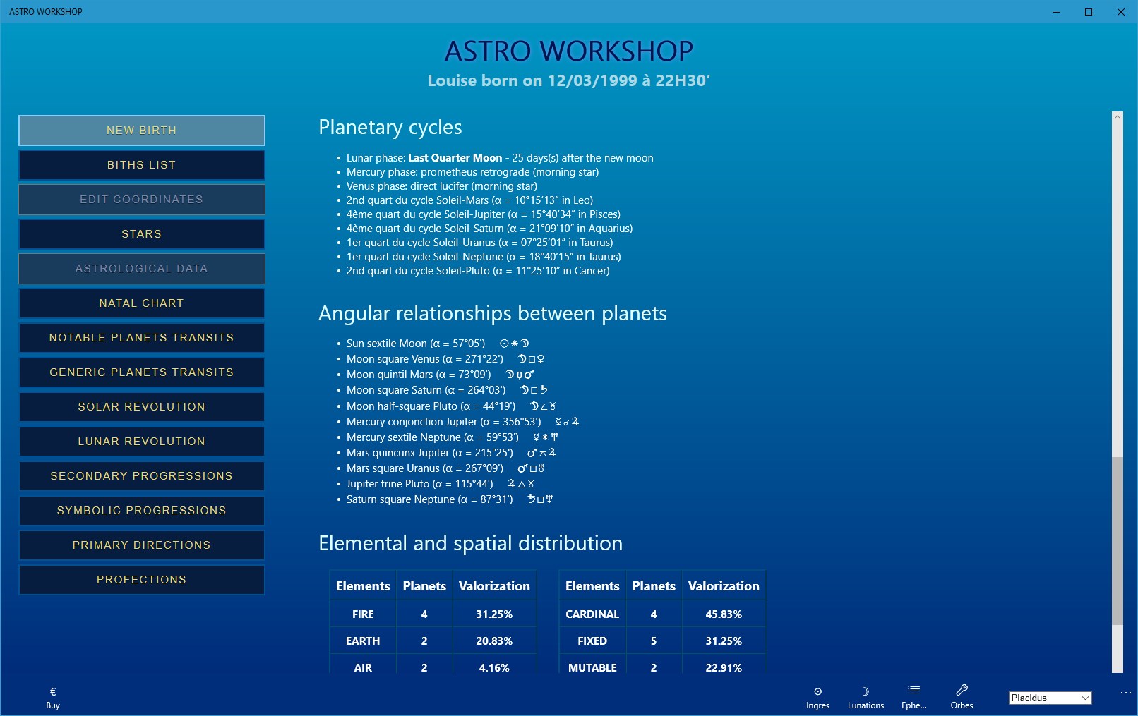 The “ASTRO WORKSHOP” (also called "Astro Studio") has been specially designed for astrologers or for students in Astrology who want to free themselves from the forbidding calculations imposed by this learning.