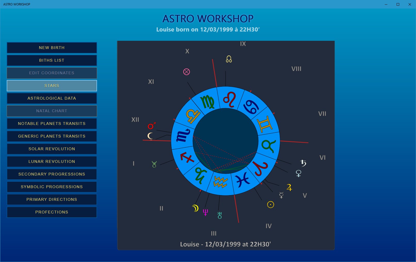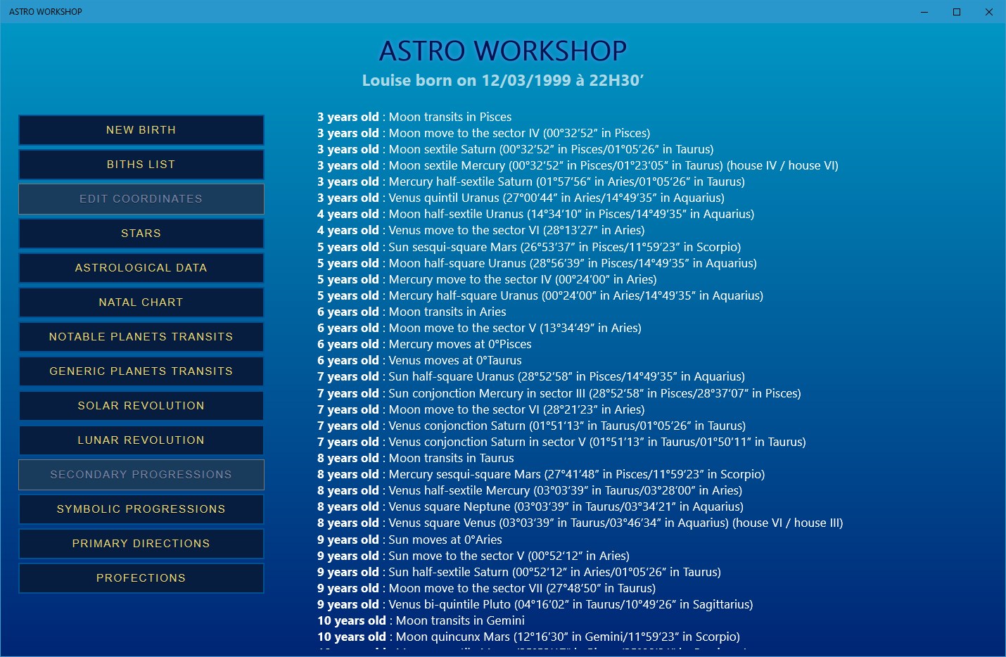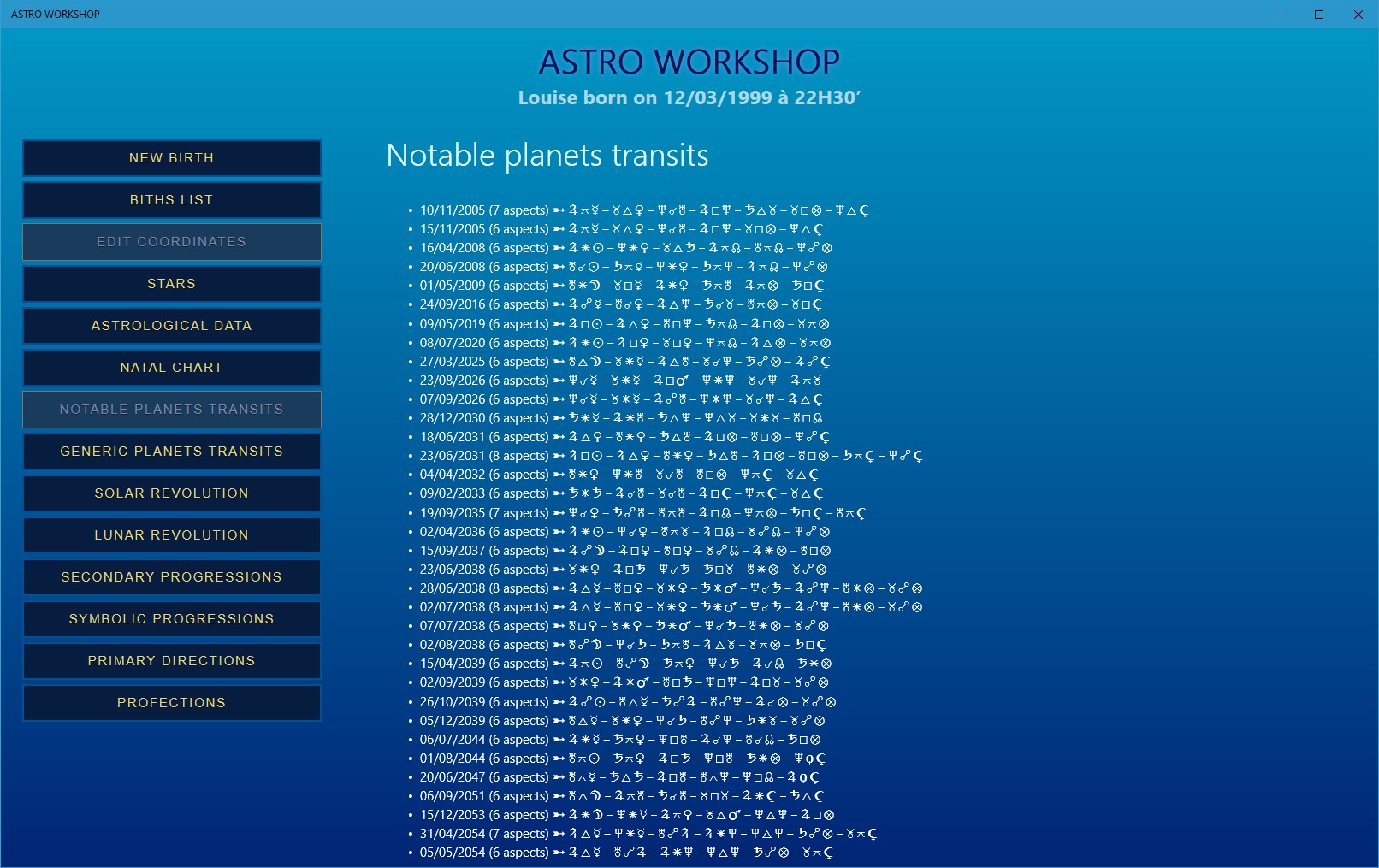 Its built-in database will allow you to save as many dates of birth (and therefore people) as you want. You will have all pssible features of astrological calculations: these data are available instantaneously and readable in several formats.