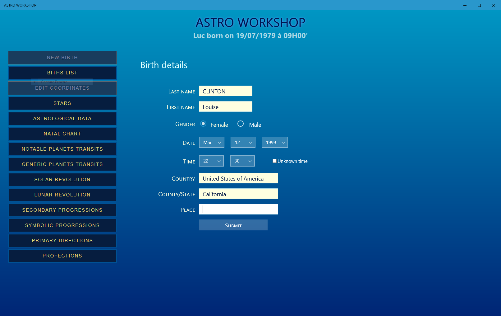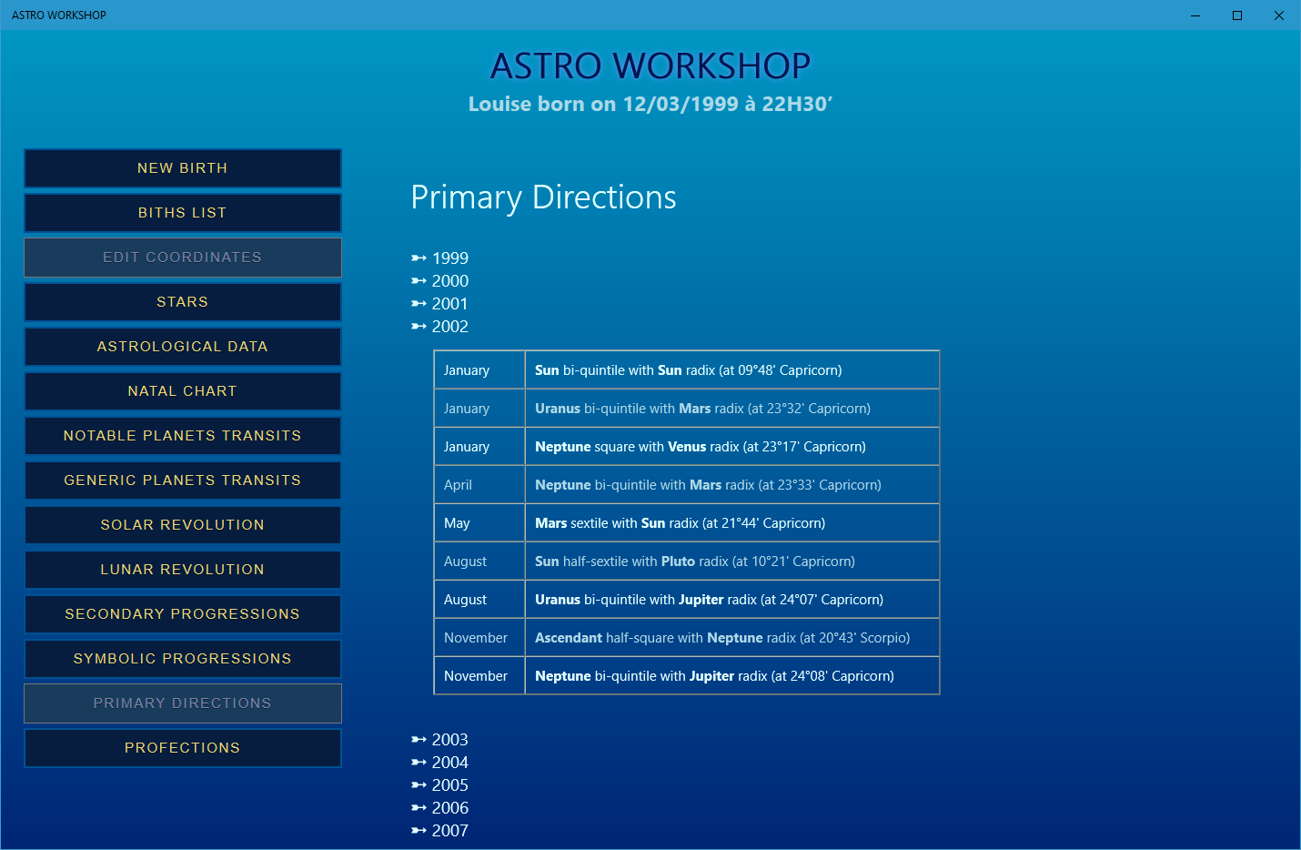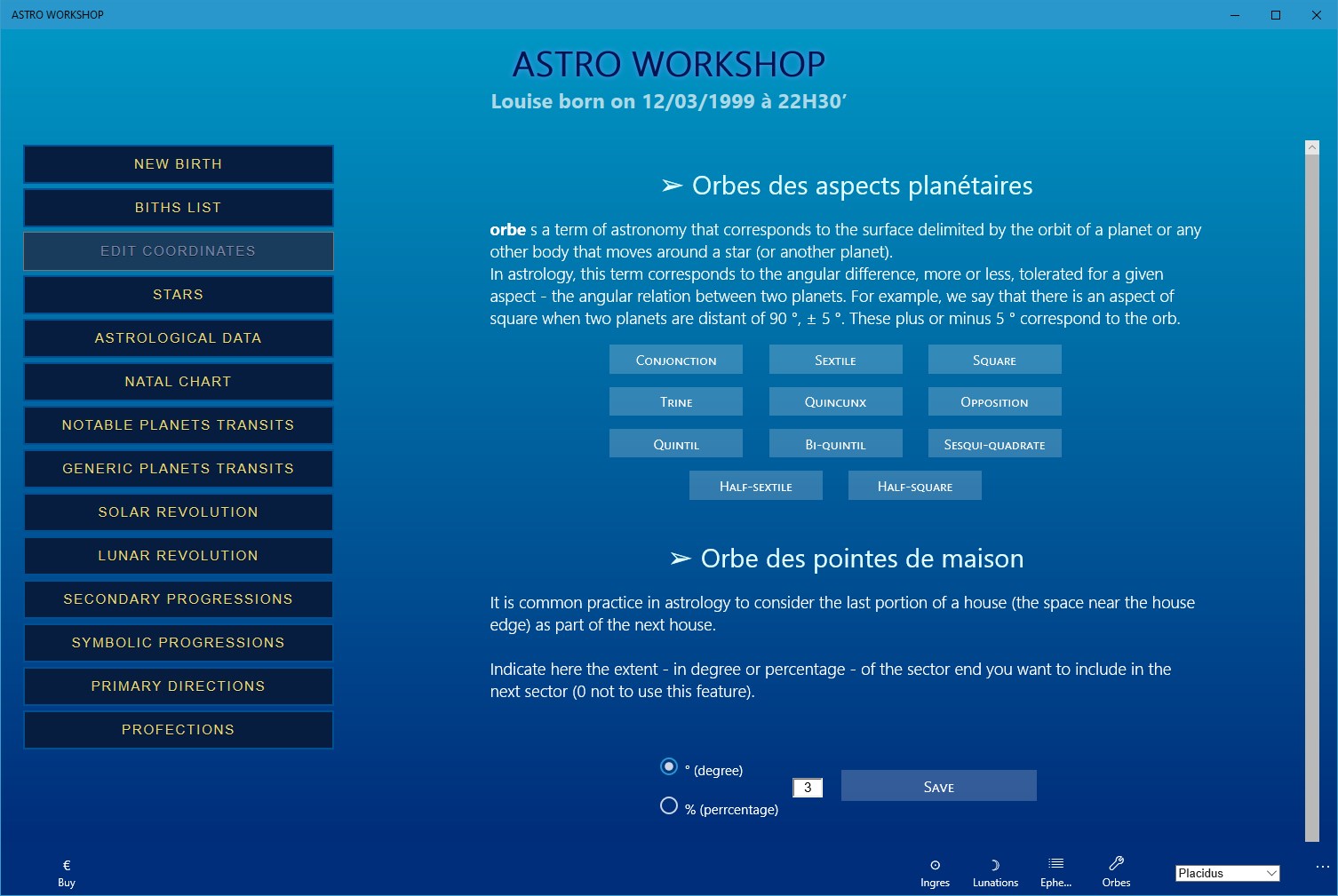 Its built-in database will allow you to save as many dates of birth (and therefore people) as you want. You will have all pssible features of astrological calculations: these data are available instantaneously and readable in several formats.