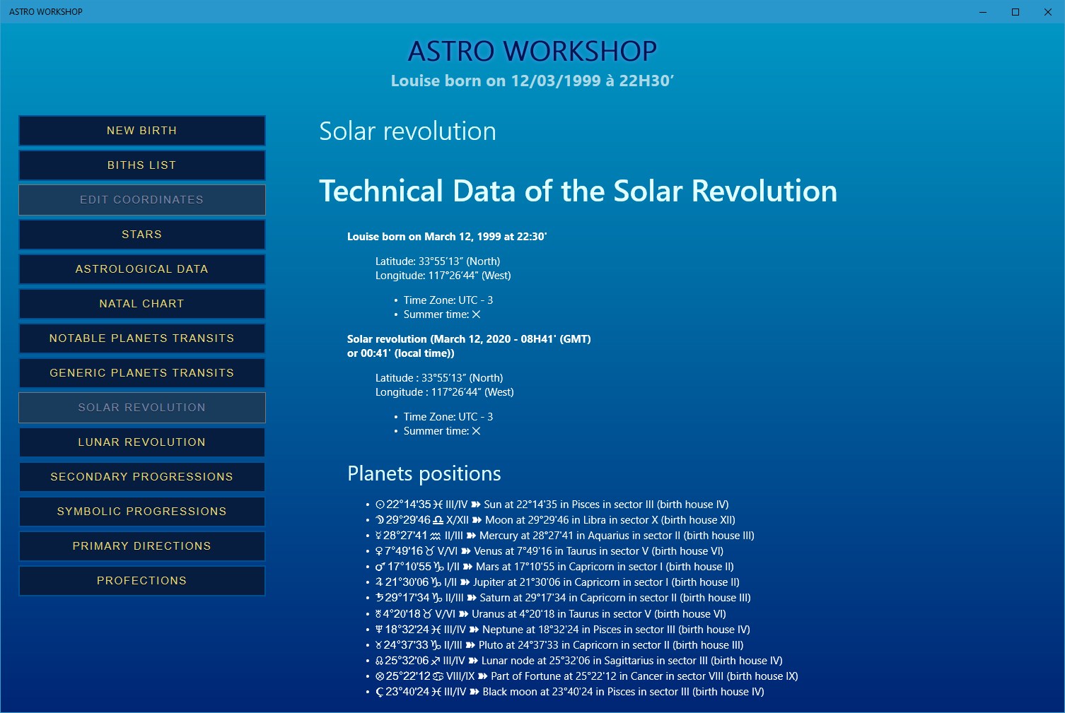 planets position calculationDomifications (8 traditional methods)Natal chart drawingNotable planets configuration searchCalculation of generic planets transitsCalculation of solar revolutionsCalculation of lunar revolutionsCalculation/presentation of secondary progressionsCalculation/presentation of symbolic progressionsCalculation and presentation of primary directionsCalculation of profectionsCalculation of positions, dates and times of New moonsCalculation of solar ingres (sign change)Calculation of monthly ephemerisSettings of astrological parameters (orbs of planets and houses)visualization of planetary transits into the natal chart (for any past or future dates)visualization of secondary or symbolic progressions into the natal chart (for all the ages of life)Arab part calculationConversed progressions calculation and presentationMain fixed stars list