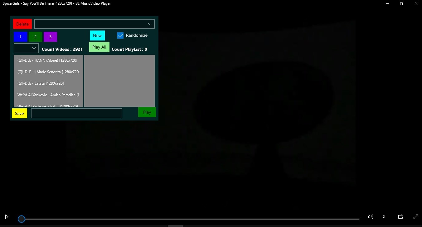 Play your favorite music video. Just have to place the video in you video folder and in a directory call Music Video. Make app small compact by pressing the M on the keyboard or the right button on mouse. In compact it will always be on top. And the mouse scroll controls the volume by scrolling up or down. Add that you can random pick music or play alphabetical order. If have a lot of song you can sort them by the first letter. If you choice letter A, it will only display all song that start with letter A. Display if video in playlist 1,2 or 3 on main screen. You can remove from playlist 1,2 or 3 by press any of those button on the upper right. And on the bottom right just above the next button you can add to playlist without using key board.