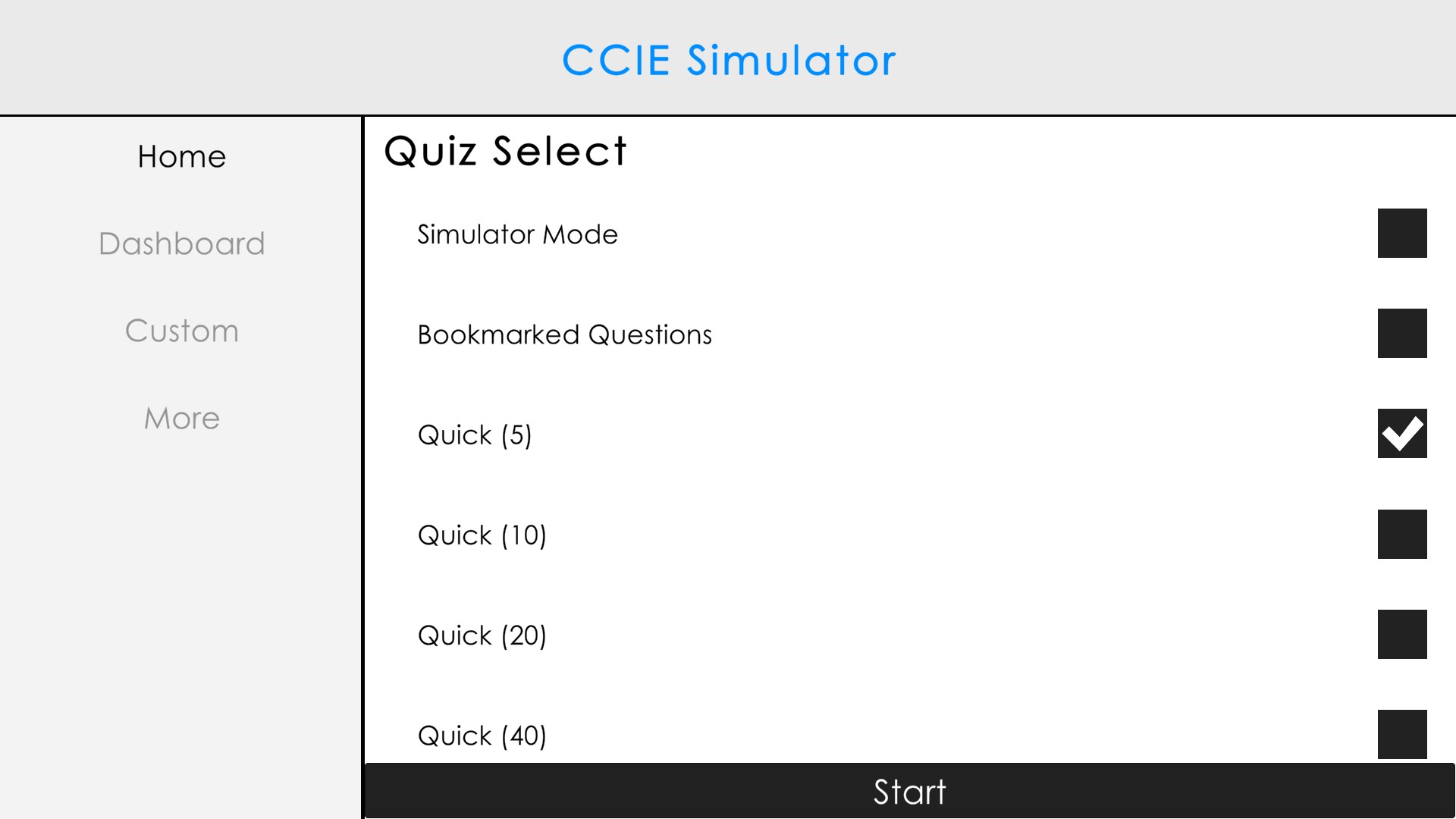 Allows you to quickly start a 5, 10, 20, 40, 50 question exam with randomized questions.