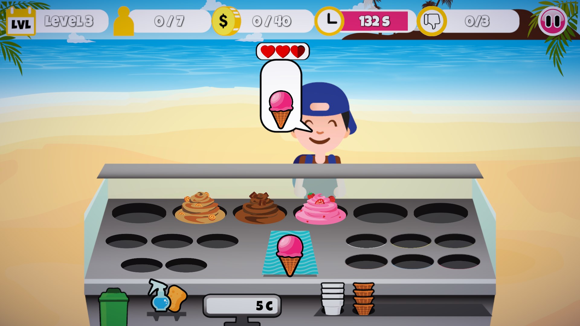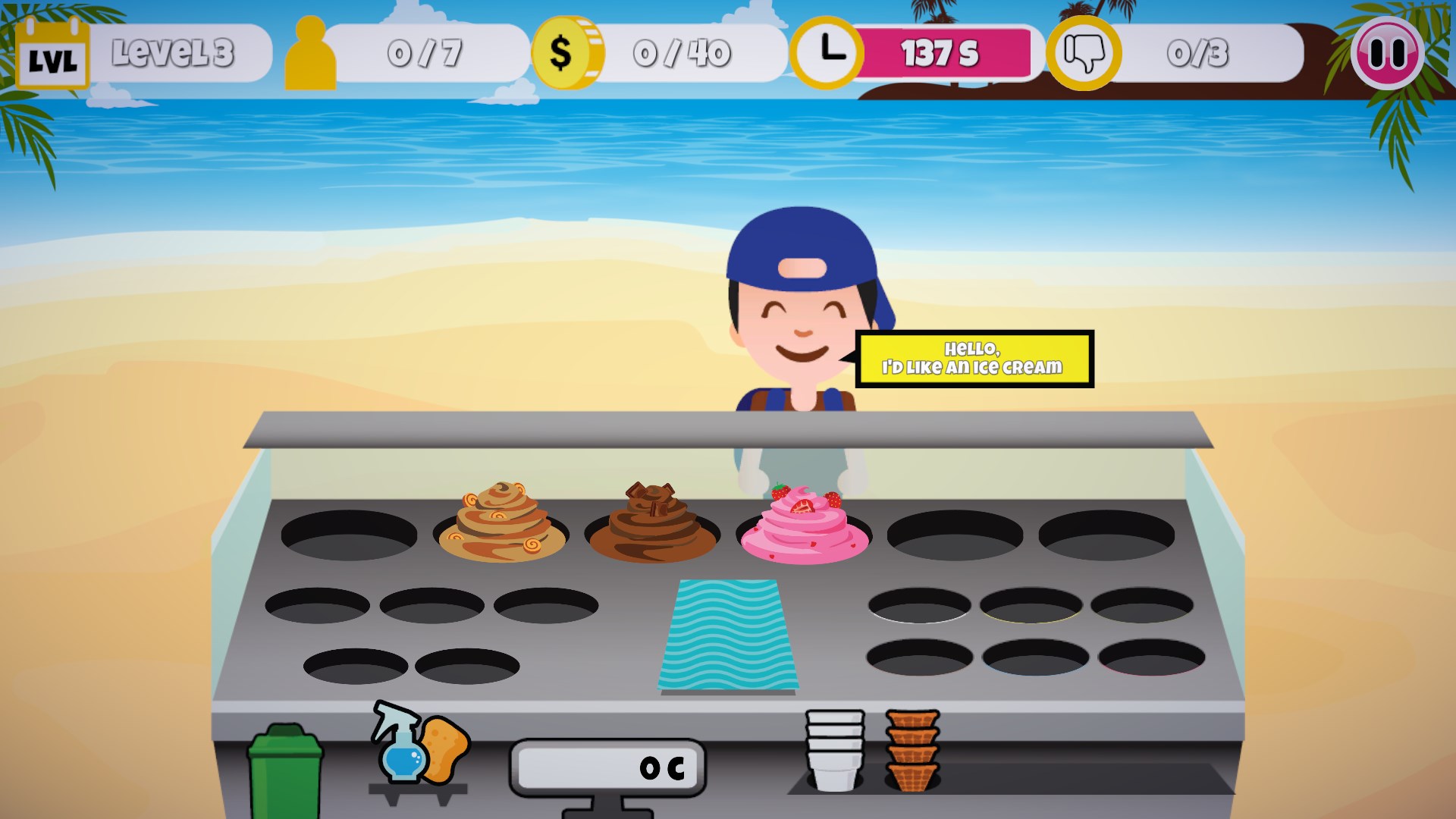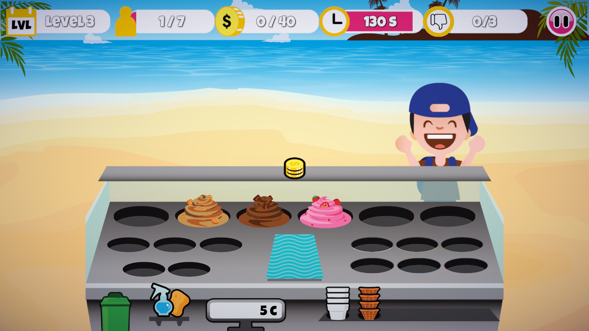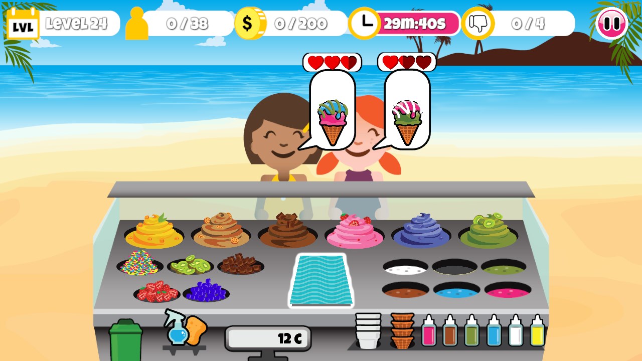 Start your own icecream business with your own little icecream booth on a beautiful beach! Sell the delicious icecream and make your customers happy! Serv them delicious icecream in various flavours and various dips, toppings and syrups.