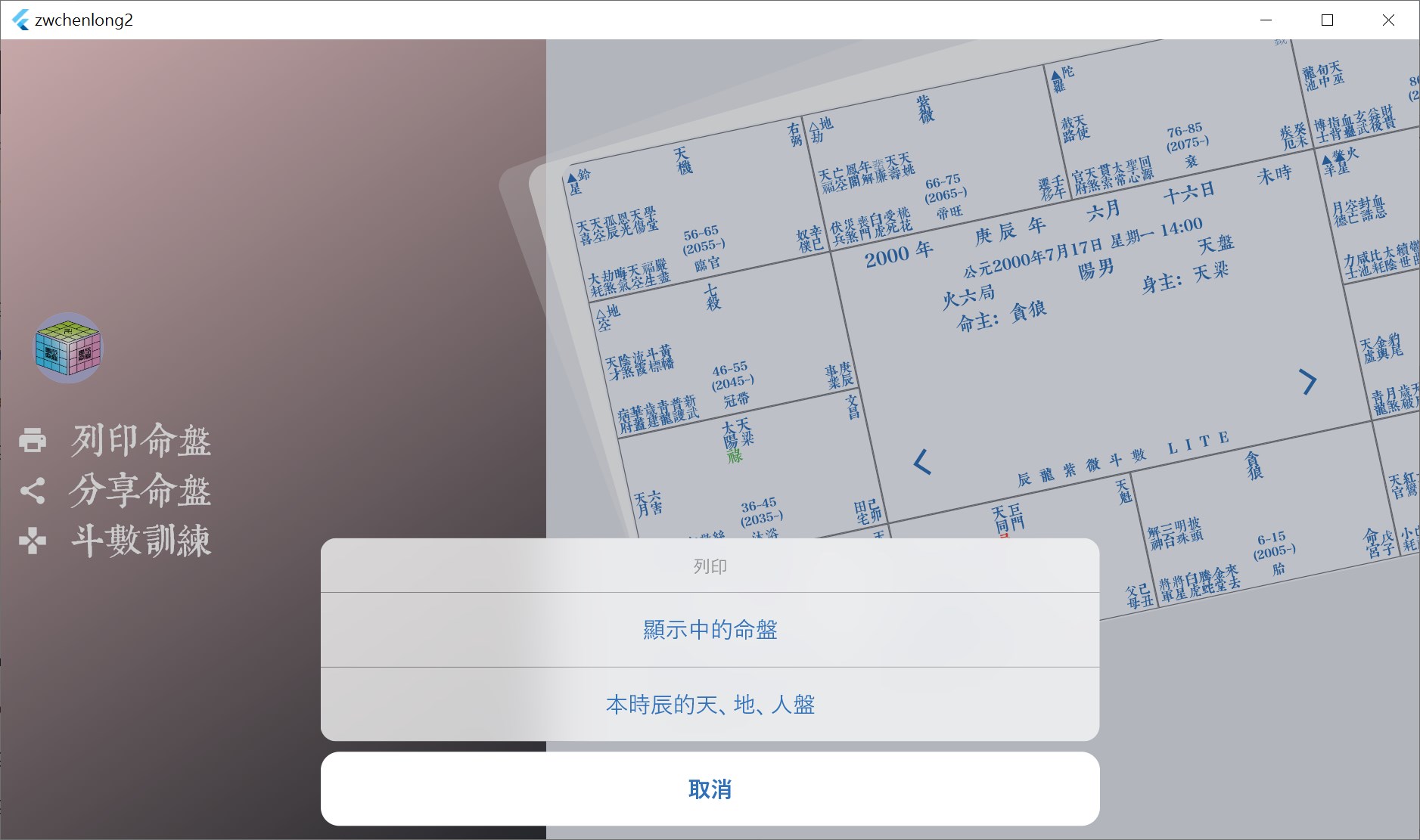 「辰龍紫微斗數 LITE」 是 「辰龍紫微斗數」的簡略版,只提供列印/ 分享盤以及訓練小遊戲,乃專為學習階段而設。完整功能請選擇「辰龍紫微斗數」。