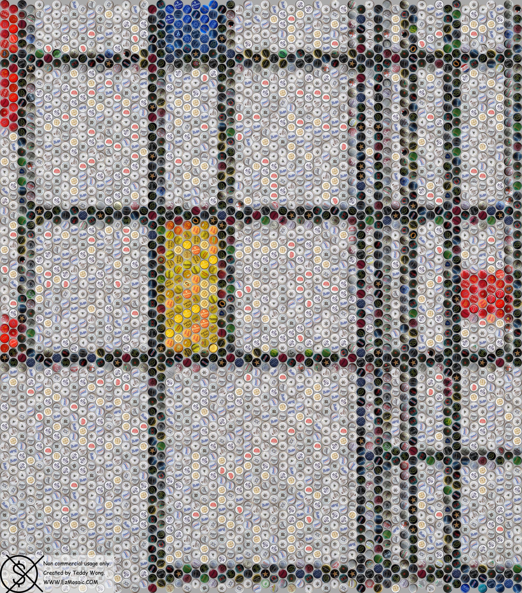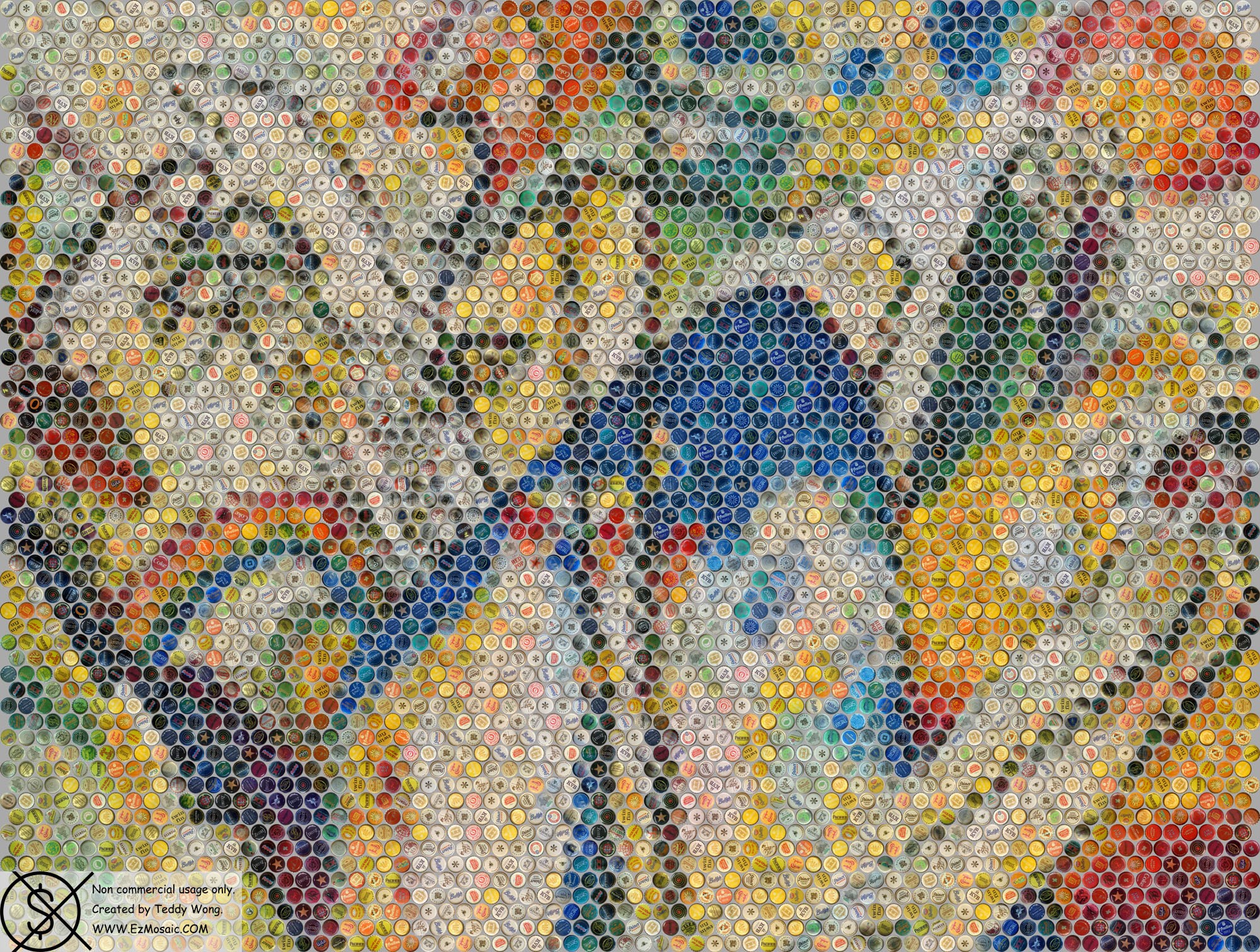 Cap Mosaic is a special form of Photo Mosaic. Each tile is a bottle cap. There are so many beverage brands and cap designs in the world. Caps is a great material source for mosaic projects. The cap mosaic can be designed as a digital picture, or assembled as a physical mosaic using real caps.