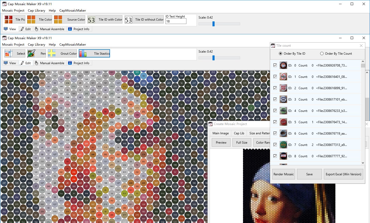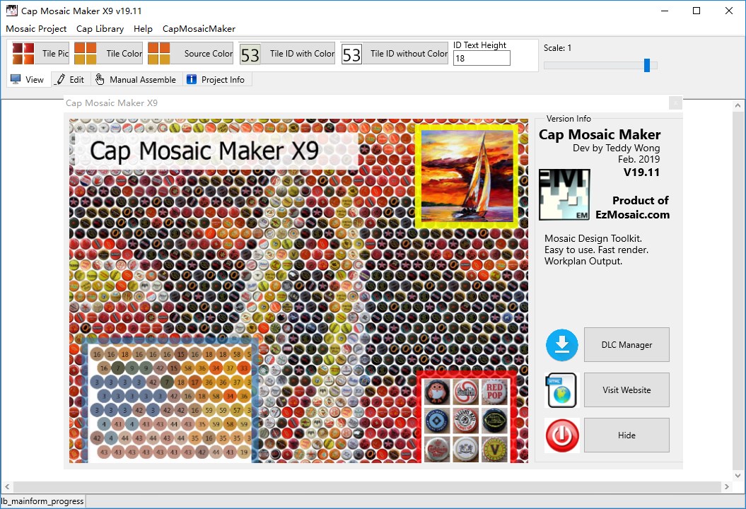 Convert any picture to a Cap Mosaic.Use your custom Cap photos. mosaic can hold 100x100 caps for Grid system, 10000 caps for Circle systemAdvance mosaic render and options.Workplan generator, help workshop and facytory to assemble the mosaic
