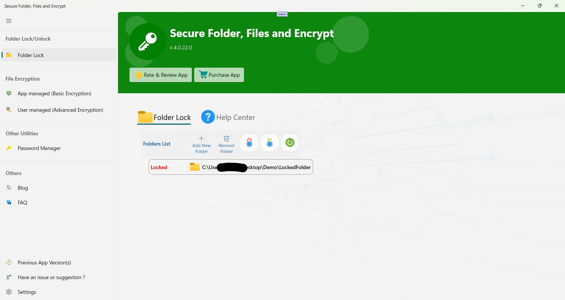 THIS APP DOES NOT SUPPORT PROTECTING FOLDERS ON BITLOCKER-ENABLED DRIVES/ONEDRIVE FOLDERS. We kindly request avoiding negative reviews regarding this limitation.