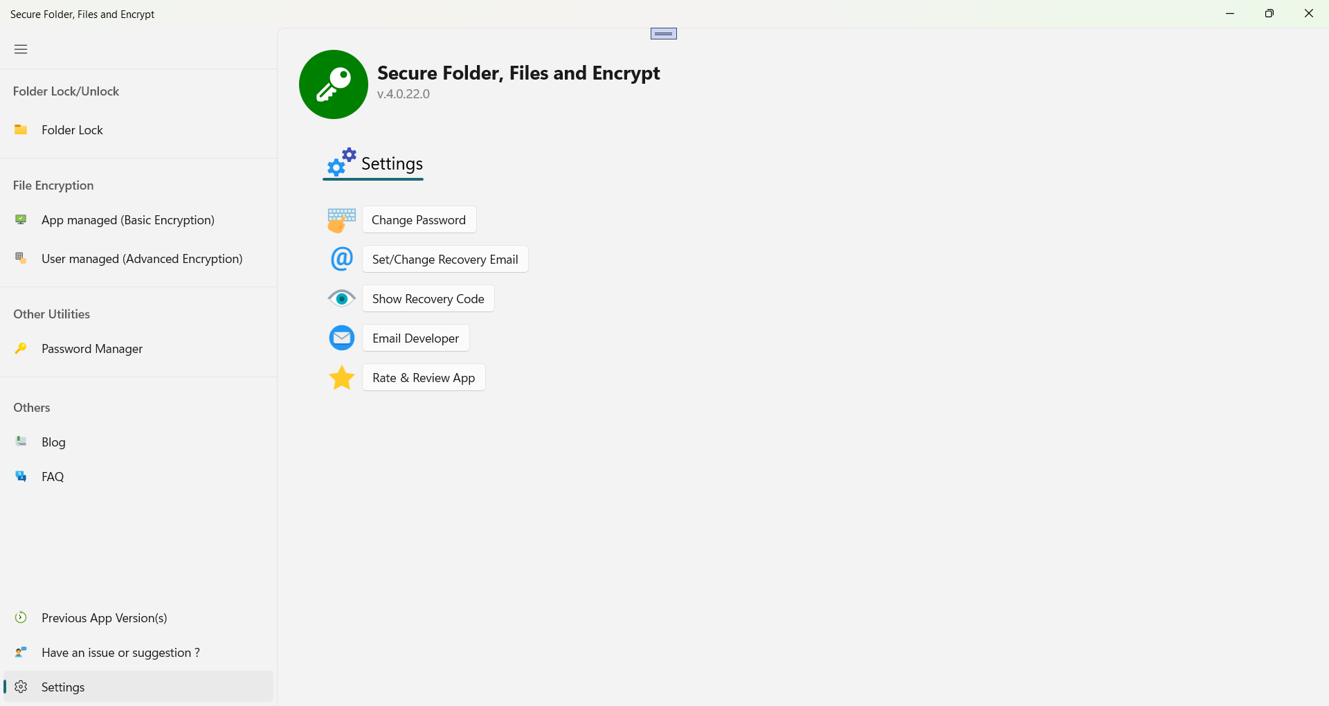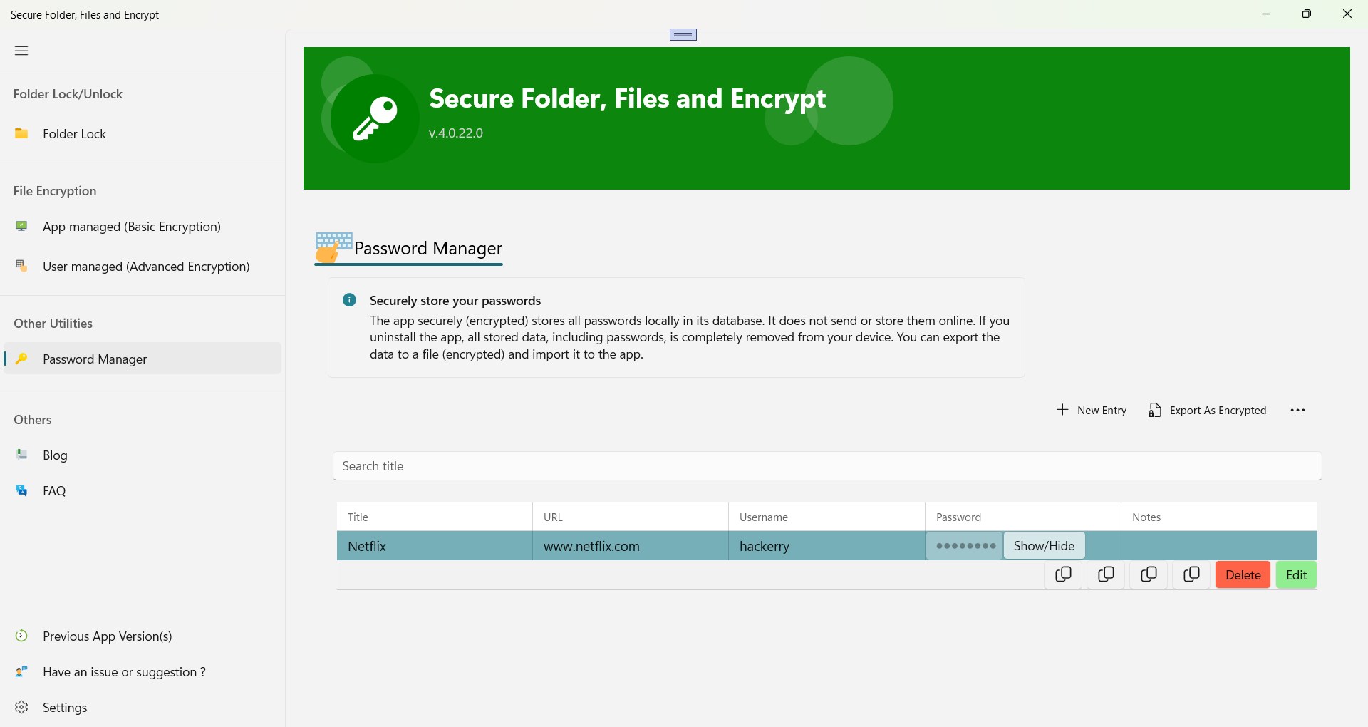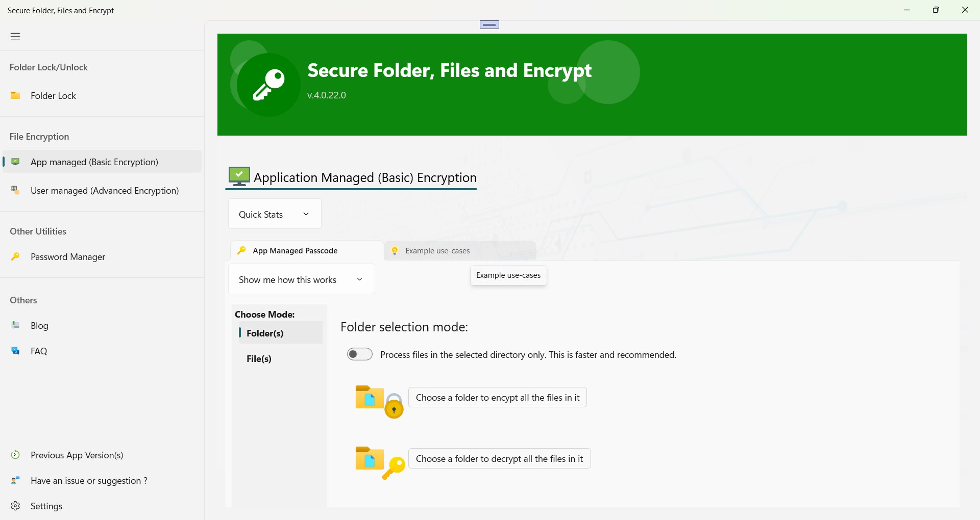User-Friendly DesignSecure the app by a master passwordEncrypt your filesDecrypt your filesRecover your forgotten passwordEncrypt any file format (.docx, .mp4, .mkv, .doc, .xlsx, .txt, .*)Share encrypted files with your people with a passcode to decryptHide your foldersMultiple Folder Lock CapabilitySecurely Lock FoldersSupports Folder Locking on Windows 10/11Password Manager