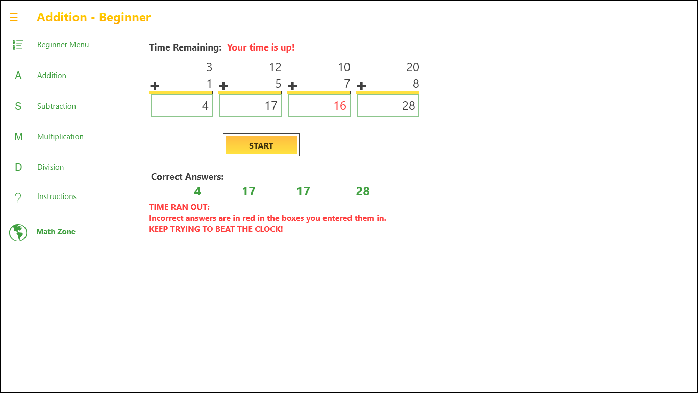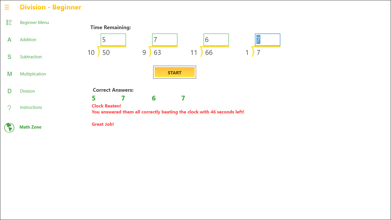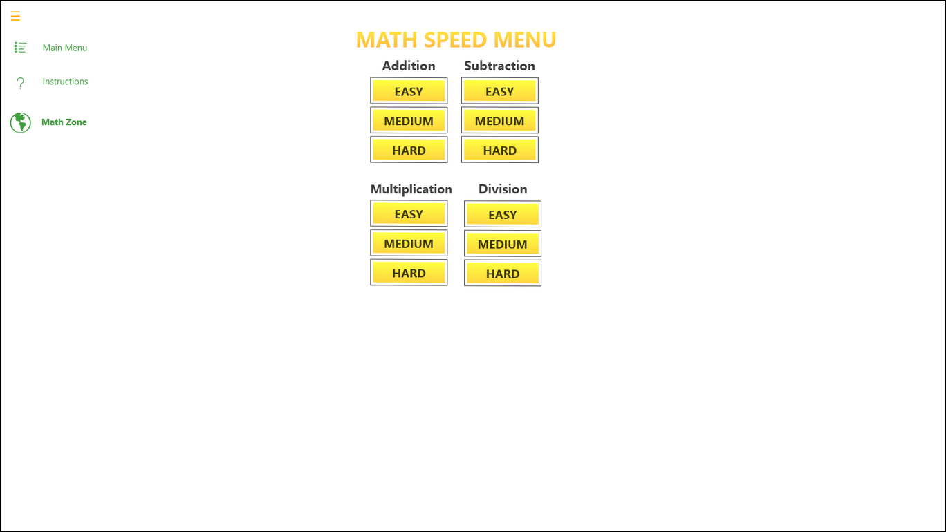 The area for ages 6 and up has 3 levels of difficulty, Easy through Hard, in each math area of Addition, Subtraction, Multiplication and Division. The area for beginners has 1 level each in Addition, Subtraction, Multiplication and Division until they are ready to move on.