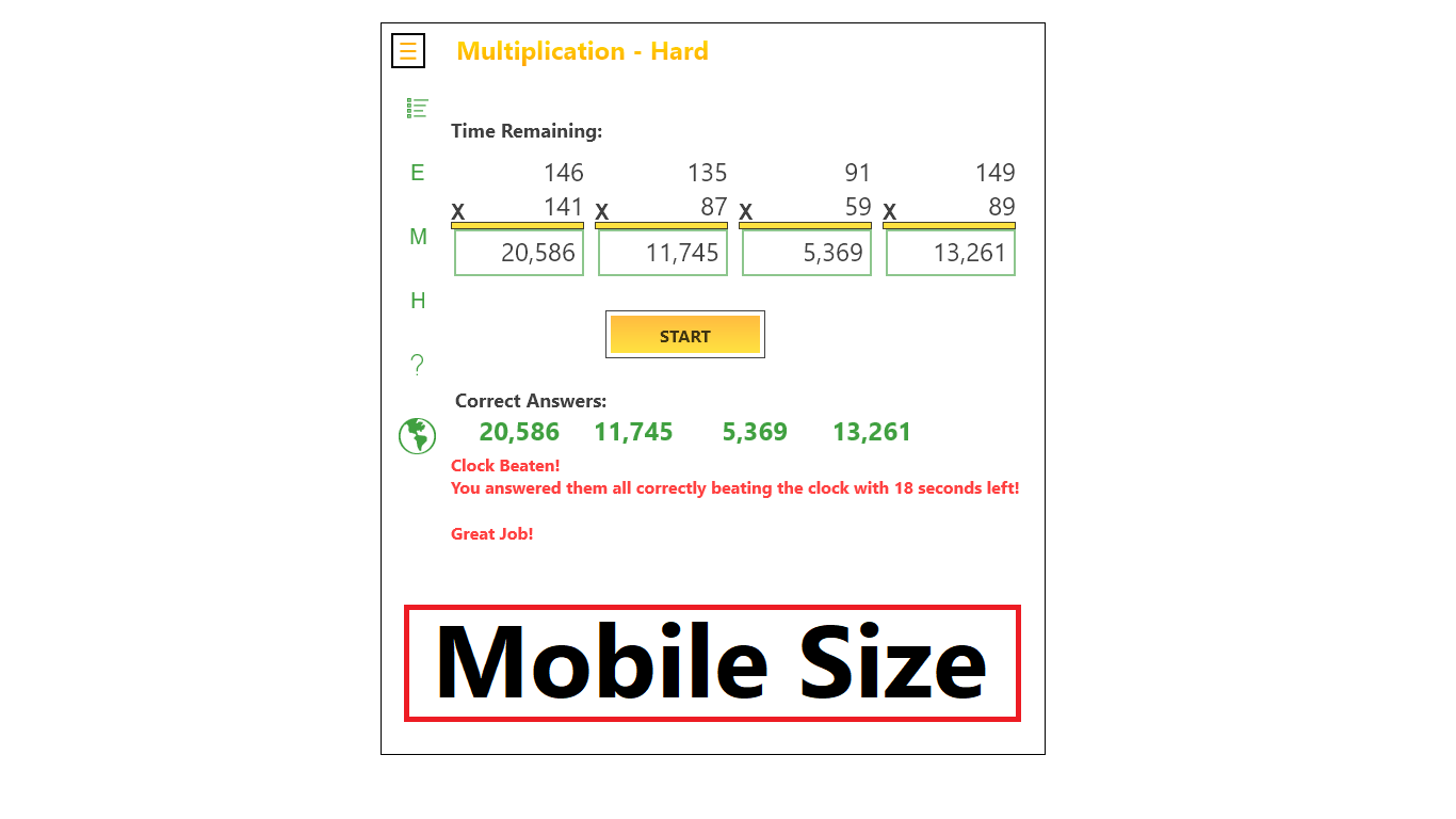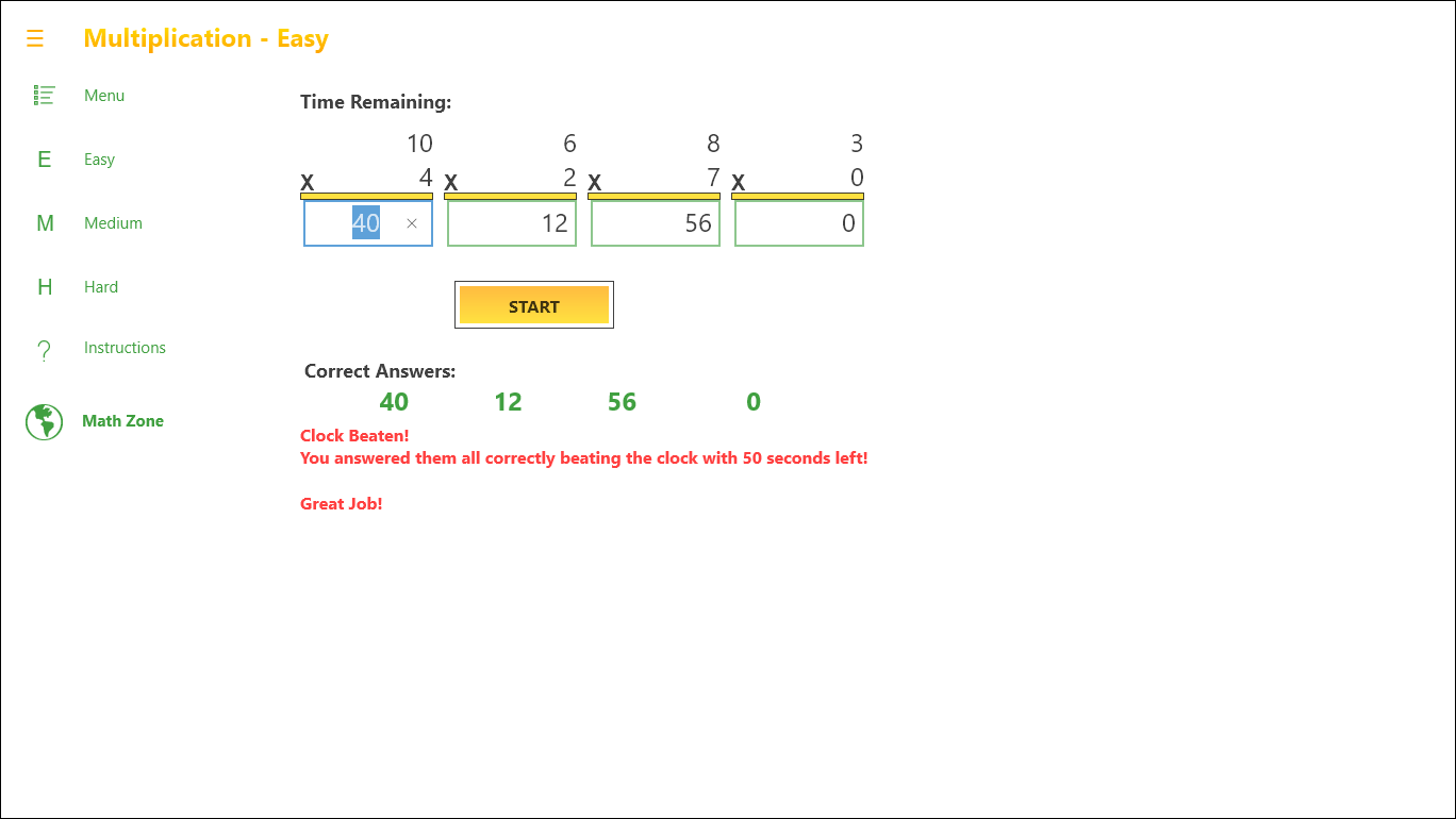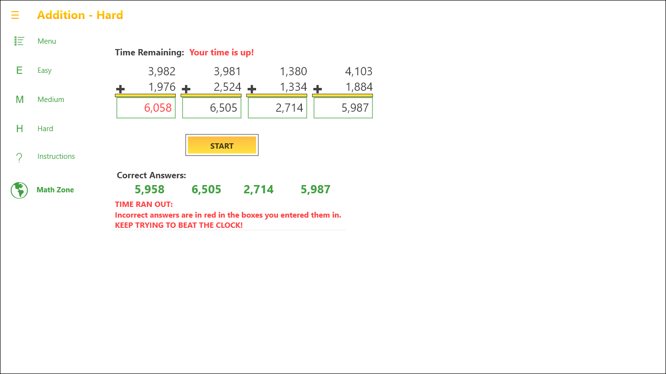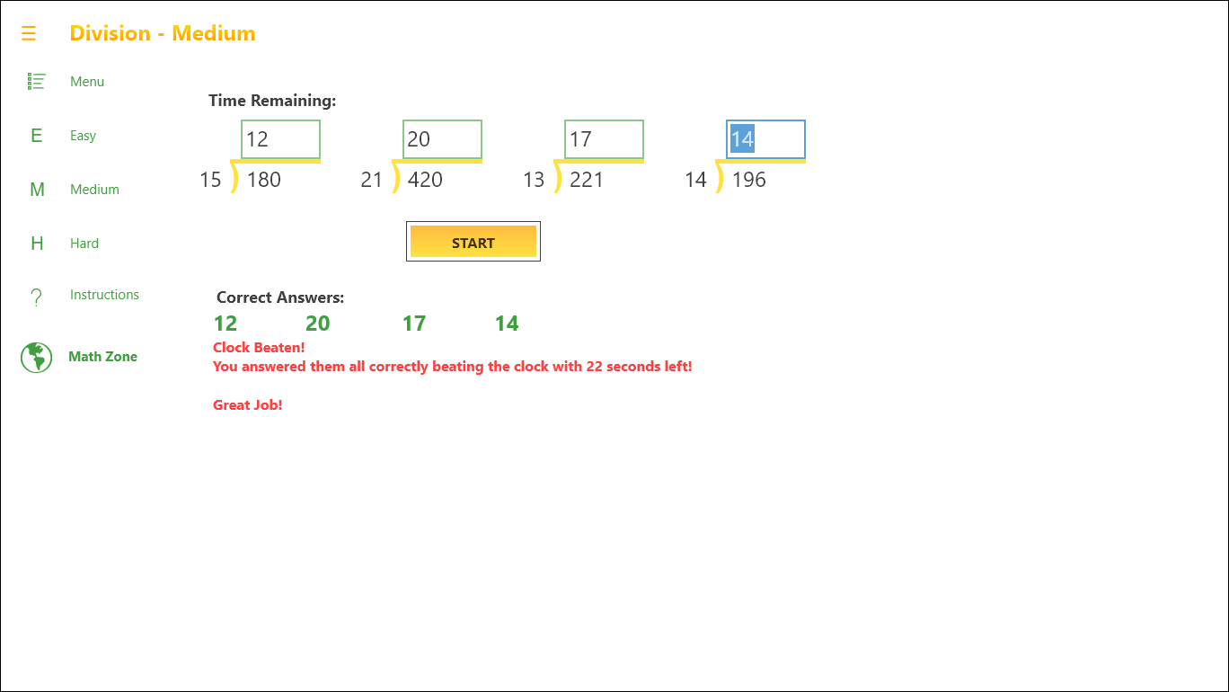 The area for ages 6 and up has 3 levels of difficulty, Easy through Hard, in each math area of Addition, Subtraction, Multiplication and Division. The area for beginners has 1 level each in Addition, Subtraction, Multiplication and Division until they are ready to move on.