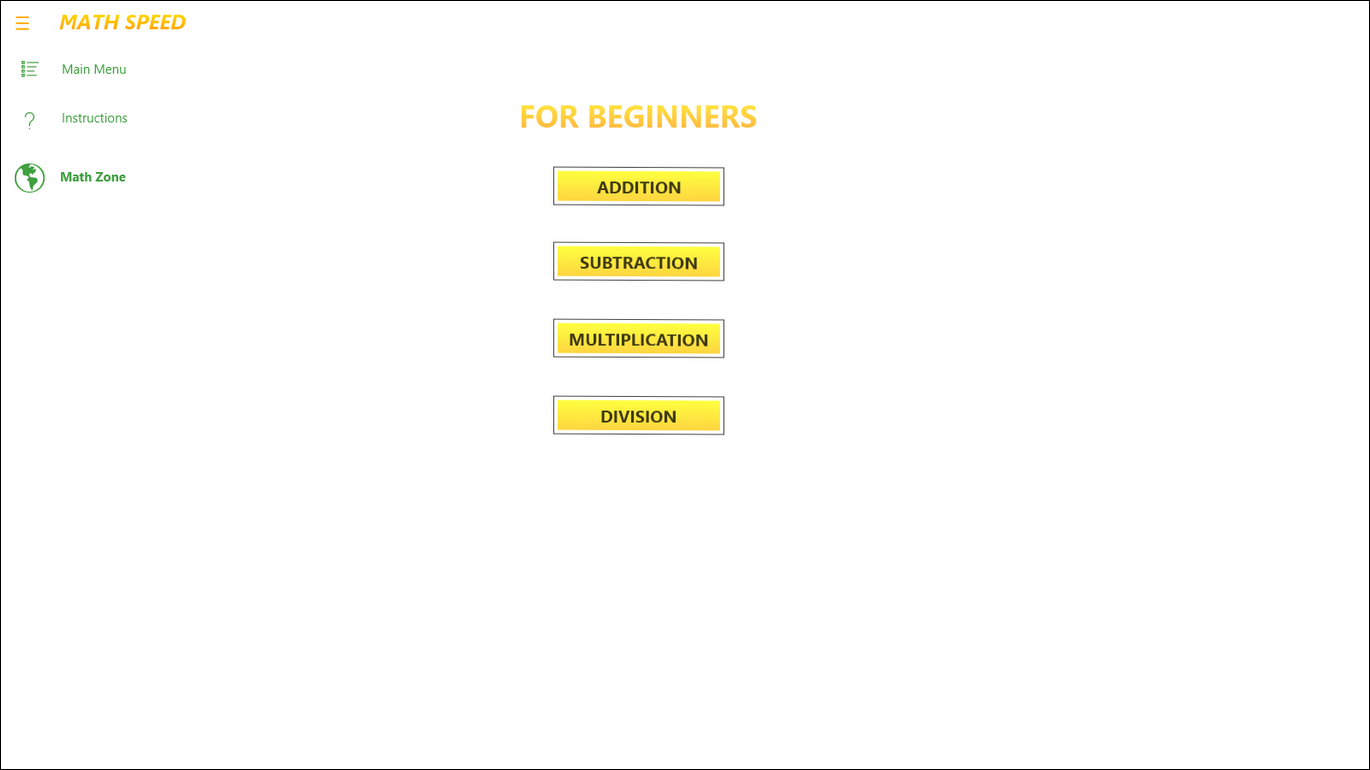 Math Speed is a basic math app that gives the player a set amount of time to solve four random problems. It has a beginners area and an area for ages 6 and up.