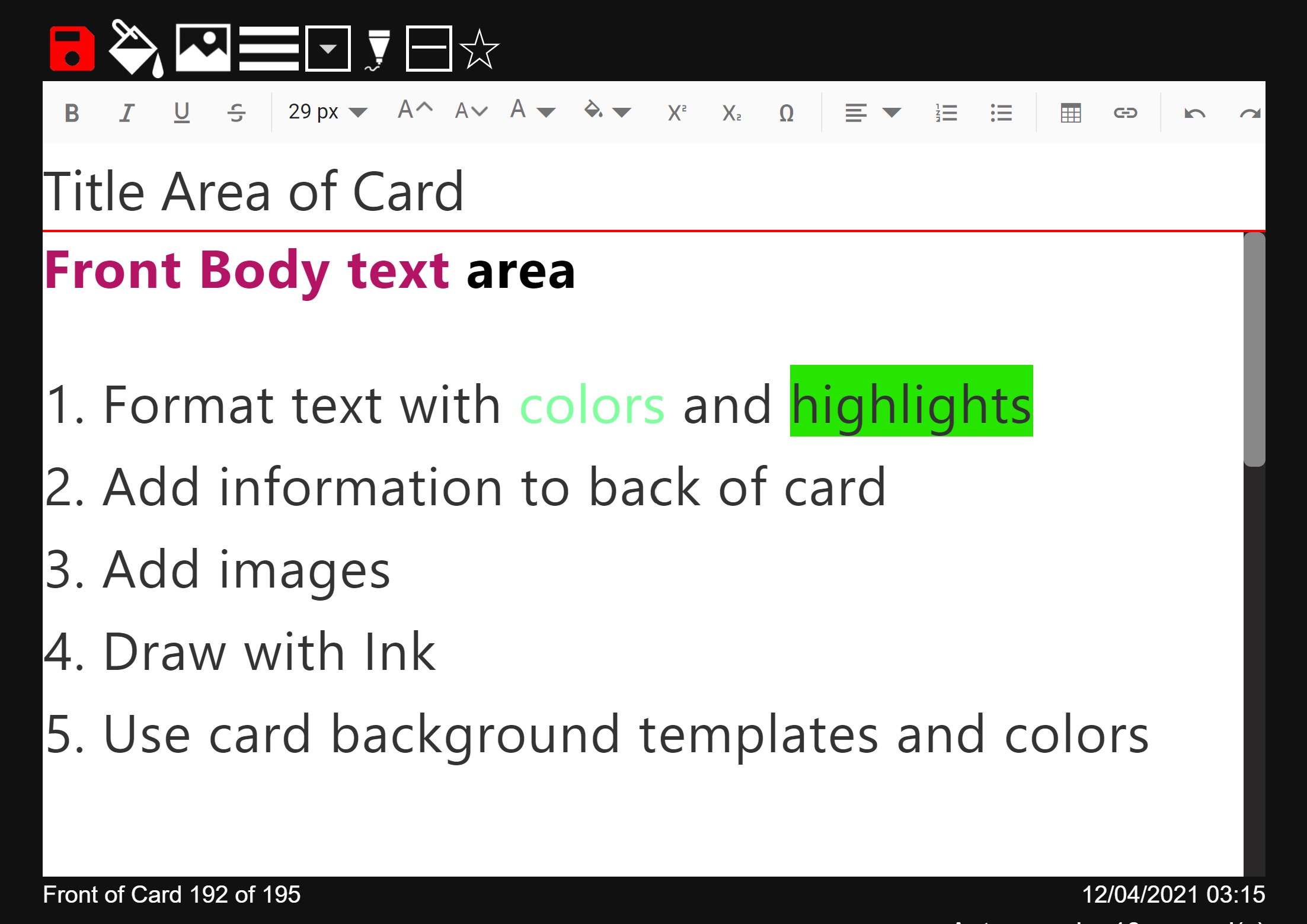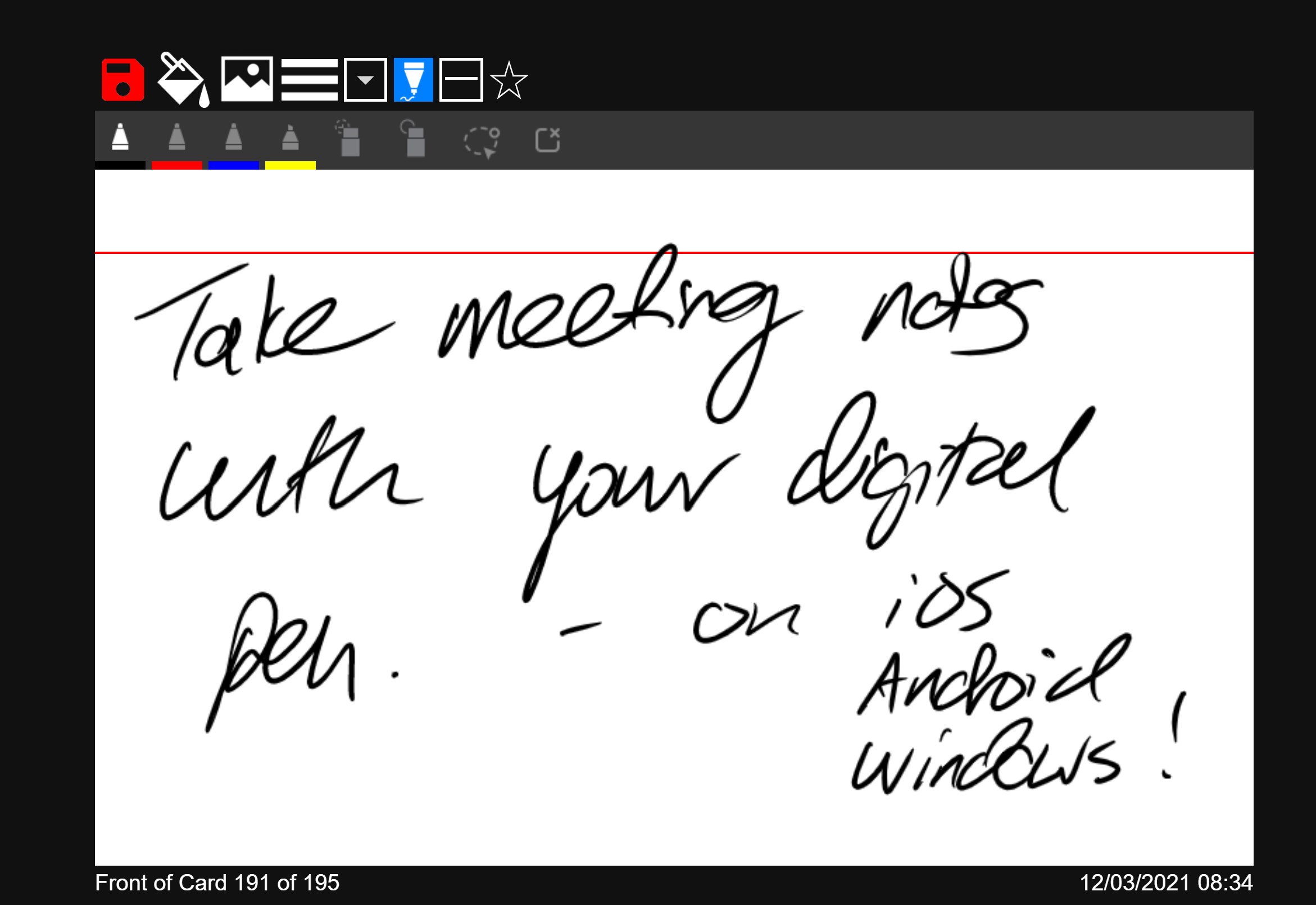 Fully immerse yourself in your note taking, interacting with your digital ink pen, mouse and keyboard. Draw or type on the front and back of cards. Zoom in and out with our zoom function to make more detailed drawings. Use for notes, ideas, lectures, flashcards, projects, storyboards, mockups... an infinite number of uses, and share with friends.