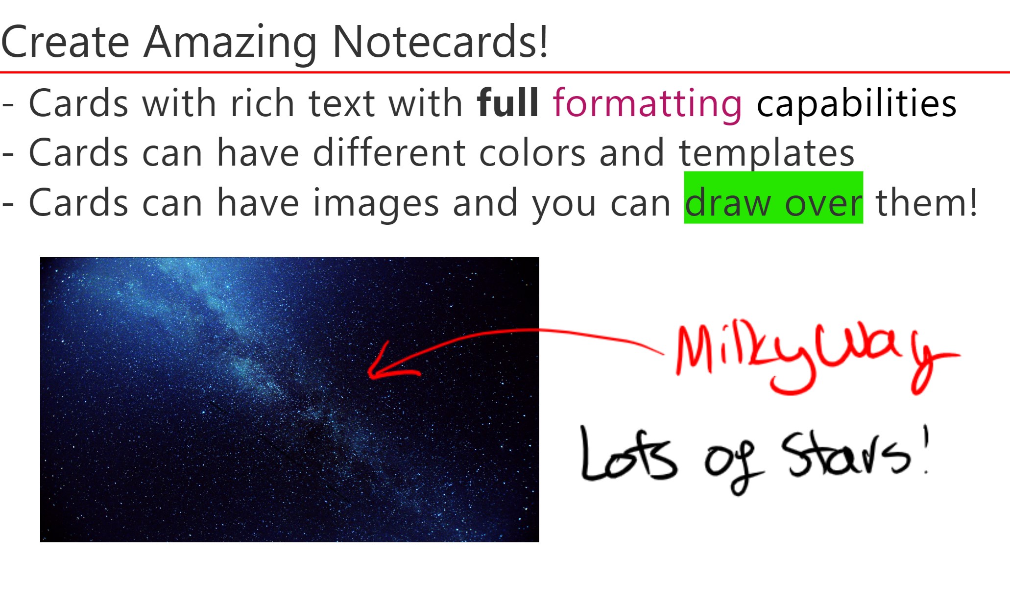 Index CardsFlashcardsInk Notes Note Taking Handwritten NotecardsDigital Ink Pen Stylus Windows Ink HandwritingTablesShare to WebPrint Index Cards Export as PDFText Formatting, Bullets, CenterCloud SyncCross Platform Apple Windows Study ModeCategory TagsGroupsImagesKanban card organizerSearch, Filter, SortFavorites, Recent CardsPC, Mac, Android, Web, iOS, SurfaceLeitner Spaced RepetitionOnline Notes, Notepad, Notebook