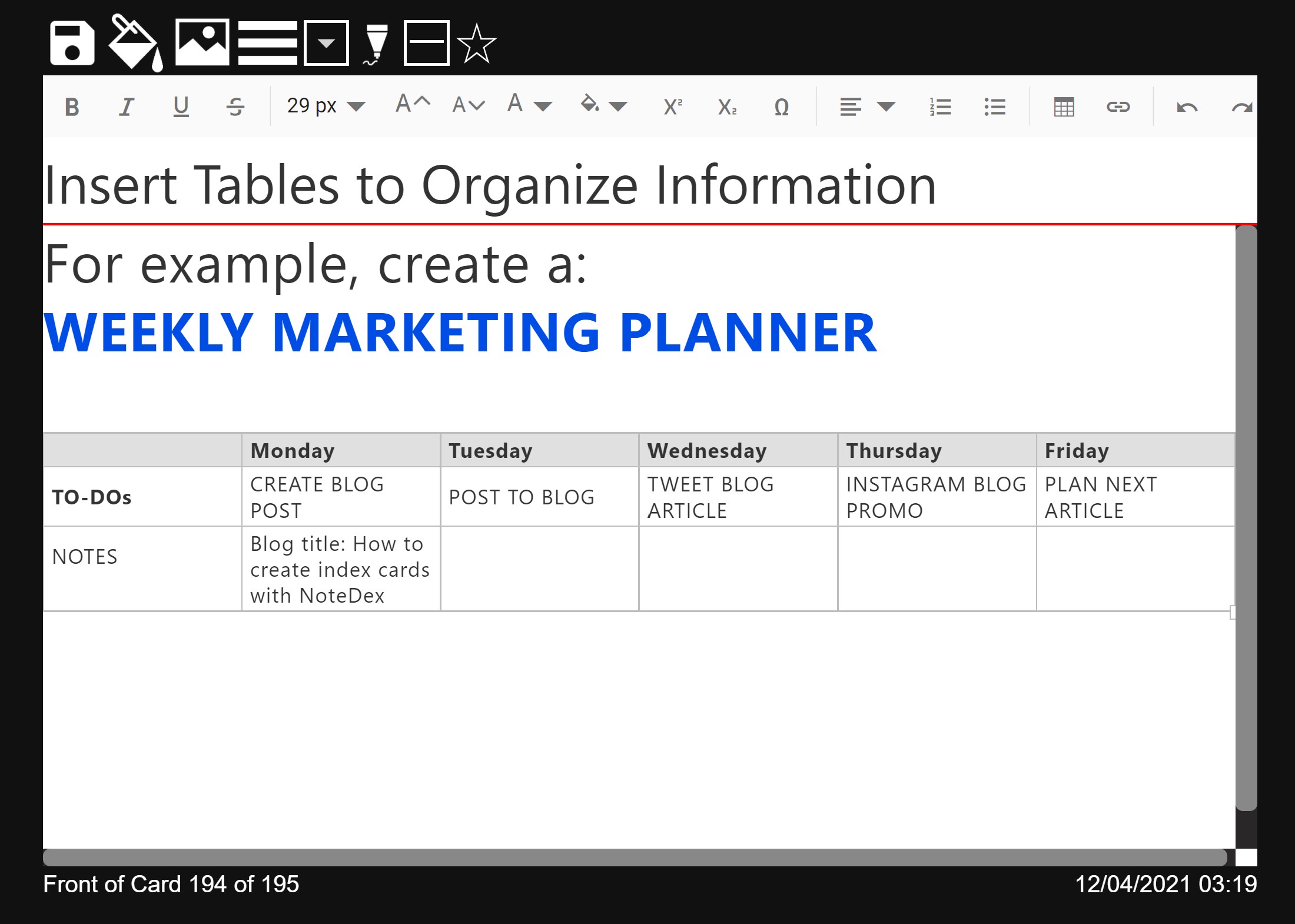 NoteDex has advanced features such as true automatic background Cloud Sync, Kanban Power Grid Organizer (Trello style), Group Folders (enhanced organization), Card Shuffle (ideal for studying flashcards), Split-screen 'film-strip' view (enhanced navigation), adjust font size, font color, color highlights, font formatting, symbols, card colors, image backgrounds and templates, Tags – both specific to a Stack and global across all Stacks, Filter, Search, Sort, Export to PDF, digital ink, tables, productivity sidebar and much more..!