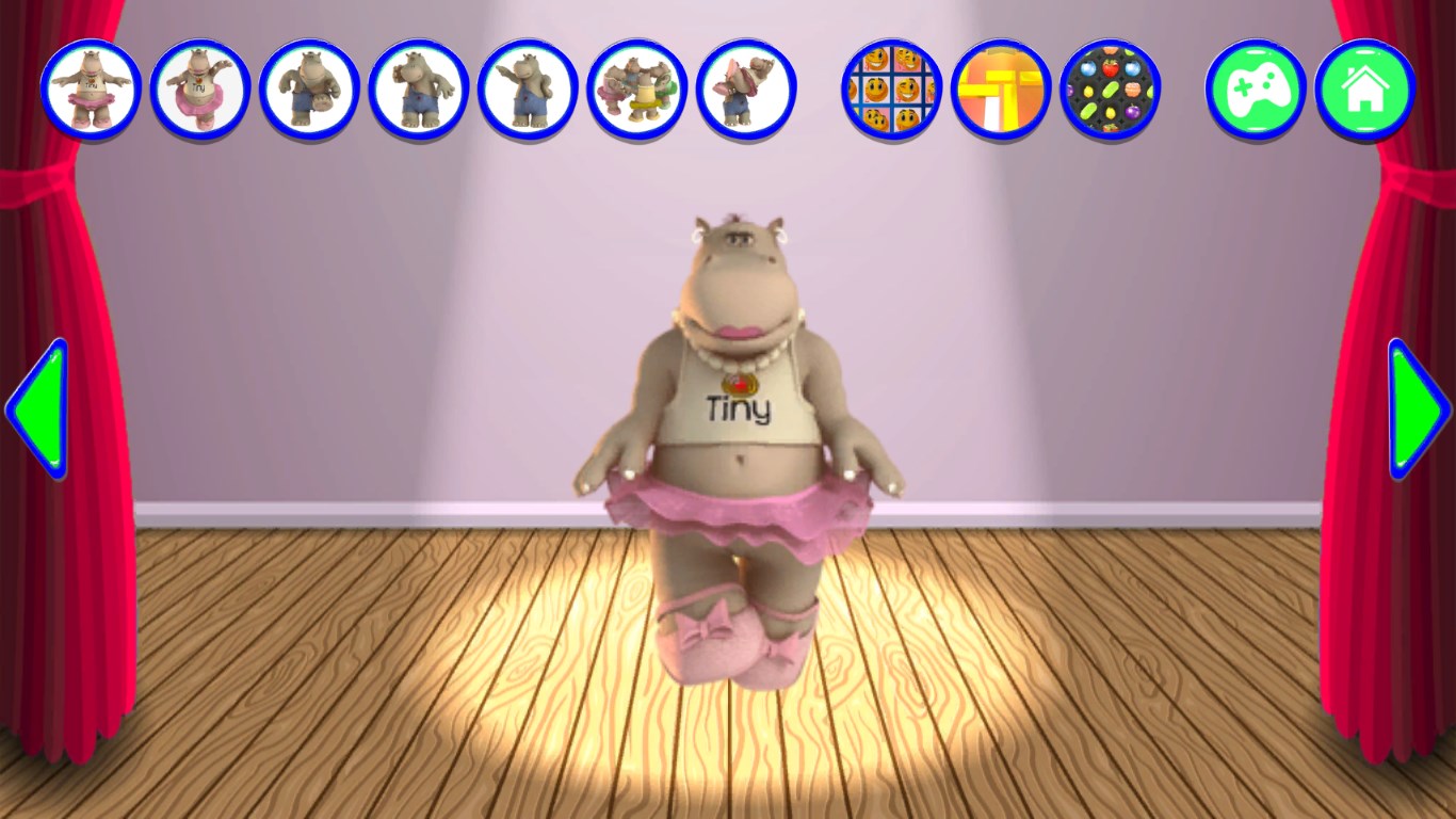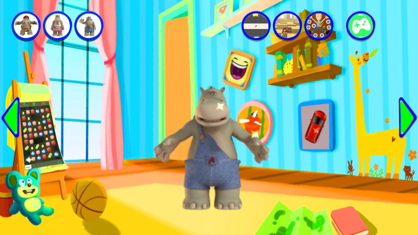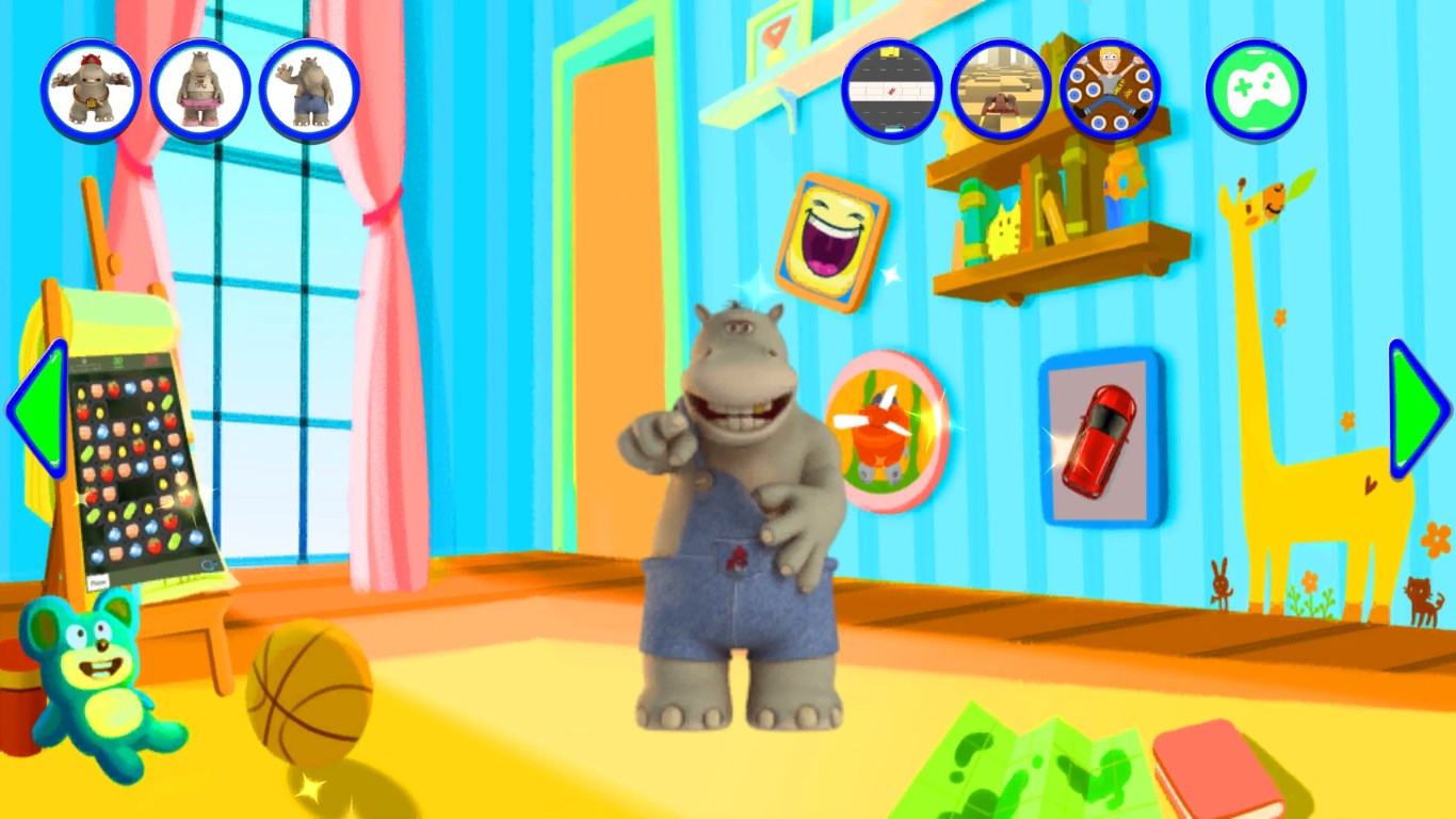 3D graphicsThe hippo repeats everything you say with a funny voiceExciting touch games with many levels like basketball flick, unblock puzzle, match- 3, racing etc.Amazing soundboard with many funny sentences, sounds from animals, guns etc.
