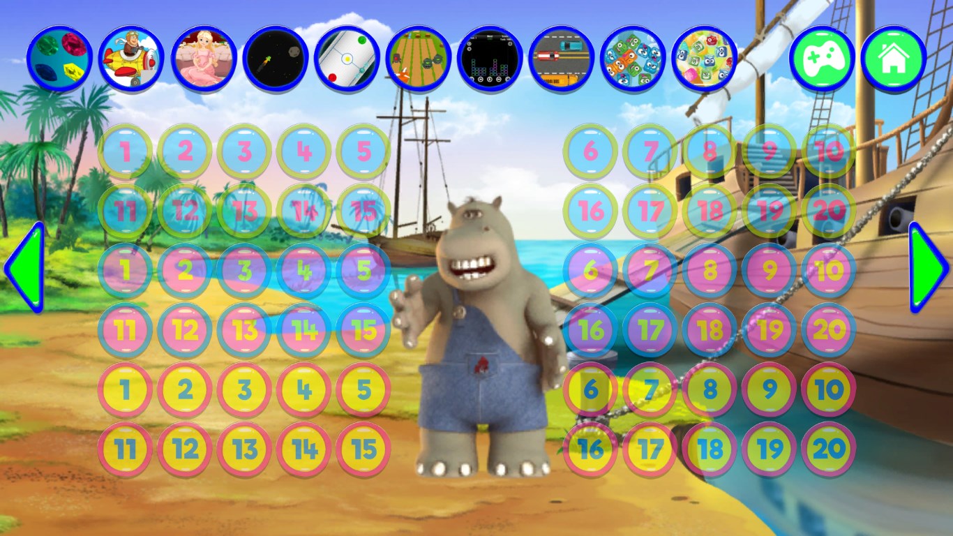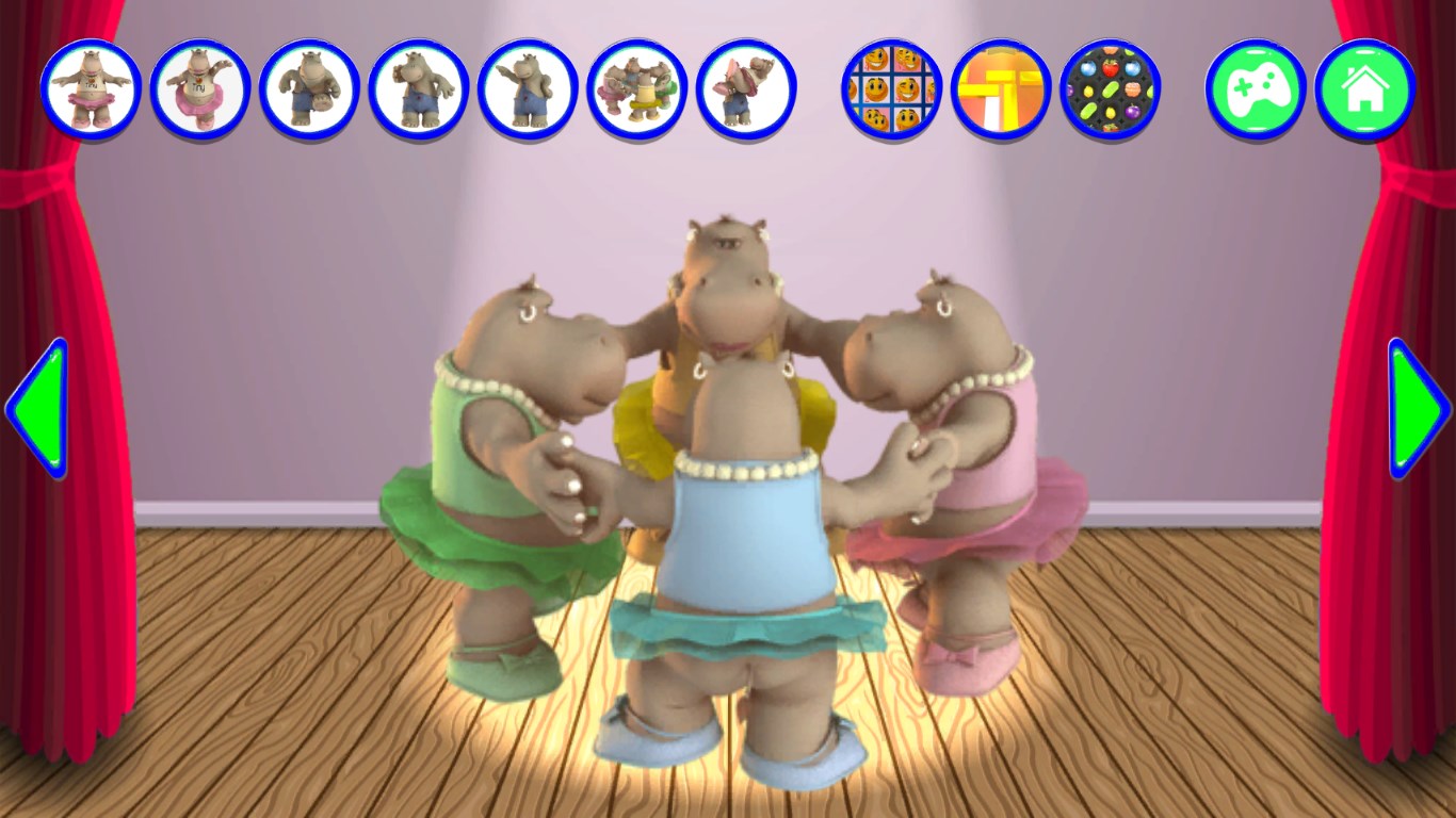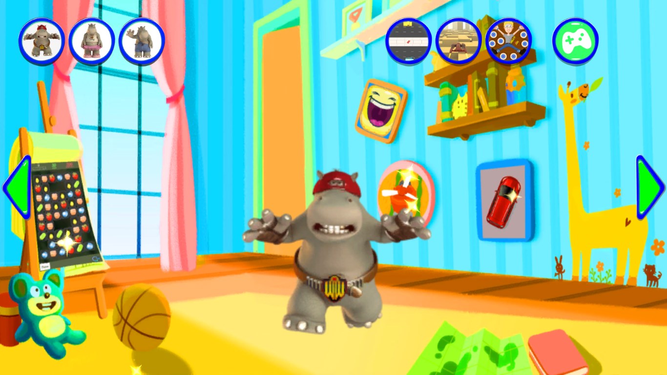 3D graphicsThe hippo repeats everything you say with a funny voiceExciting touch games with many levels like basketball flick, unblock puzzle, match- 3, racing etc.Amazing soundboard with many funny sentences, sounds from animals, guns etc.