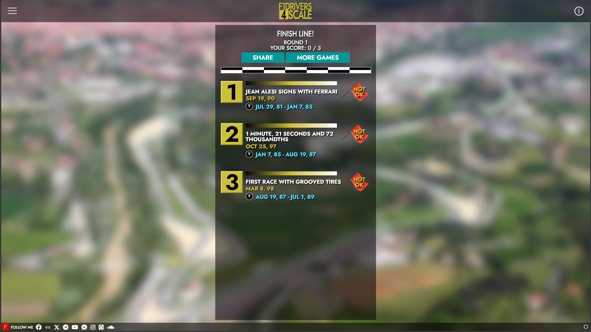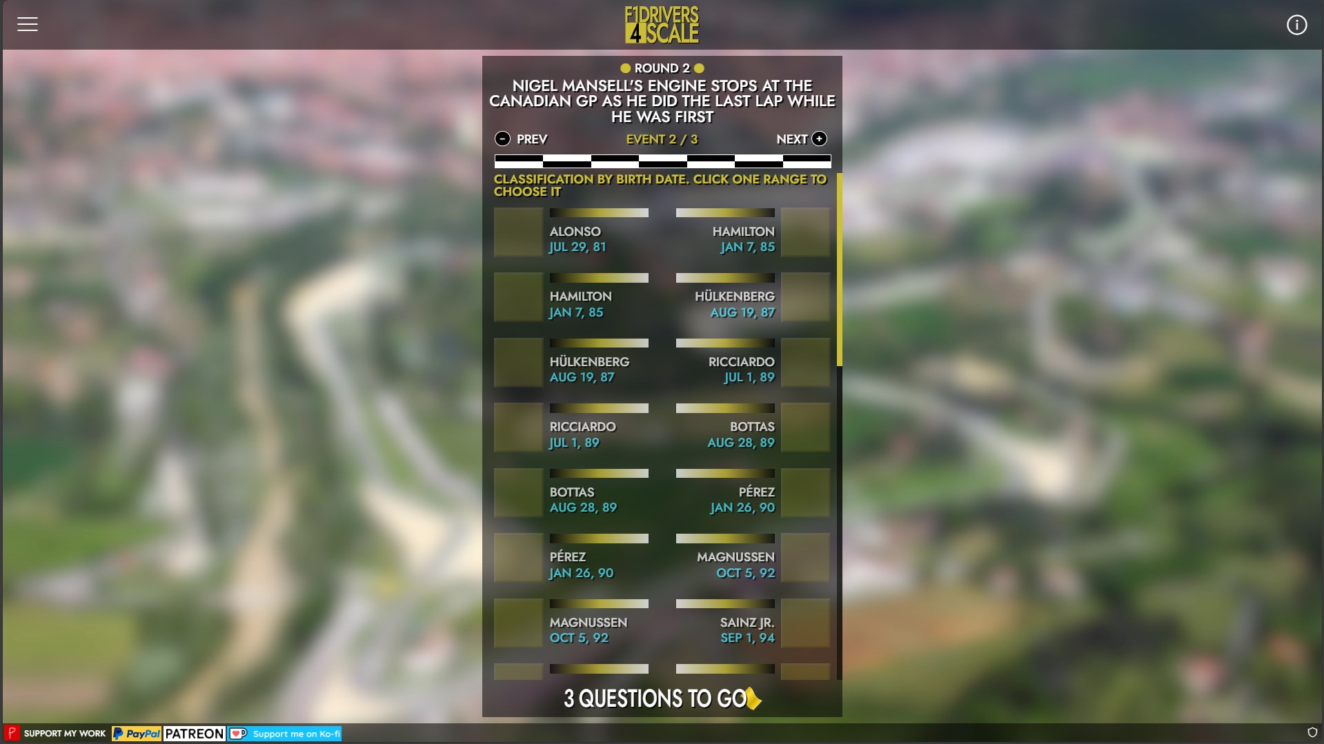 This is a daily game where you have to guess the most important events in F1 history by positioning them relative to the birth dates of the current F1 drivers: from Alonso to Bearman!