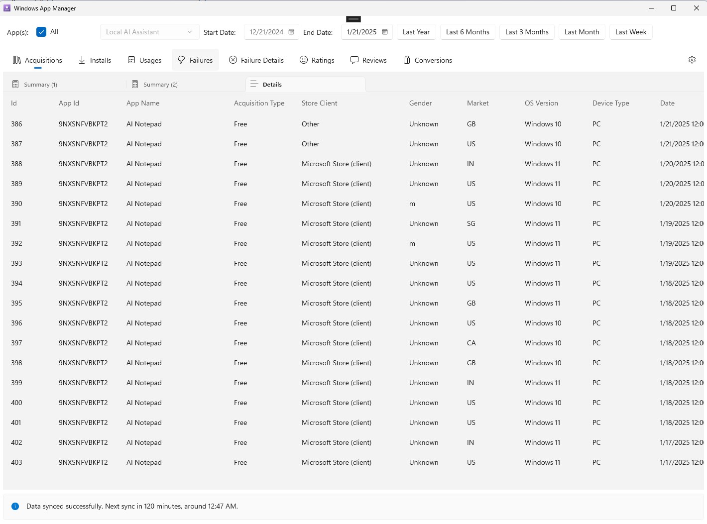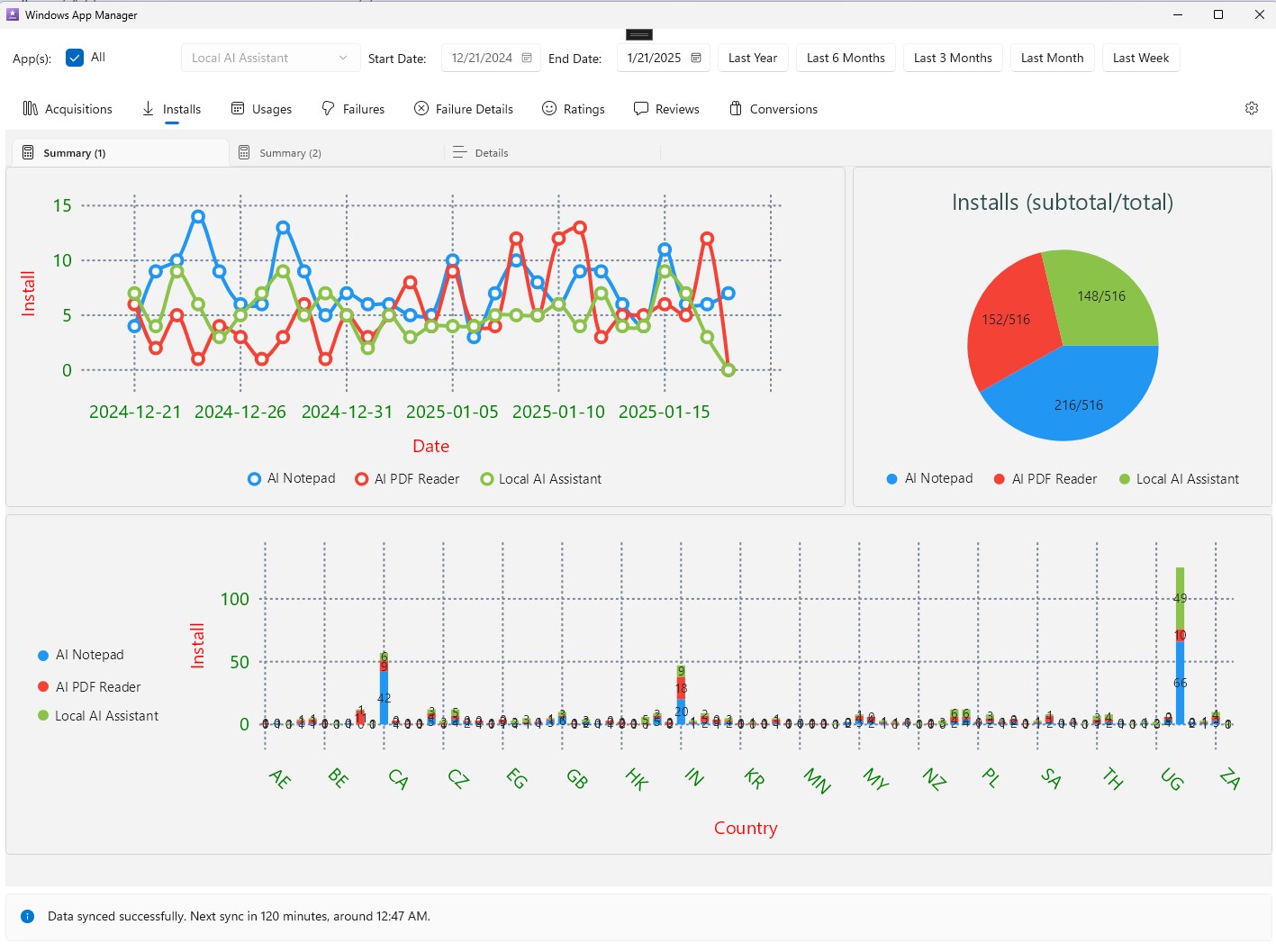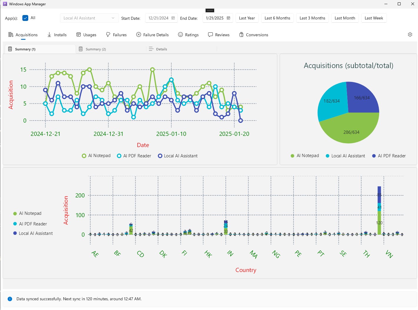 Windows App Manager is a lightweight, privacy-conscious tool for Windows app authors who publish through Microsoft Partner Center. Simply provide your Azure Tenant ID, Client ID, Client Secret, and the IDs of your published Windows apps, and the app will automatically fetch real-time analytics data—acquisitions, installs, reviews, ratings, usage, and error reports—directly from the official Microsoft Store Analytics APIs. All synced data stays on your local machine (never in the cloud), giving you full control over what is accessed and displayed. Unlike other solutions, you won’t need to share your Microsoft account credentials; Windows App Manager makes it easy to securely view and analyze your app performance in one place.