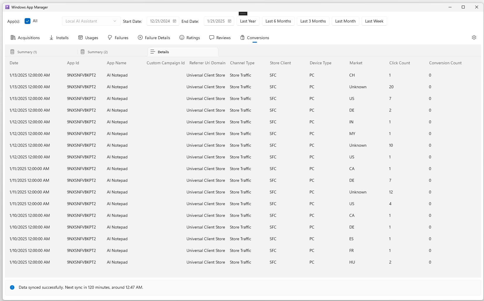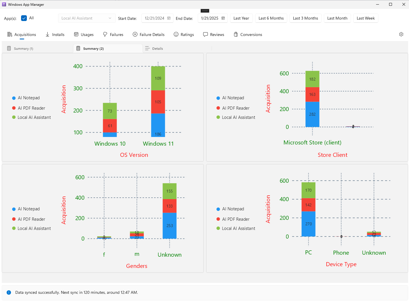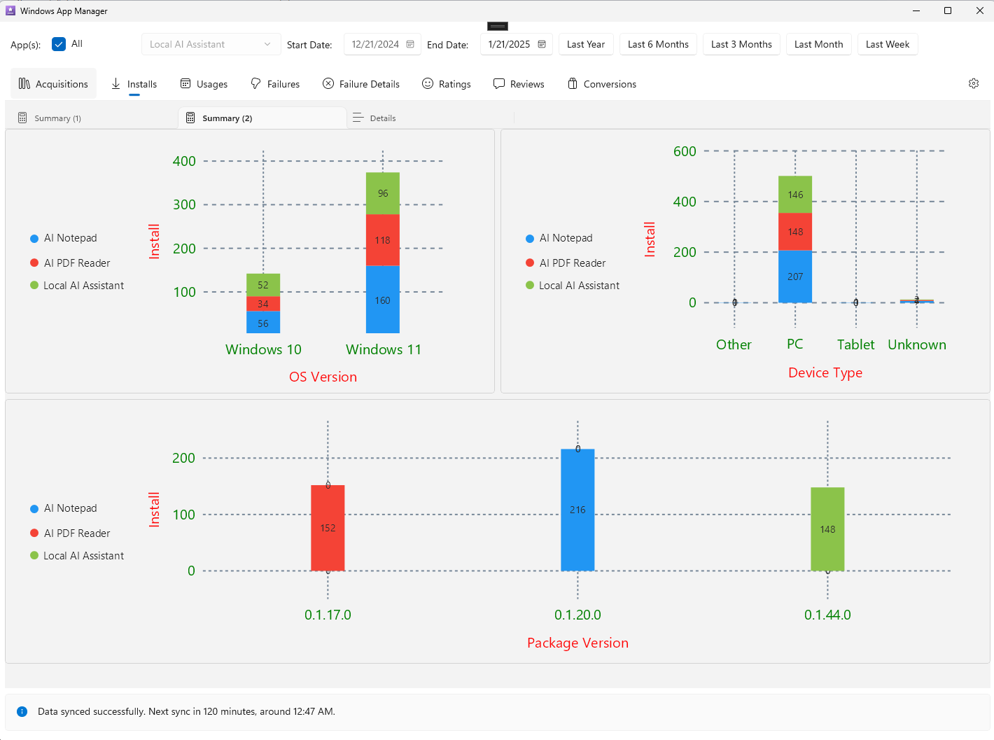 Windows App Manager is a lightweight, privacy-conscious tool for Windows app authors who publish through Microsoft Partner Center. Simply provide your Azure Tenant ID, Client ID, Client Secret, and the IDs of your published Windows apps, and the app will automatically fetch real-time analytics data—acquisitions, installs, reviews, ratings, usage, and error reports—directly from the official Microsoft Store Analytics APIs. All synced data stays on your local machine (never in the cloud), giving you full control over what is accessed and displayed. Unlike other solutions, you won’t need to share your Microsoft account credentials; Windows App Manager makes it easy to securely view and analyze your app performance in one place.