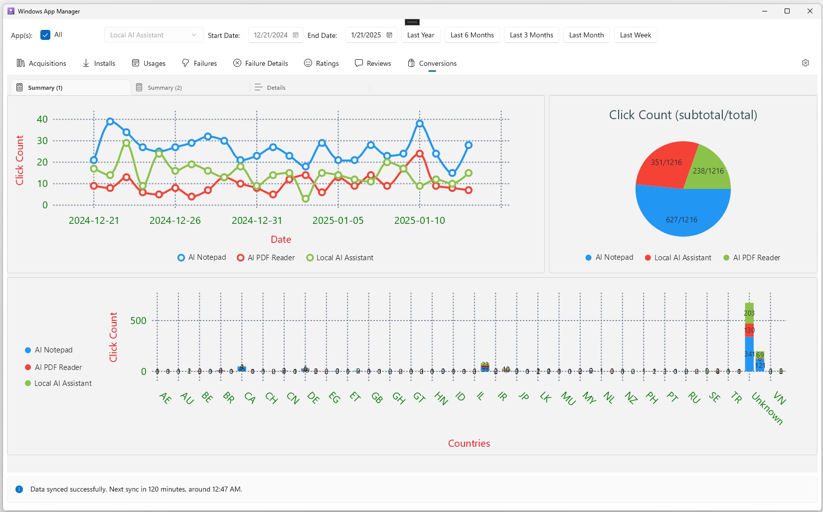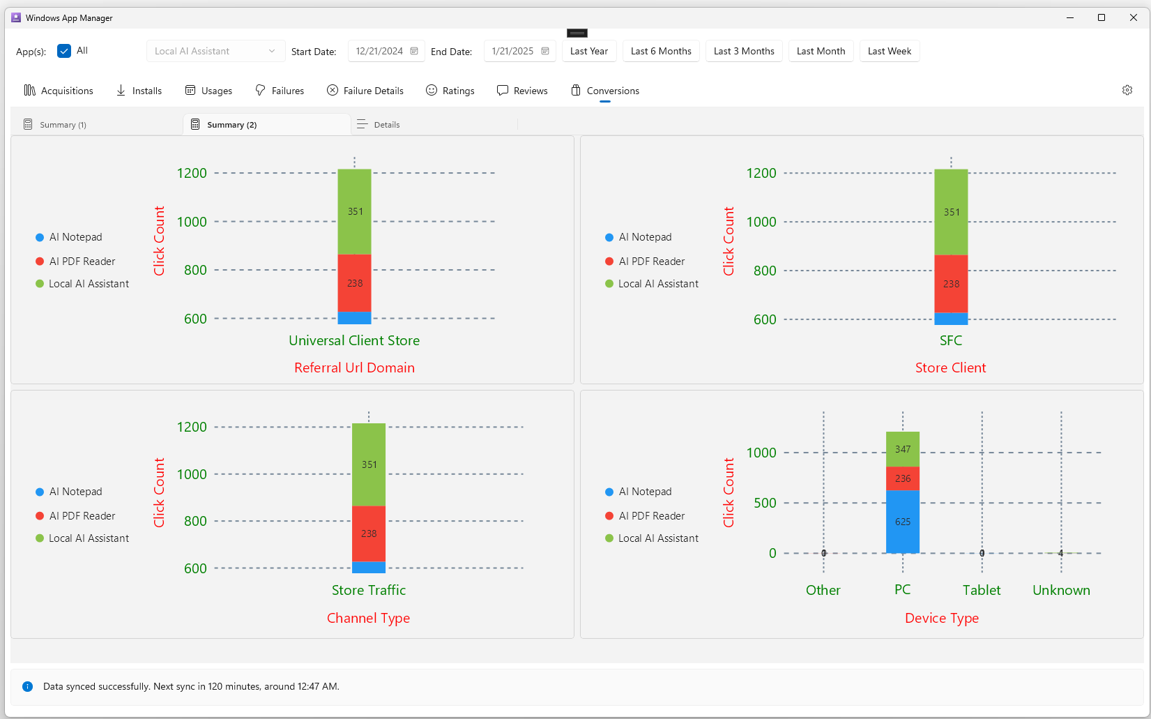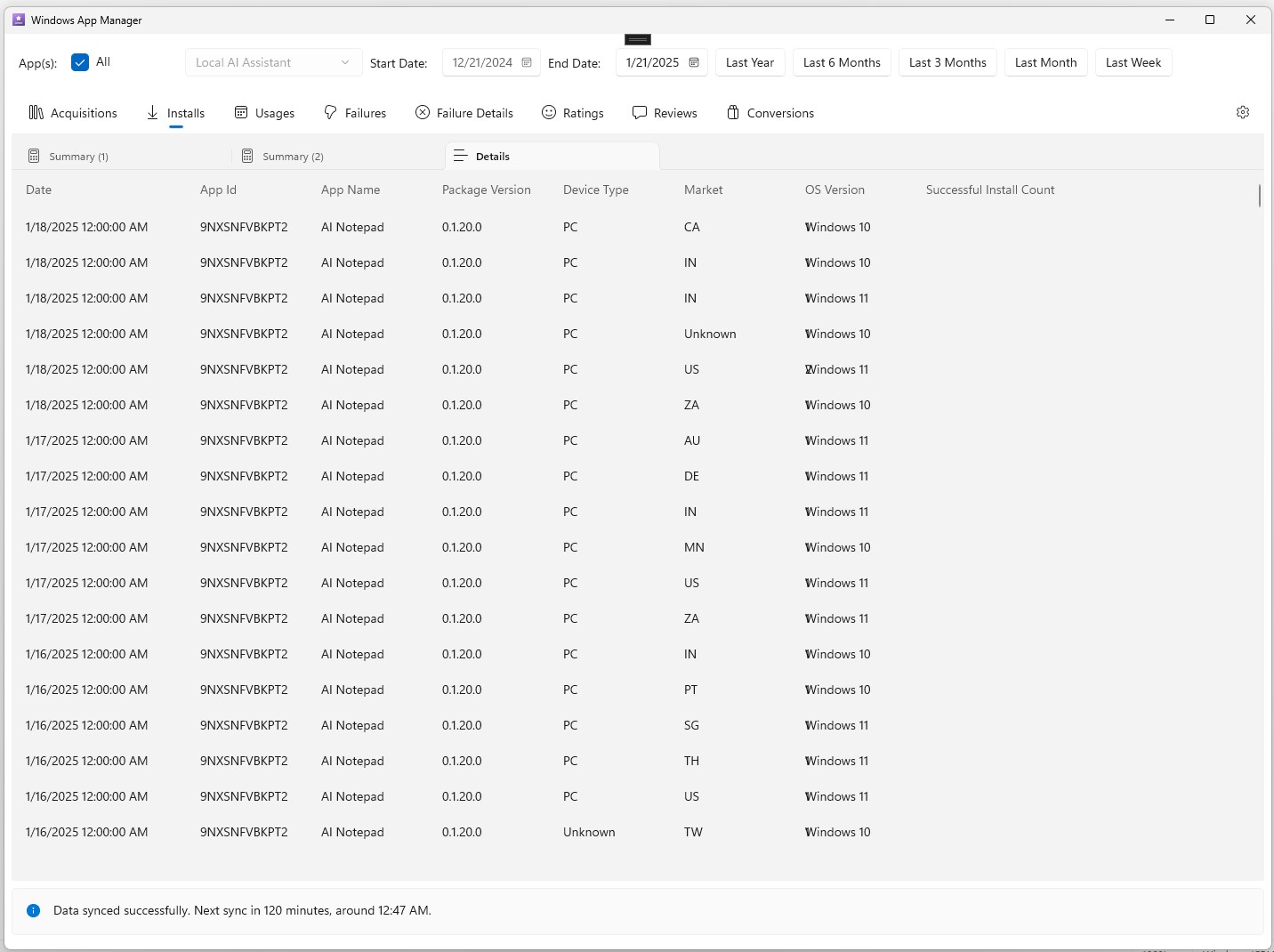 Securely retrieve app analytics directly from Microsoft Partner CenterConfigure once using Azure credentials (Tenant ID, Client ID, Client Secret)Interactive dashboards showing acquisitions, installs, usage, and error reportsDrill down with detailed lists of all synced metricsDate-range filtering for any period supported by the Partner Center APIsTrack conversions by channel (Store, campaigns, promotions, etc.)View ratings and read user reviews for each published appMonitor daily usage data (last 90 days), including session countsAutomated synchronization to fetch the latest analytics in real timeExplore error reporting data with breakdowns by OS and device typeAccess detailed stack traces for recent errors (past 30 days)Support for multiple apps in one consolidated interfacePie charts and bar graphs to visualize key performance indicatorsSee gender and country demographics (where available) for user acquisitionsCompare Windows 10 vs. Windows 11 adoption for your appsInstantly filter data by market, device type, or OS versionSecure local data storage—nothing sent to external servicesUser privacy prioritized—no Microsoft account password requiredLightweight, easy-to-navigate interface designed for quick insights