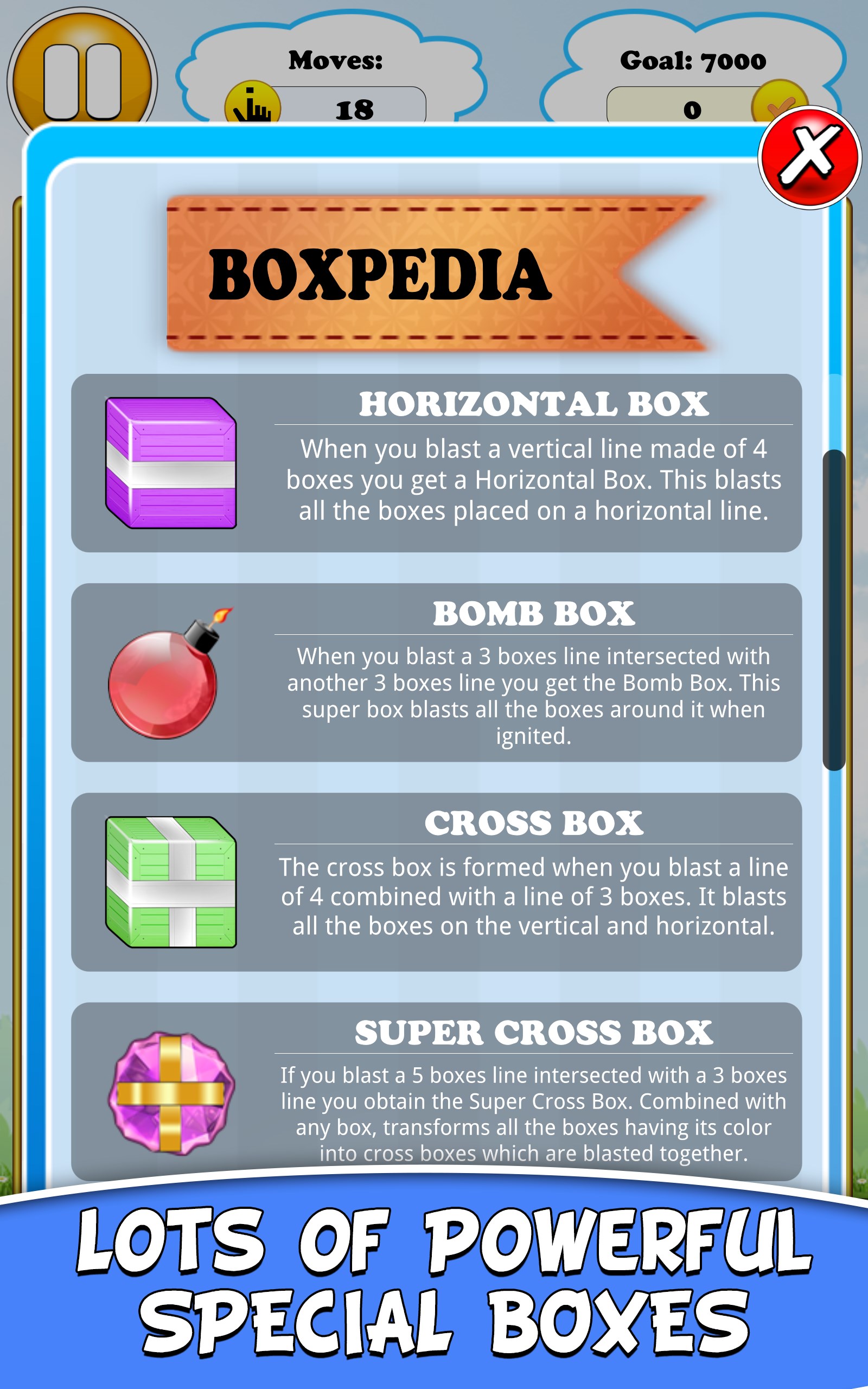 ✓ BoxPedia section, where you can read and find out more about different special boxes, treasures and obstacles