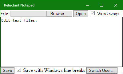 Reluctant Notepad offers a very basic text file editor across the spectrum of Windows 10 devices. The motivations for publishing this text editor are: