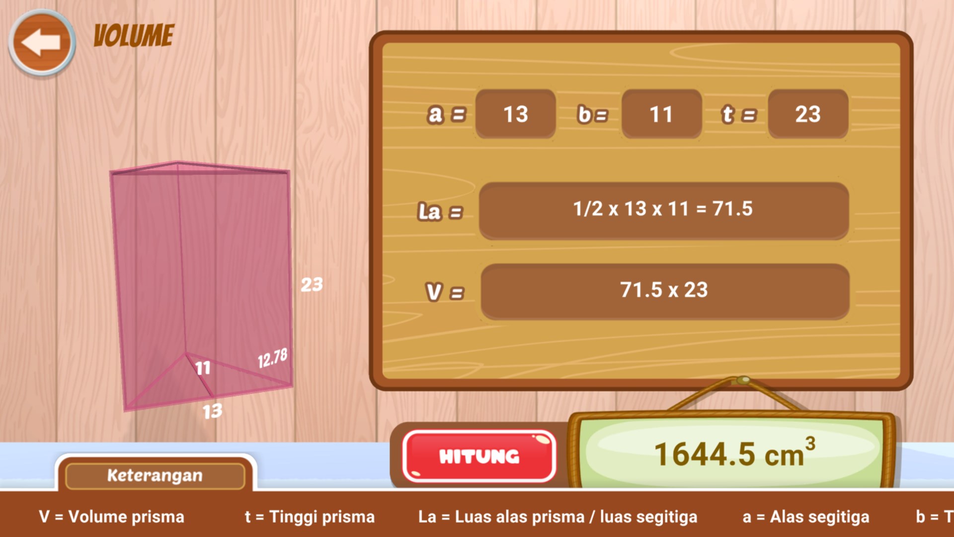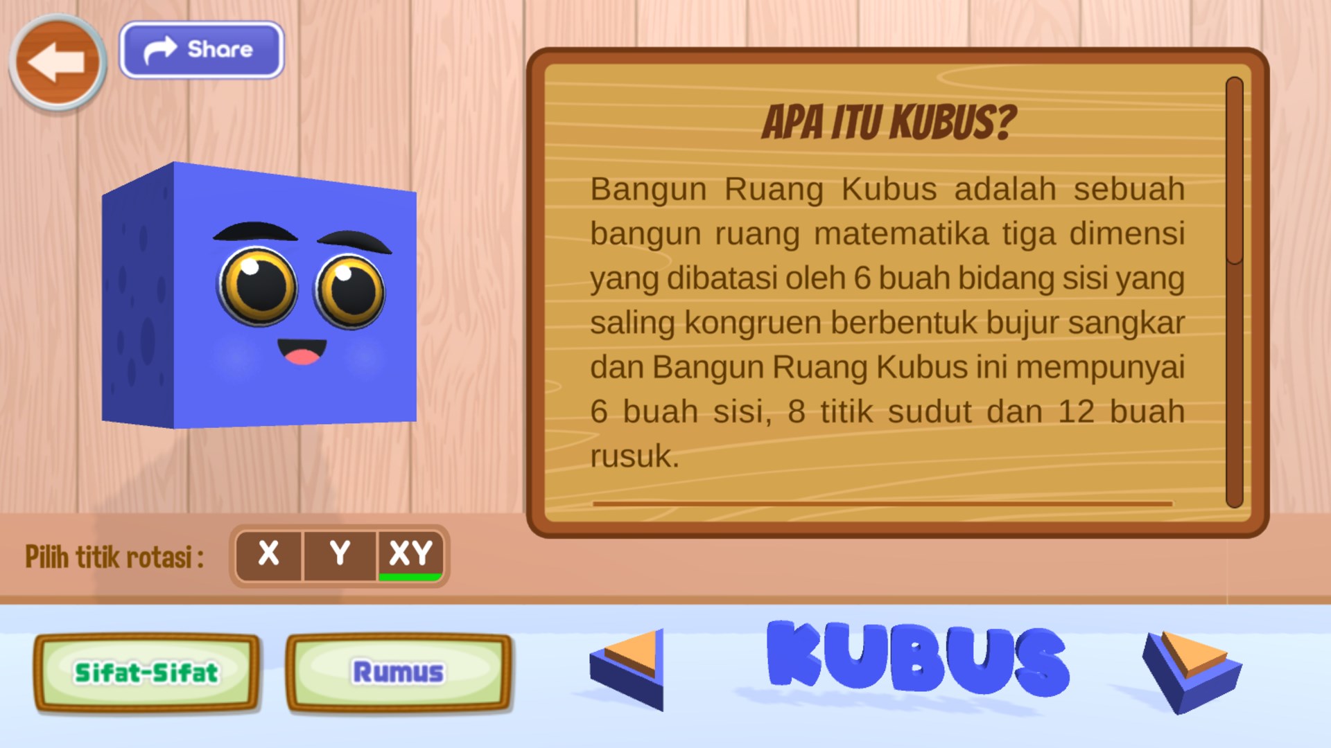 Aplikasi untuk Belajar Bangun Ruang. Disajikan secara menarik dengan tampilan 3 dimensi dan simulasi hitung bangun ruang. Materi berisi 6 Bangun Ruang yaitu: Kubus, Balok, Prisma, Limas, Tabung, Kerucut, dan Bola. Setiap bangun ruang terdapat materi yang cukup lengkap: