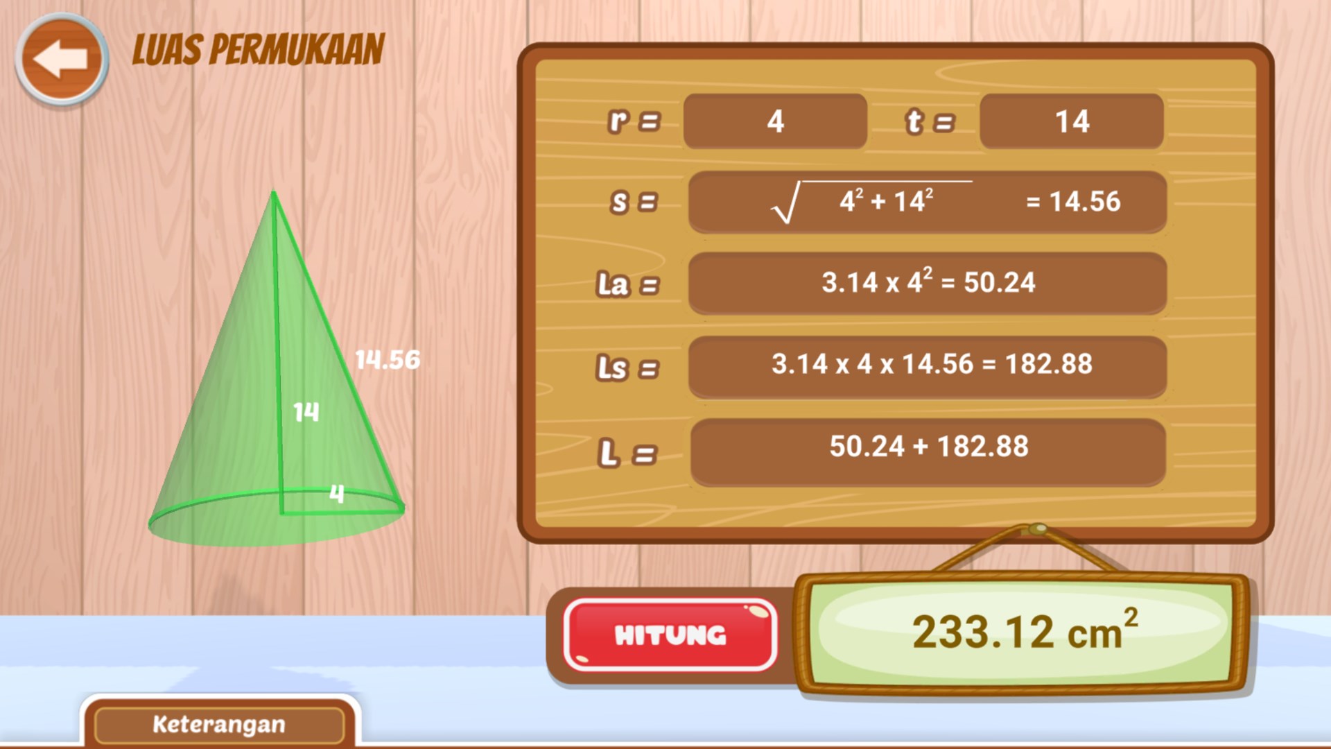Selain materi yang sangat lengkap, terdapat simulasi hitung, untuk menghitung luas permukaan bangun ruang, dan menghitung luas volume bangun ruang. Dalam simulasi ditampilkan cukup detail dari proses perhitungan menggunakan rumus, hingga hasil perhitungannya.