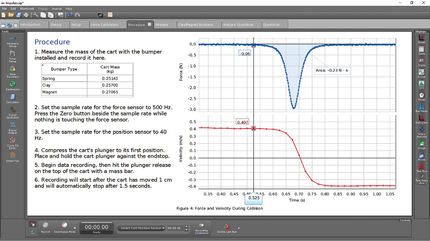 Data is collected and displayed in real time on a graph or your choice of display type. Use Capstone in the basic graph/table mode or choose to configure your own workspace with any of the many displays available.