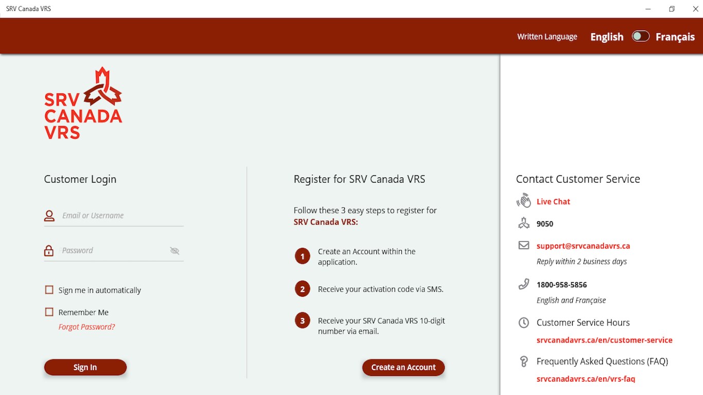 The SRV Canada VRS app is an accessible telecommunications application. You must be Canadian to register. The app is free to registered customers who are Deaf, hard of hearing or speech-impaired and use sign language. The app allows Canadians to connect to sign language interpreters to make telephone calls in either English and ASL (American Sign Language) or French and LSQ (langue des signes québécois). Before use, download the app on your computer or laptop and connect with SRV Canada VRS.