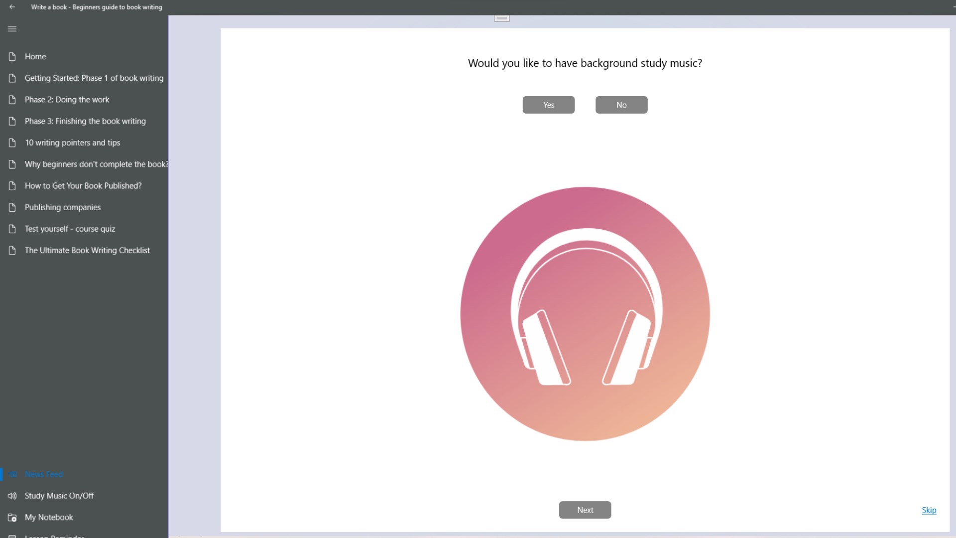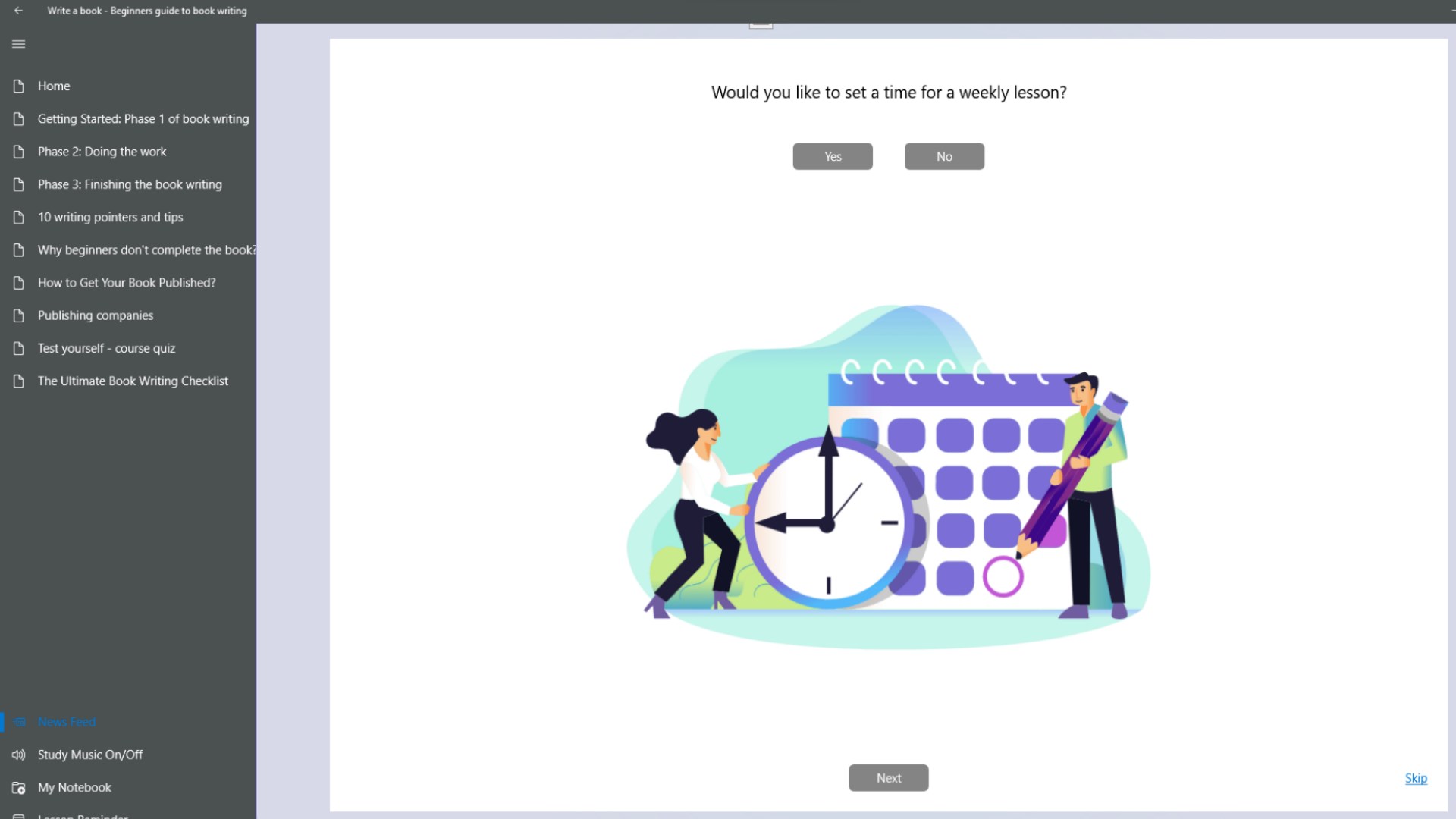 Use the in-app notebook to start writing your book.Use the in-app scheduling system to help you complete the journey.Getting Started: Phase 1 of book writing - planning your bookPhase 2: Doing the work - the process of book writingPhase 3: Finishing the book writing - understand what to pay attention to when finalizing a book10 writing pointers and tipsWhy some beginners never complete the book?How to Get Your Book Published?Publishing companiesTest yourself - course quizThe Ultimate Book Writing Checklist - interactive in-app checklistAudio playerGoal-Setting questioneerLive news feed