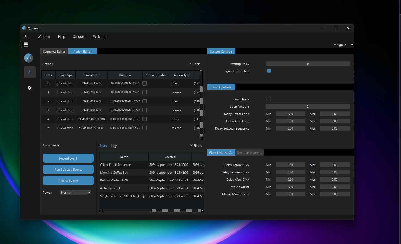 - Advanced Controls: Take full control with adjustable settings like mouse move speed, click delays, and offsets. Customize actions globally or fine-tune individual actions with the Action Editor.