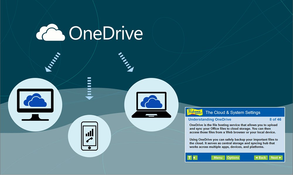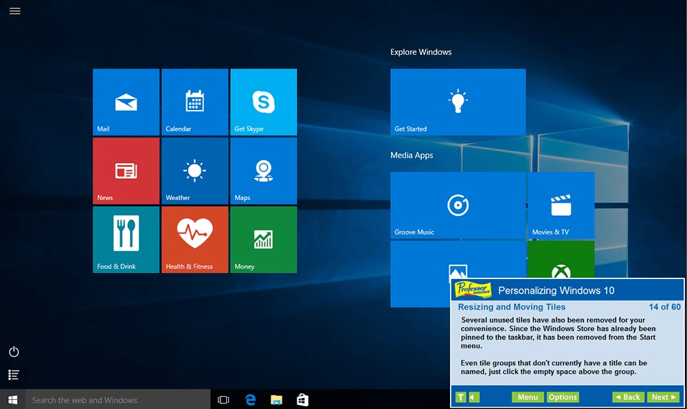 Professor Teaches, the leading brand of training, provides realistic, interactive, and complete training for Windows 10. Build your skills with Professor Teaches tutorials and learn everything you’ll need, from beginning to advanced lessons. Each interactive tutorial is organized for fast and easy learning with practical exercises that build skills quickly and effectively. Windows 10 offers a new interface and features to connect users with their information and people from multiple Windows 10 devices. The Start Menu is back in this new operating system, along with many new features. Professor Teaches Windows 10 trains users on this new interface and teaches them all of the features in Windows 10. Learn to Use All the Features of Windows 10 — Build Your Skills & Increase Your Productivity Windows 10 allows you to access and share your information in new ways when you learn the new features from Professor Teaches. This comprehensive training tutorial with over 60 lessons will show you how to navigate Windows 10, including using the Start Menu, how to access new Action Center notifications, using universal apps, new controls for minimizing, maximizing, and closing apps, using the personal assistant Cortana, navigating Edge, the new world of internet browsing, using virtual desktops, organizing your workspace with multiple desktops, using navigation continuum, and more! This fully interactive and complete tutorial is organized for fast and easy learning with practical exercises to help you build new skills and become proficient using Windows 10. Windows 10 — over 60 lessons! Adding and Changing User Accounts Introduction to Apps Getting to Know the Windows Store Getting Help Shutting Down your Computer Using Windows 10 on Touch Devices Understanding Gestures Getting to Know the Desktop Exploring the Taskbar Customizing the Taskbar Using Task View Managing Multiple Windows Creating Shortcuts