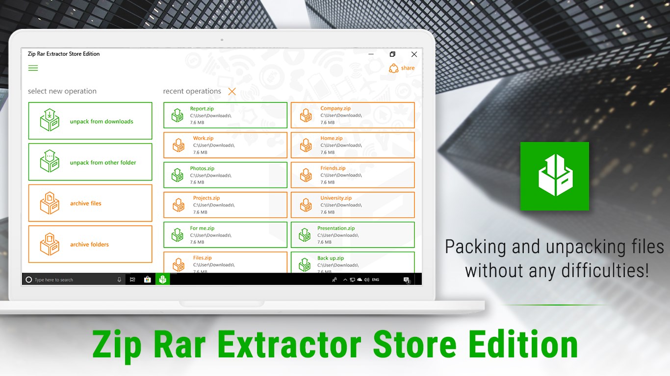 Zip Rar Extractor Store Edition is the fastest and the simplest archiver. Our application is built using .NET technology, ensuring a robust, scalable, and efficient foundation for delivering high-quality performance and features. Pack or unpack your files, photos, videos or music in the easiest way!