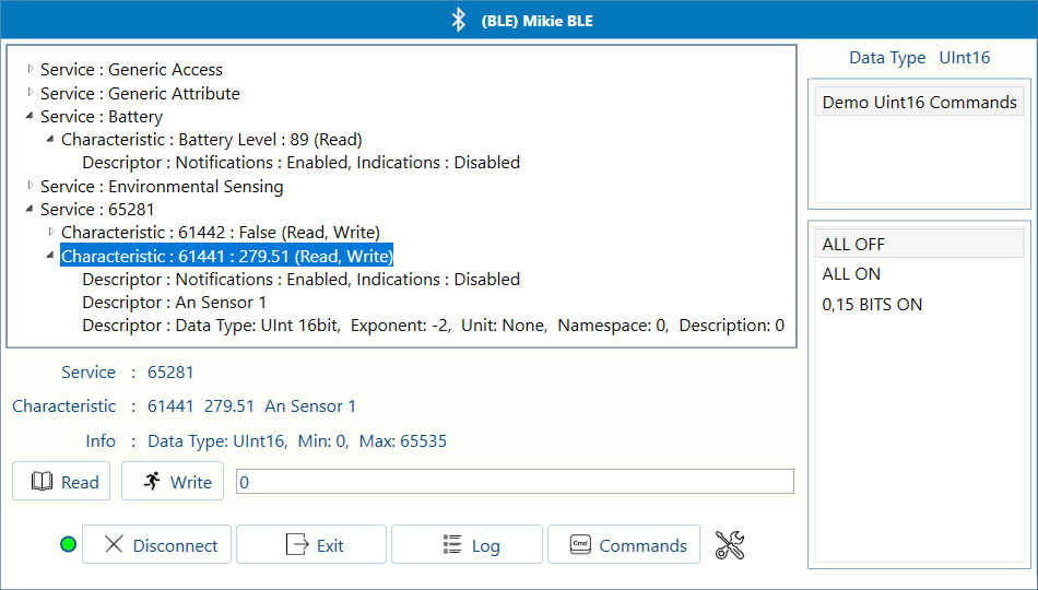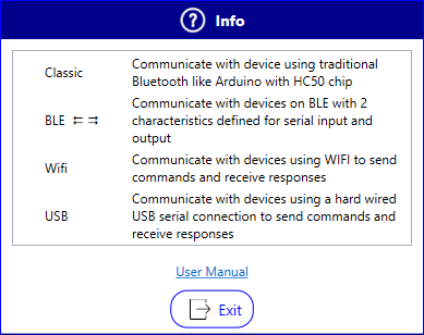 Bluetooth Low Energy (BLE), Bluetooth Classic, USB, WIFI, Ethernet terminal program to remotely control devices such as Arduinos using text based messaging.