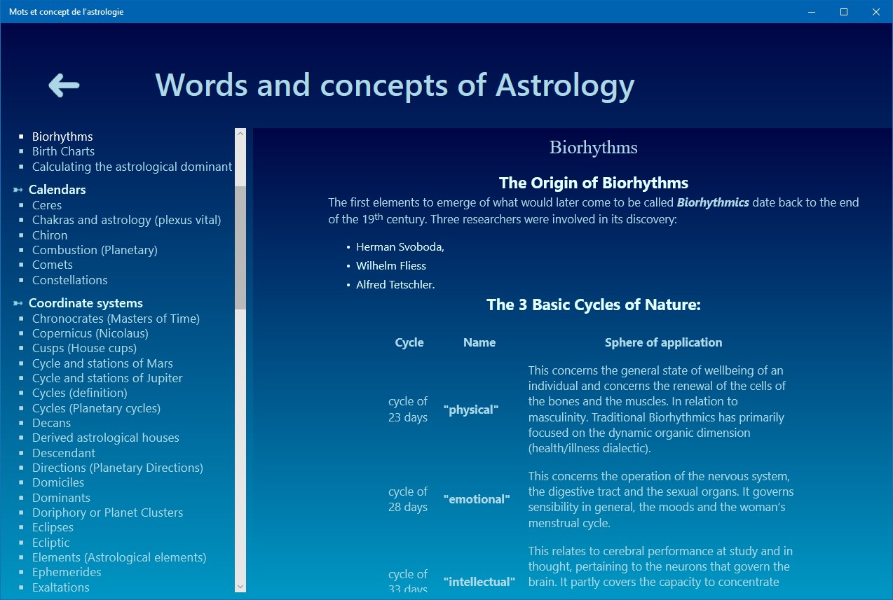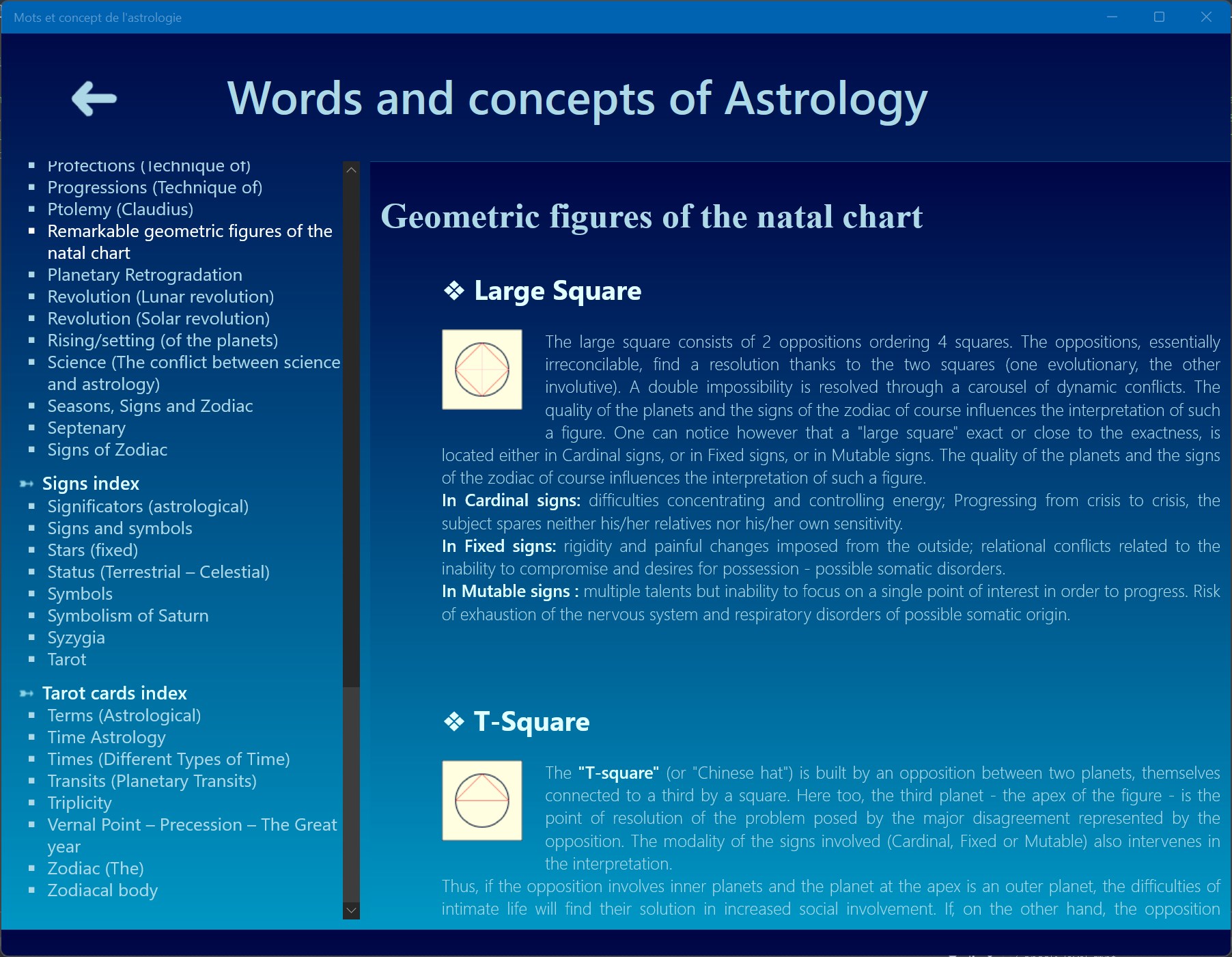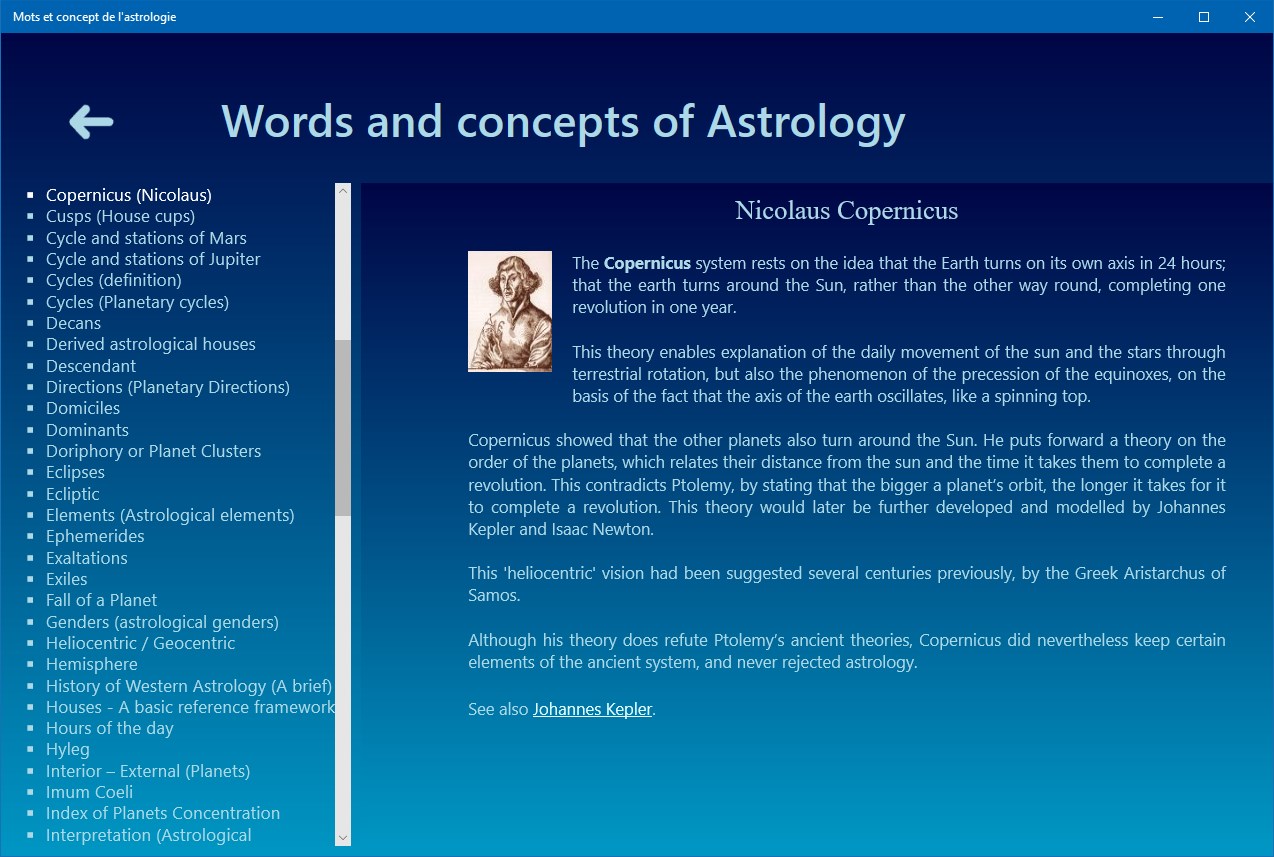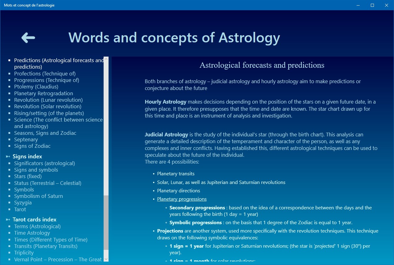 Aestheric Archetypes of the astrological signs, Ages of life and the chronocracy, Angels, Alchochoden, Anaret, Anaretic degree(s), Angular (houses), Angular relationships of Jupiter and Saturn, Antisces and anti-antisces, Aphelion – Perihelion, Application - Separation of Astrological Aspects, Ascendant, Astral Affinities, Astrological Aspects, Austral signs, Axis - Houses - Domification, Biorhythms, Birth Charts, Boreal signs, Cadents (houses), Calculating the astrological dominant, Gregorian Calendar, Egyptian Sothic Calendar, Julian Calendar, Lunar Calendar, Solar Calendar, Celestial pole, Ceres, Chakras and astrology (plexus vital), Chiron, Combustion (Planetary), Comets, Constellations, Consultation (astrological), Astronomical Coordinates, Ecliptic Coordinates, Equatorial Coordinates, Geographic Coordinates, Chronocrates (Masters of Time), Copernicus (Nicolaus), Cusps (House cups), Cycle and stations of Mars, Cycle and stations of Jupiter, Cycles (definition), Cycles (Planetary cycles), Decans, Derived astrological houses, Descendant, Directions (Planetary Directions), Dignity, Diurnal (birth - theme), Domiciles, Dominants, Doriphory or Planet Clusters, Eclipses, Ecliptic, Elements (Astrological elements), Ephemeris, Exaltations, Exiles, Fall of a Planet, Genders (astrological genders, Geomancy, Geometric figures of the natal chart, Heliocentric / Geocentric, Hemisphere, History of Western Astrology (A brief), Houses, Hours of the day, Hyleg, Interior – External (Planets), Imum Coeli, Index of Planets Concentration, Interpretation (Astrological interpretation), Inter-cycles, Judicial Astrology, Karma and astrology, Kepler (Johannes), Learning and studying Astrology, Luminaries, Masters, mastery and domiciles, Medical Astrology, Meton cycle, Midheaven, Midpoints, Mutual reception, Nocturnal birth (theme), North Knot – South Knot, Numerology, Nutation, Orbs (Aspects Orbs), Orbits (Planetary Orbits), Parts (Arabic or astrological Parts), Peregrine Planets, Perihelion - Aphelion, Phases of the Moon, Planets, Sun, Moon, Mercury, Venus, Mars, Jupiter, Saturn, Uranus, Neptune, Pluto, The Black Moon, Medical Astrology, Predictions (Astrological forecasts and predictions), Profections (Technique of), Progressions (Technique of), Converse progressions, Ptolemy (Claudius), Planetary Retrogradation, Reception (single), Revolution (Lunar revolution), Revolution (Solar revolution), Right Ascension, Rising/setting (of the planets), Science (The conflict between science and astrology), Seasons, Signs and Zodiac, Septenary, Sidereal year, Signs of Zodiac, Aries, Taurus, Gemini, Cancer, Leo, Virgo, Libra, Scorpio, Sagittarius, Capricorn, Aquarius, Pisces, Sidereal time, Significators (astrological), Signs and symbols, Stars (fixed), Status (Terrestrial – Celestial), Successor (houses), Symbols, Symbolism of Saturn, Symbolism of uranus, Symbolism of neptune, Symbolism of pluto, Synodique lunation, Syzygia, Tarot, The Fool (the Beggar), Arcana 1 - The Juggler, Arcana 2 - The High Priestess, Arcana 3 - The Empress, Arcana 4 - The Emperor, Arcana 5 - The Pope, Arcana 6 - The Lovers, Arcana 7 - The Chariot, Arcana 8 - Justice, Arcana 9 - The Hermit, Arcana 10 - The Wheel of Fortune, Arcana 11 - Fortitude, Arcana 12 - The Hanged Man, Arcana 13 - Death, Arcana 14 - Temperance, Arcana 15 - The Devil, Arcana 16 - The Tower, Arcana 17 - The Stars, Arcana 18 - The Moon, Arcana 19 - The Sun, Arcana 20 - Judgement, Arcana 21 - The World, Tarot tirages, Terms (Astrological), Time Astrology, Times (Different Types of Time), Time Zones, Transits (Planetary Transits), Triplicity, Trigonocracy, Vernal Point – Precession – The Great year, Vertex (The), Yod (The), Zenith (The), Zodiac, Zodiacal body