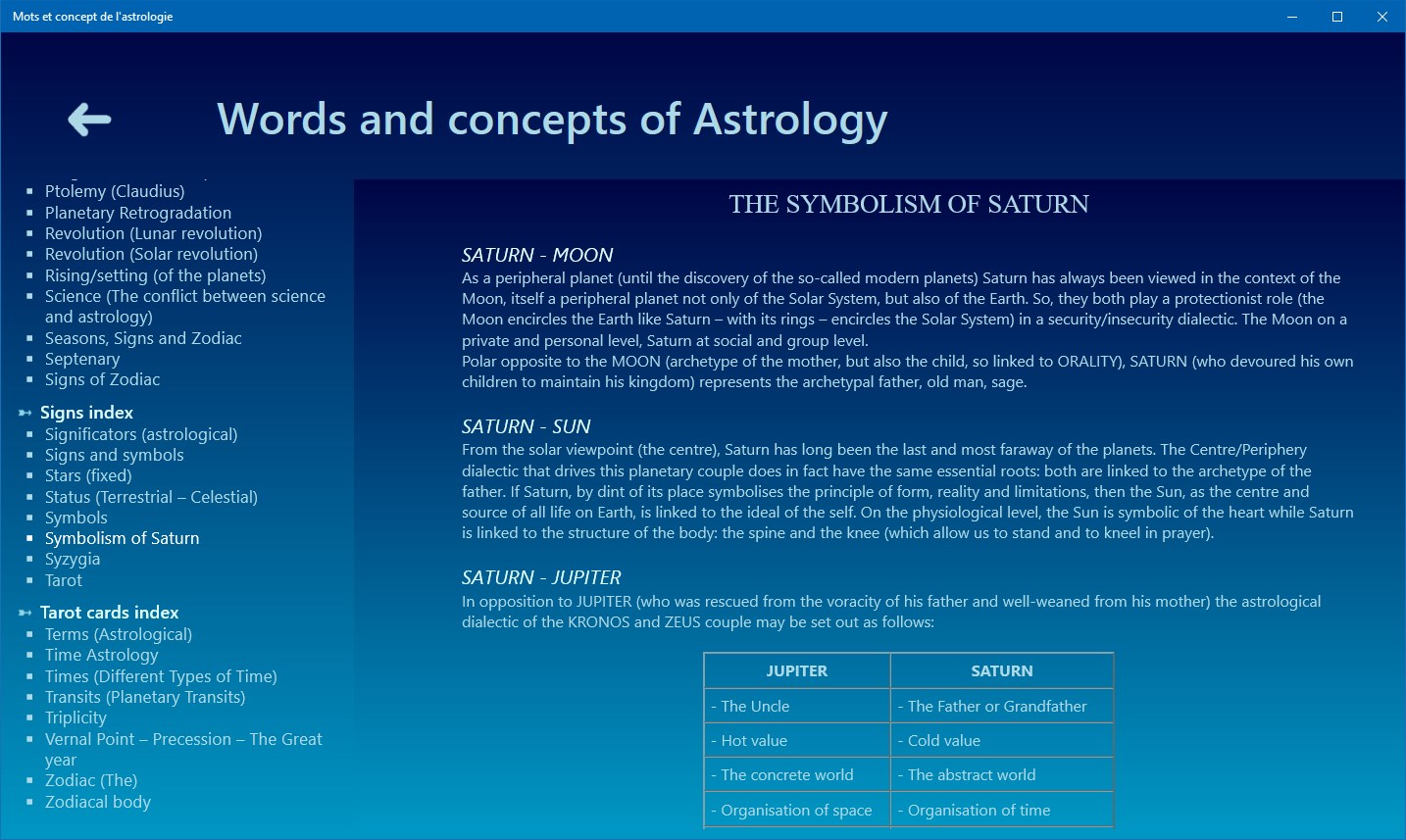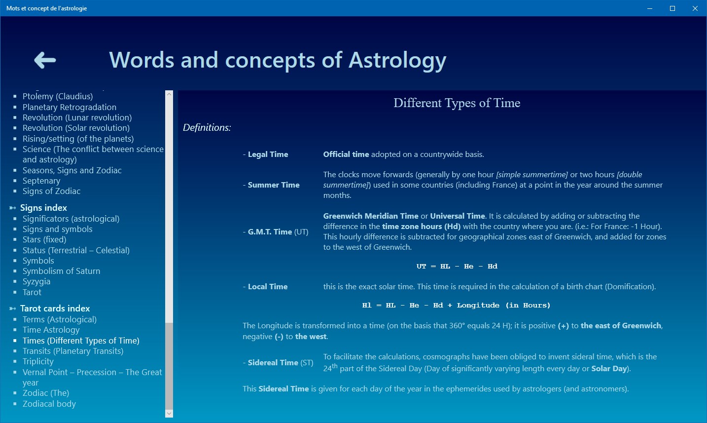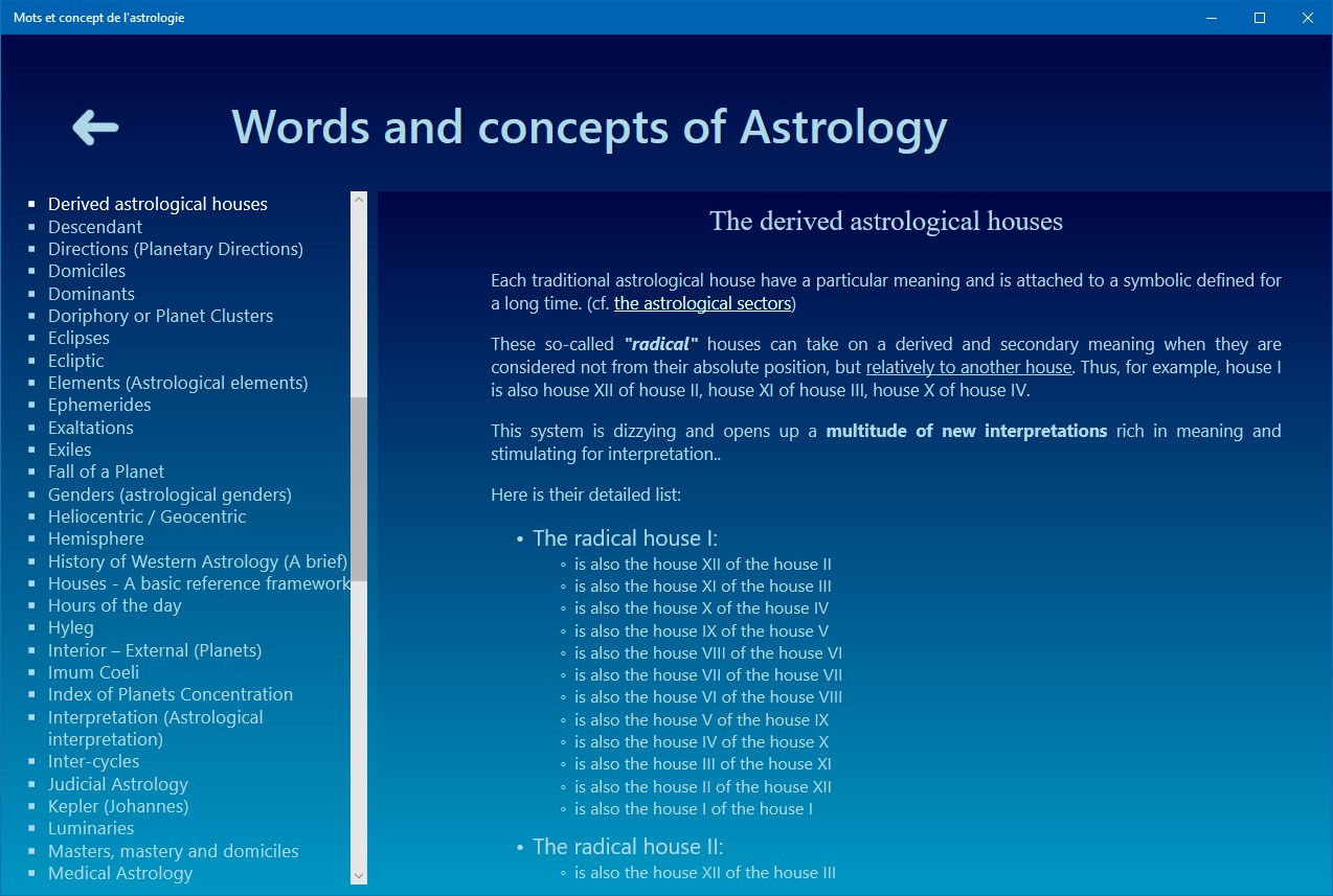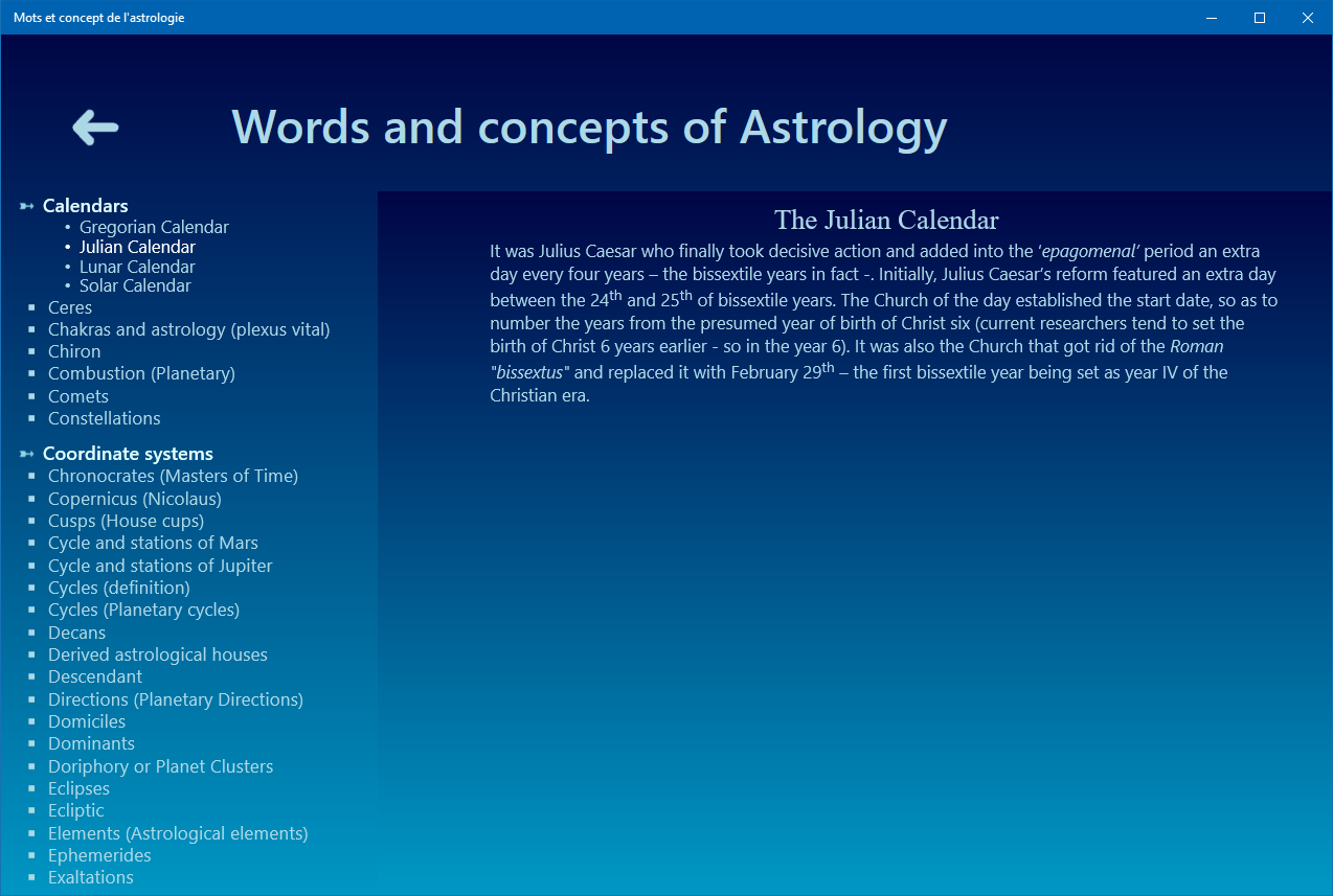 Aestheric Archetypes of the astrological signs, Ages of life and the chronocracy, Angels, Alchochoden, Anaret, Anaretic degree(s), Angular (houses), Angular relationships of Jupiter and Saturn, Antisces and anti-antisces, Aphelion – Perihelion, Application - Separation of Astrological Aspects, Ascendant, Astral Affinities, Astrological Aspects, Austral signs, Axis - Houses - Domification, Biorhythms, Birth Charts, Boreal signs, Cadents (houses), Calculating the astrological dominant, Gregorian Calendar, Egyptian Sothic Calendar, Julian Calendar, Lunar Calendar, Solar Calendar, Celestial pole, Ceres, Chakras and astrology (plexus vital), Chiron, Combustion (Planetary), Comets, Constellations, Consultation (astrological), Astronomical Coordinates, Ecliptic Coordinates, Equatorial Coordinates, Geographic Coordinates, Chronocrates (Masters of Time), Copernicus (Nicolaus), Cusps (House cups), Cycle and stations of Mars, Cycle and stations of Jupiter, Cycles (definition), Cycles (Planetary cycles), Decans, Derived astrological houses, Descendant, Directions (Planetary Directions), Dignity, Diurnal (birth - theme), Domiciles, Dominants, Doriphory or Planet Clusters, Eclipses, Ecliptic, Elements (Astrological elements), Ephemeris, Exaltations, Exiles, Fall of a Planet, Genders (astrological genders, Geomancy, Geometric figures of the natal chart, Heliocentric / Geocentric, Hemisphere, History of Western Astrology (A brief), Houses, Hours of the day, Hyleg, Interior – External (Planets), Imum Coeli, Index of Planets Concentration, Interpretation (Astrological interpretation), Inter-cycles, Judicial Astrology, Karma and astrology, Kepler (Johannes), Learning and studying Astrology, Luminaries, Masters, mastery and domiciles, Medical Astrology, Meton cycle, Midheaven, Midpoints, Mutual reception, Nocturnal birth (theme), North Knot – South Knot, Numerology, Nutation, Orbs (Aspects Orbs), Orbits (Planetary Orbits), Parts (Arabic or astrological Parts), Peregrine Planets, Perihelion - Aphelion, Phases of the Moon, Planets, Sun, Moon, Mercury, Venus, Mars, Jupiter, Saturn, Uranus, Neptune, Pluto, The Black Moon, Medical Astrology, Predictions (Astrological forecasts and predictions), Profections (Technique of), Progressions (Technique of), Converse progressions, Ptolemy (Claudius), Planetary Retrogradation, Reception (single), Revolution (Lunar revolution), Revolution (Solar revolution), Right Ascension, Rising/setting (of the planets), Science (The conflict between science and astrology), Seasons, Signs and Zodiac, Septenary, Sidereal year, Signs of Zodiac, Aries, Taurus, Gemini, Cancer, Leo, Virgo, Libra, Scorpio, Sagittarius, Capricorn, Aquarius, Pisces, Sidereal time, Significators (astrological), Signs and symbols, Stars (fixed), Status (Terrestrial – Celestial), Successor (houses), Symbols, Symbolism of Saturn, Symbolism of uranus, Symbolism of neptune, Symbolism of pluto, Synodique lunation, Syzygia, Tarot, The Fool (the Beggar), Arcana 1 - The Juggler, Arcana 2 - The High Priestess, Arcana 3 - The Empress, Arcana 4 - The Emperor, Arcana 5 - The Pope, Arcana 6 - The Lovers, Arcana 7 - The Chariot, Arcana 8 - Justice, Arcana 9 - The Hermit, Arcana 10 - The Wheel of Fortune, Arcana 11 - Fortitude, Arcana 12 - The Hanged Man, Arcana 13 - Death, Arcana 14 - Temperance, Arcana 15 - The Devil, Arcana 16 - The Tower, Arcana 17 - The Stars, Arcana 18 - The Moon, Arcana 19 - The Sun, Arcana 20 - Judgement, Arcana 21 - The World, Tarot tirages, Terms (Astrological), Time Astrology, Times (Different Types of Time), Time Zones, Transits (Planetary Transits), Triplicity, Trigonocracy, Vernal Point – Precession – The Great year, Vertex (The), Yod (The), Zenith (The), Zodiac, Zodiacal body