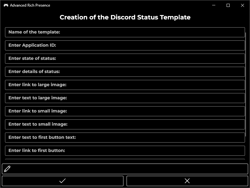 In this application you can easily create the templates for your Discord Rich Presence statuses, and with single touch of the button change the current status.