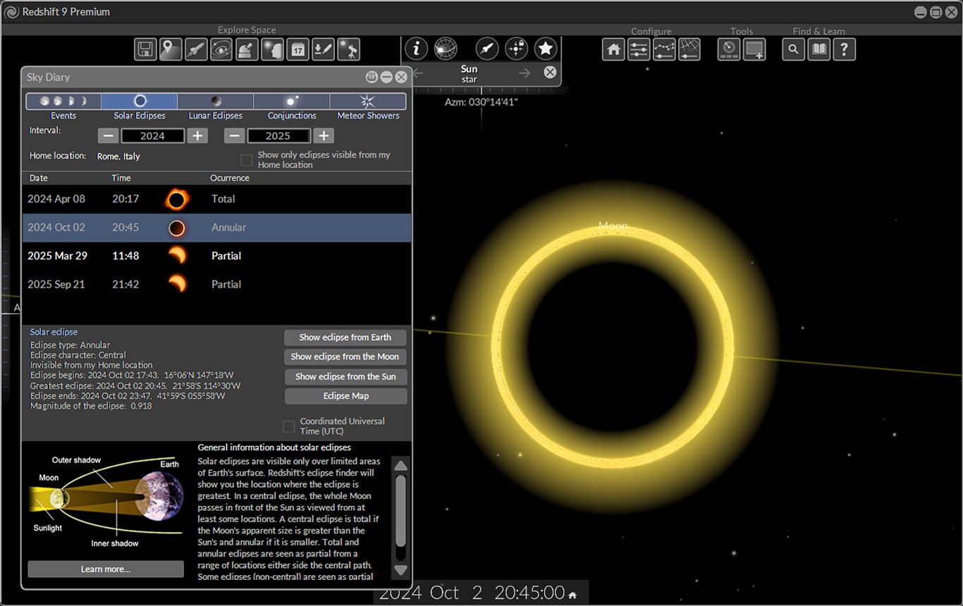 - Comprehensive calendar of astronomical events with special lists for solar and lunar eclipses, conjunctions and meteor showers