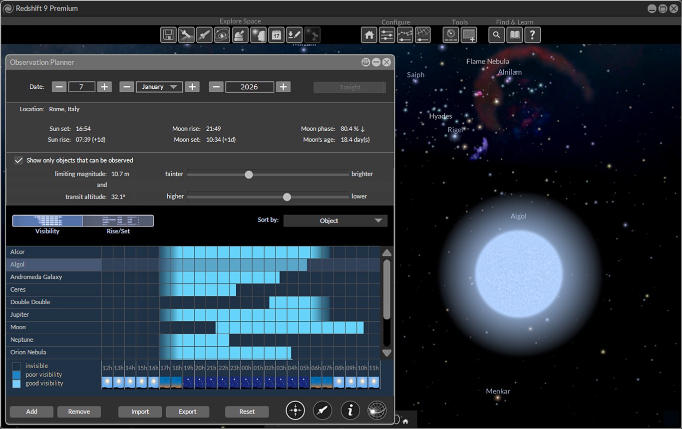 - Convenient observation planner with clear visibility information and with integrated management of your personal favorites