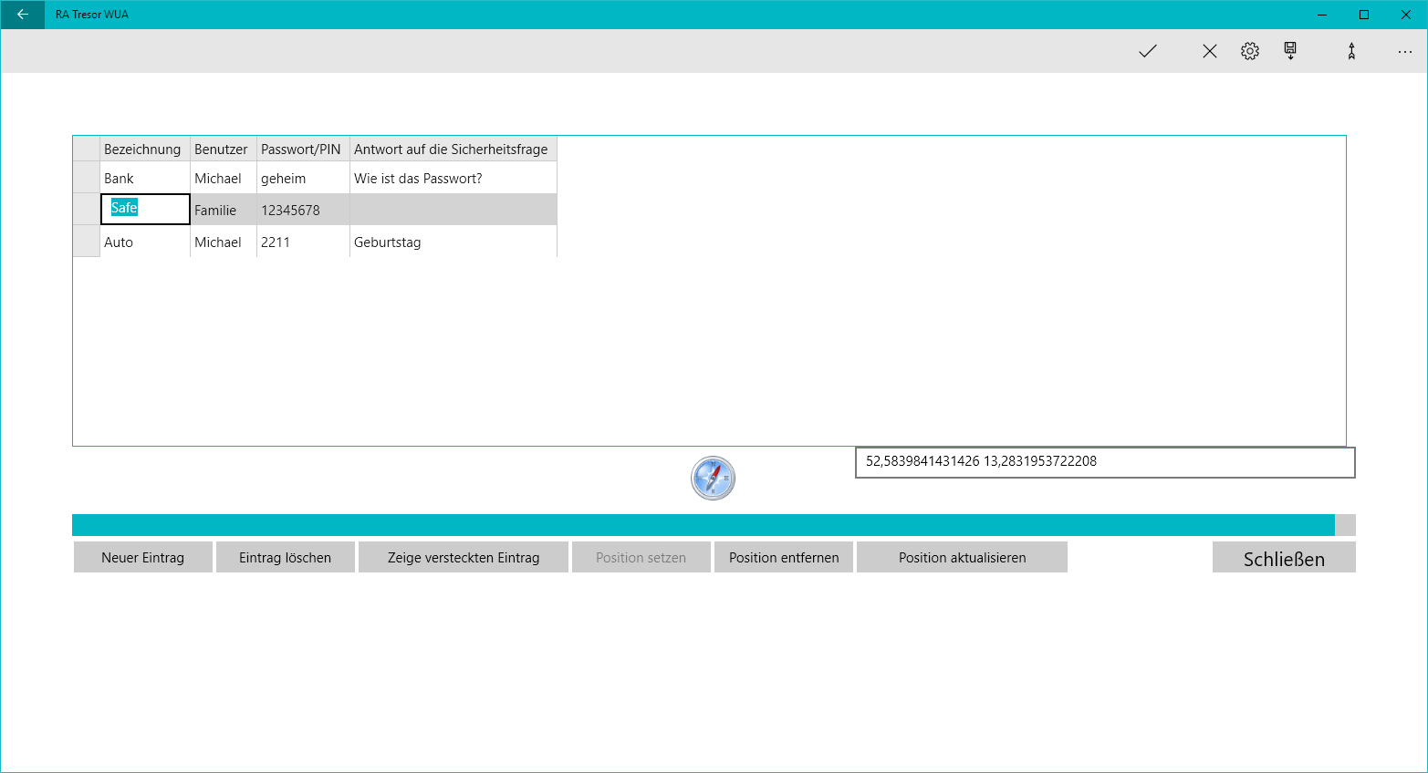 Ein Programm zum Speichern von vertraulichen Zugangsdaten. Auf Wunsch können diese Daten nur an einer bestimmten GPS Position angezeigt werden (z.B. vor einem Safe oder einem Bankautomaten). Es wird modernste Verschlüsselungstechnologie verwendet (AES 256)